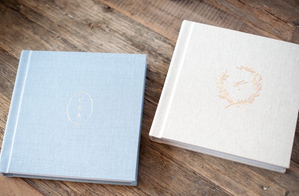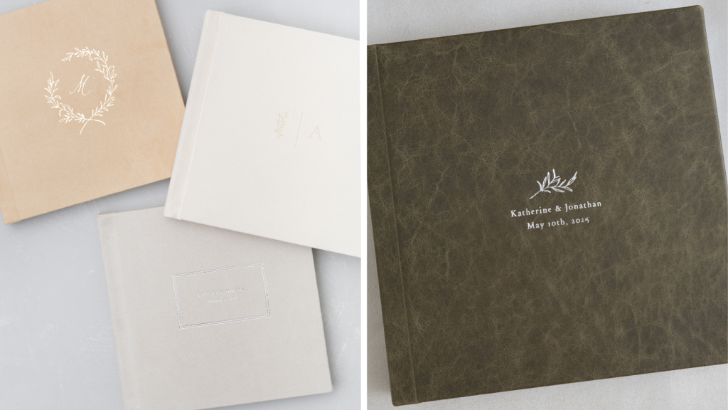 For my own wedding album, my husband and I selected a distressed leather cover with our names embossed in a pretty calligraphy font that matched the font on our guestbook. Overall, the goal is to create something that feels timeless and true to who you are.