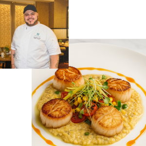 Dish: Pan-seared sea scallops set atop creamy hominy grits, finished with local corn succotash and a fragrant drizzle of house made chili oil.