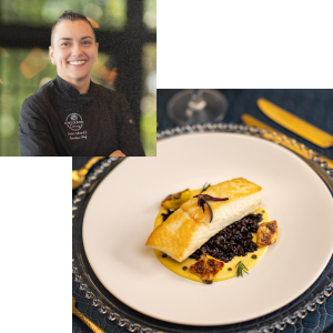 Dish: Pan seared halibut, forbidden rice risotto, roasted sunburst squash, truffle corn milk, corn husk ash oil and micro seagrass.