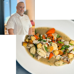 Dish: Chicken and dumplings, made of potato gnocchi, chanterelle mushrooms, black-eyed peas, lemon chicken velouté and cornbread croutons.