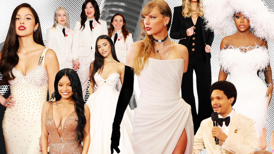 Taylor Swift wearing a white gown “Hits Different.” The dramatic black gloves, layered jewelry, and dramatic leg slits are some things we certainly can see brides adopting in their 2024 weddings. Not only did Swift walk away from the evening with an Album of the Year win, but also undeniably one of the best dressed on the carpet.