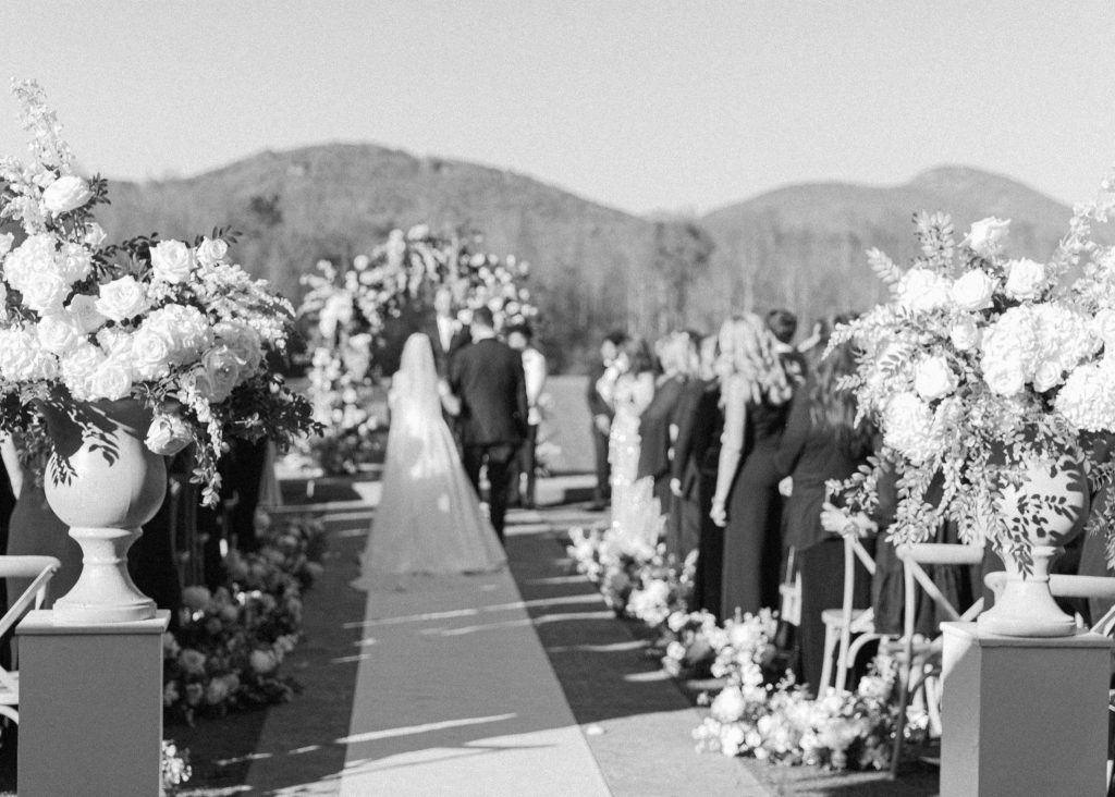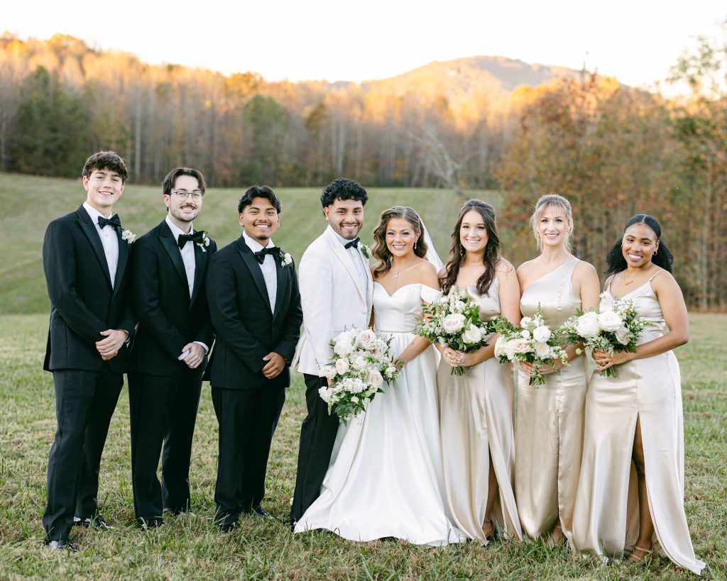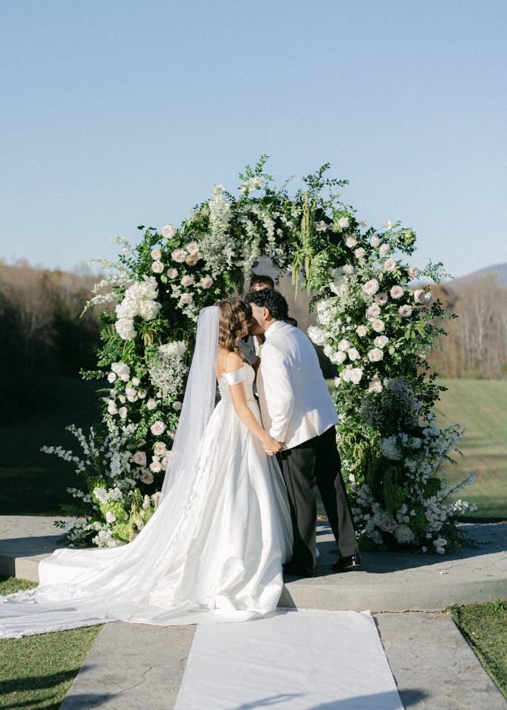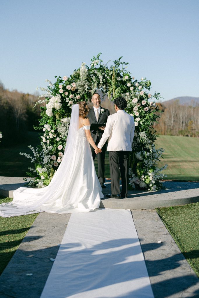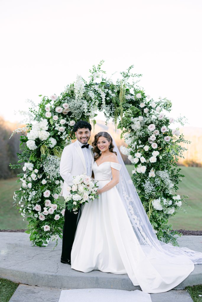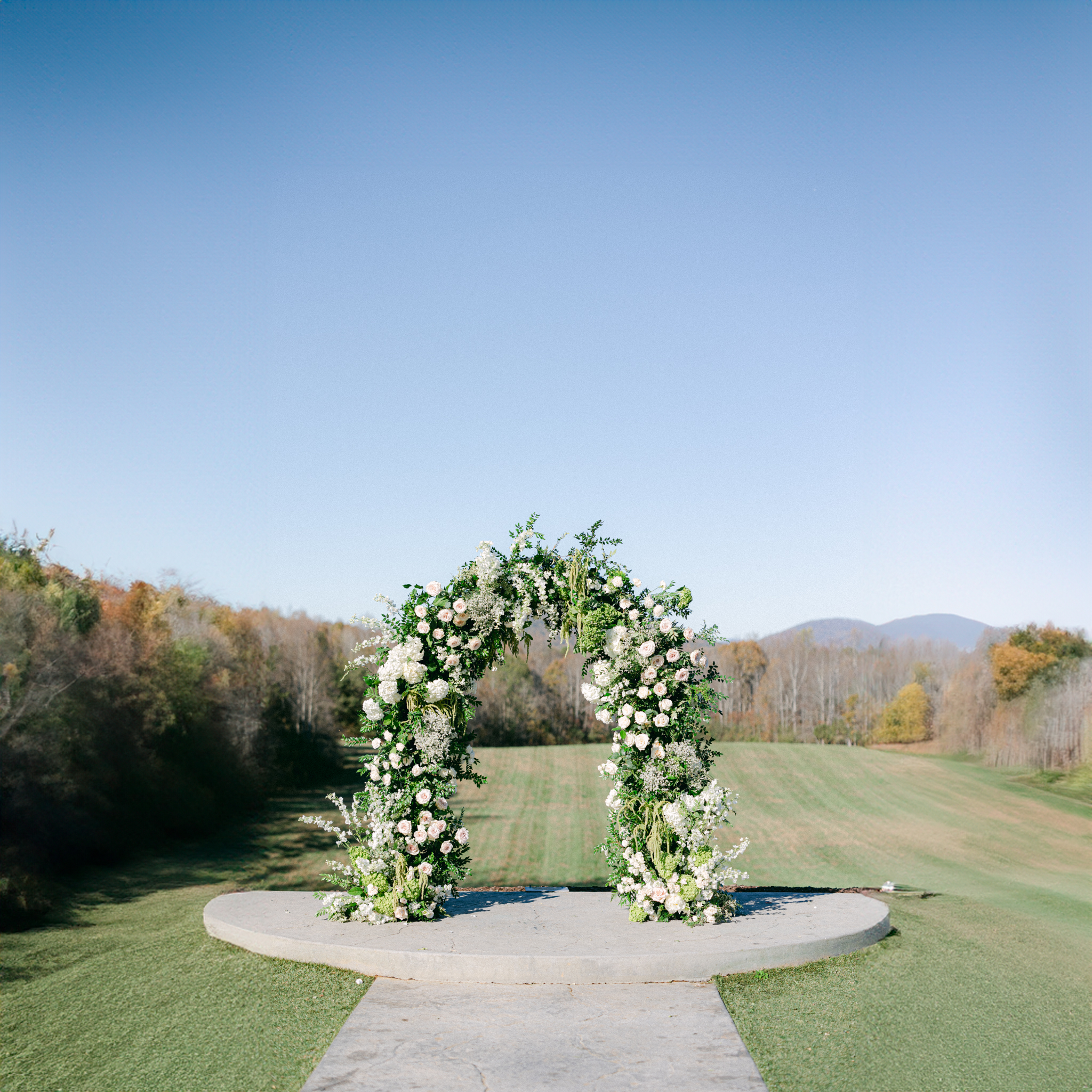 Allison and Erik’s celebration took place at The Meadows at Mossy Creek, perched atop North Georgia’s beautiful mountainscape. The couple’s ceremony took place beneath a sweeping floral arch by Flux Floral Design, surrounded by 300 guests dressed in classic black. Overlooking the same mountain range where they had spent many afternoons hiking and talking about their future, Allison and Erik exchanged vows in a heartfelt and faith-driven ceremony.