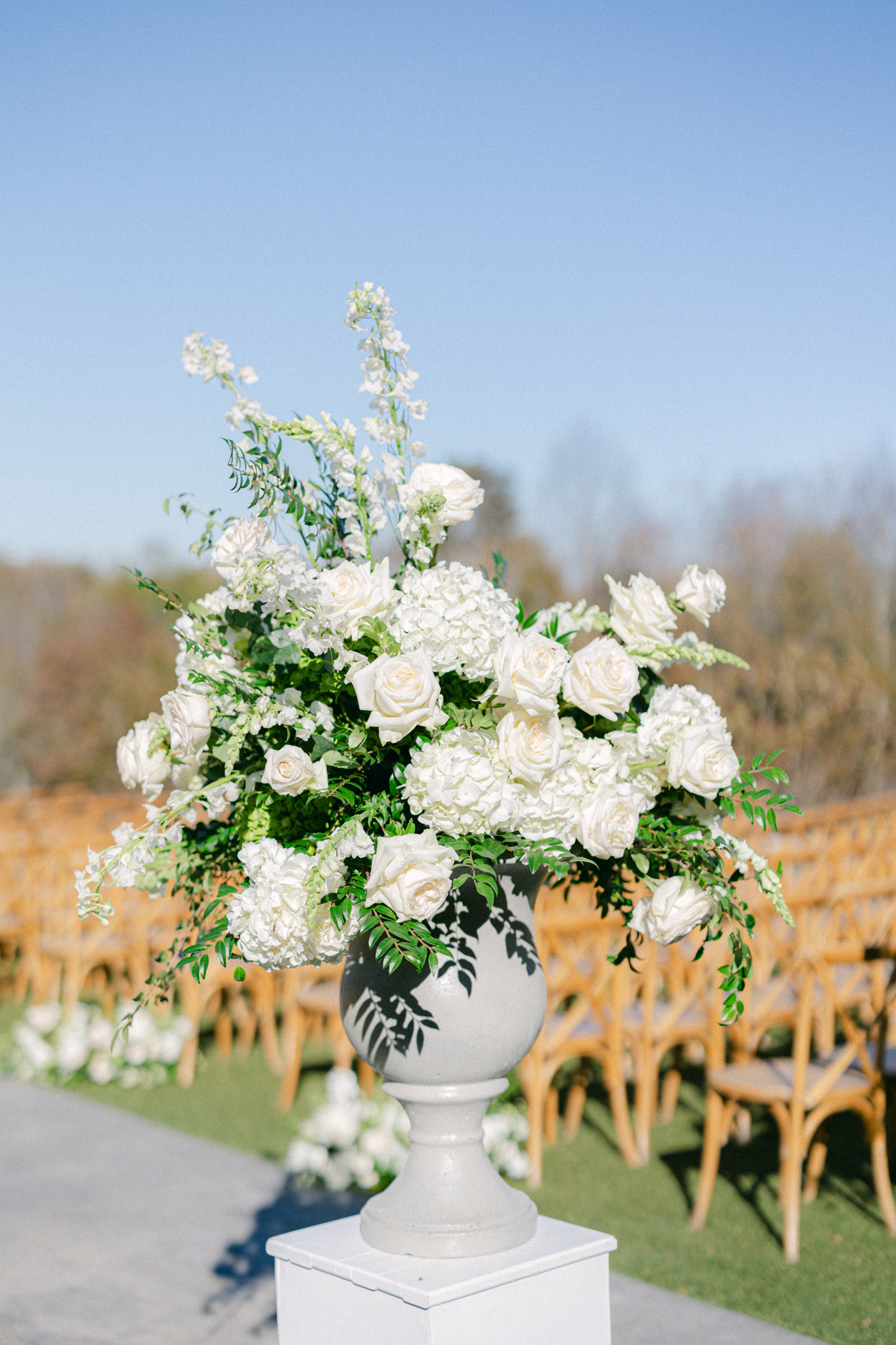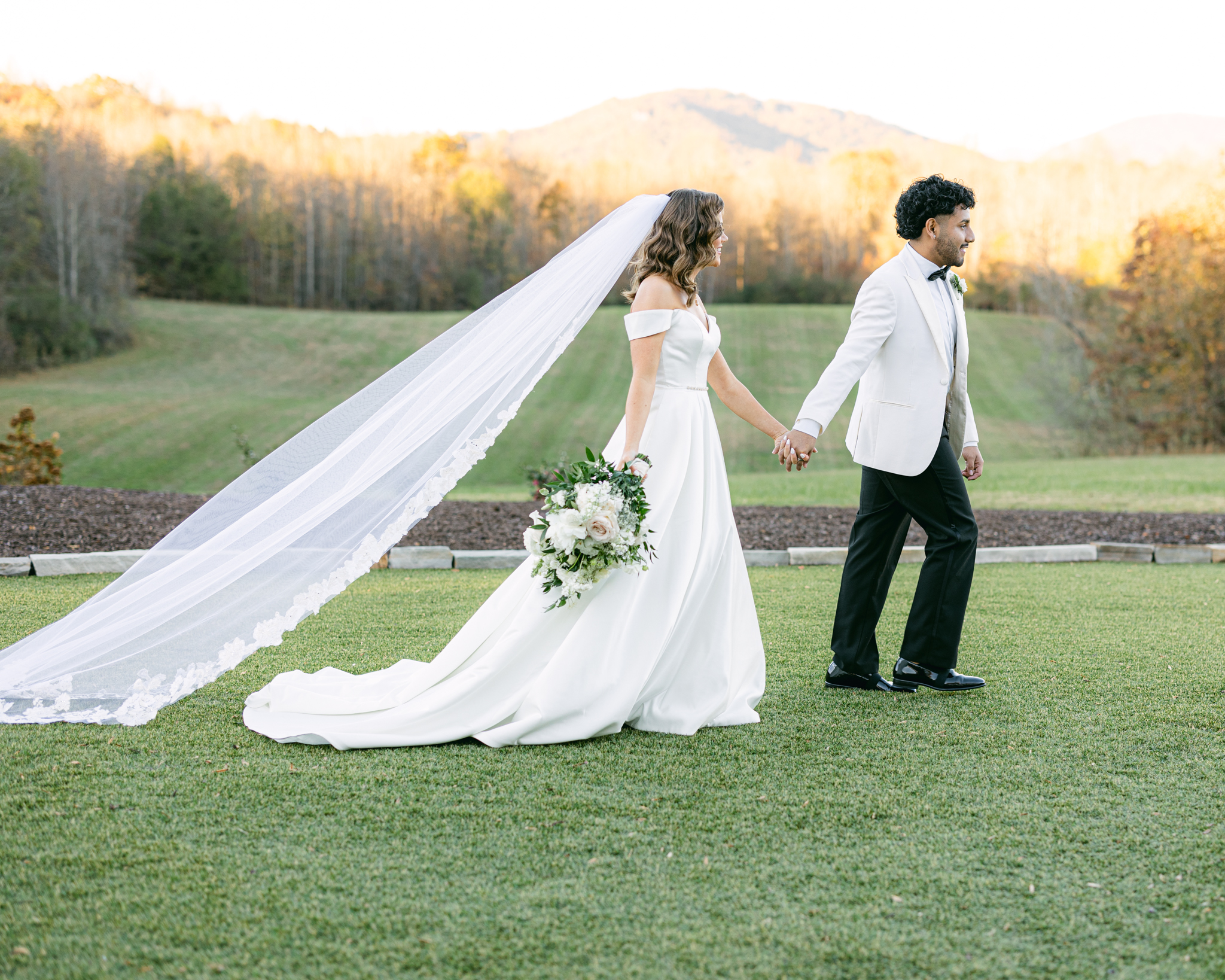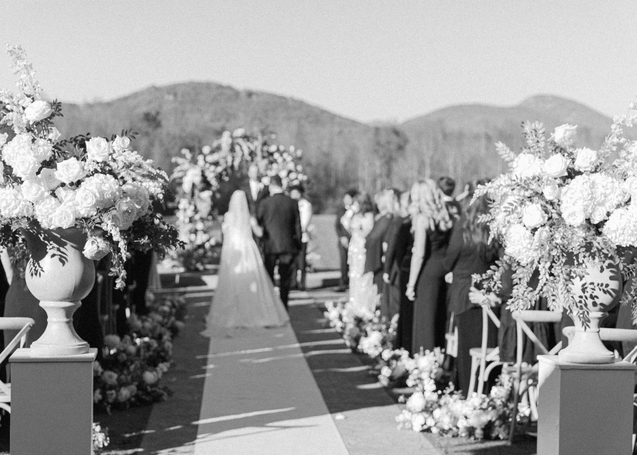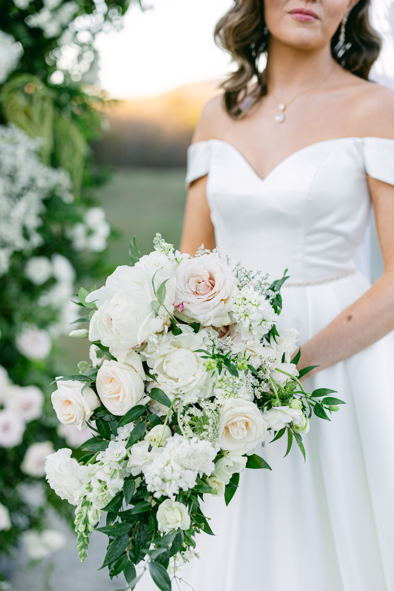 Allison and Erik’s celebration took place at The Meadows at Mossy Creek, perched atop North Georgia’s beautiful mountainscape. The couple’s ceremony took place beneath a sweeping floral arch by Flux Floral Design, surrounded by 300 guests dressed in classic black. Overlooking the same mountain range where they had spent many afternoons hiking and talking about their future, Allison and Erik exchanged vows in a heartfelt and faith-driven ceremony.