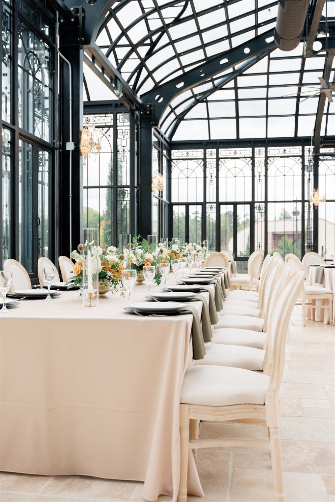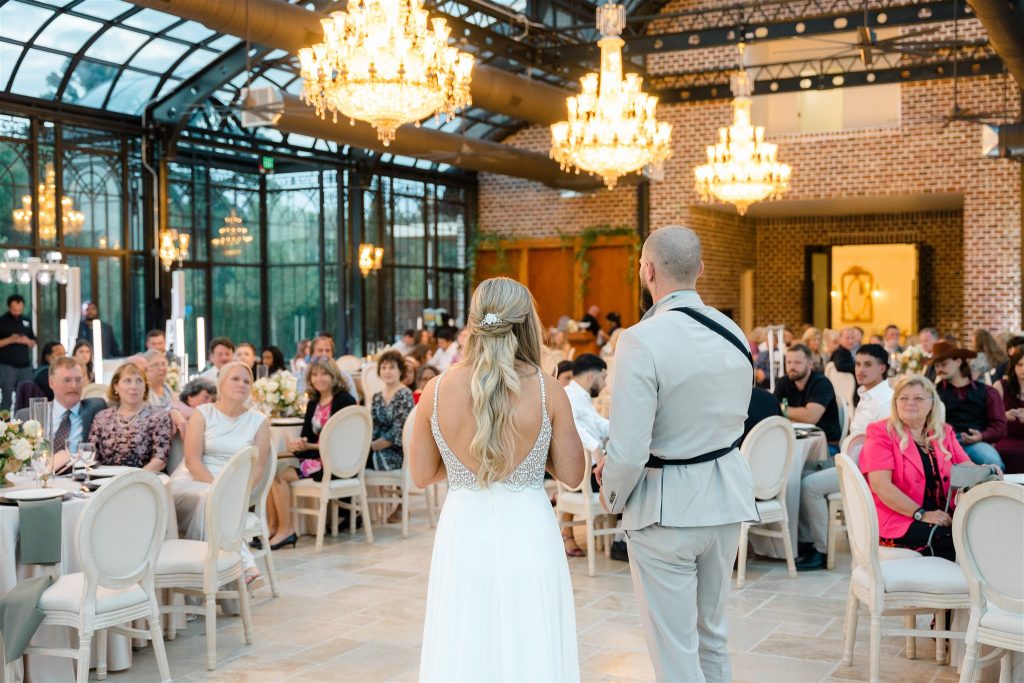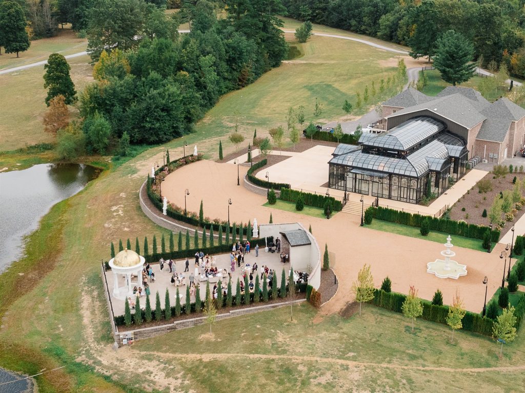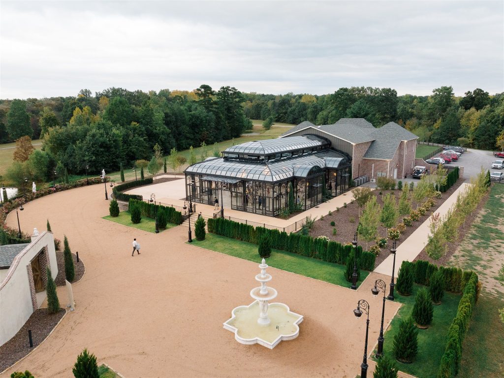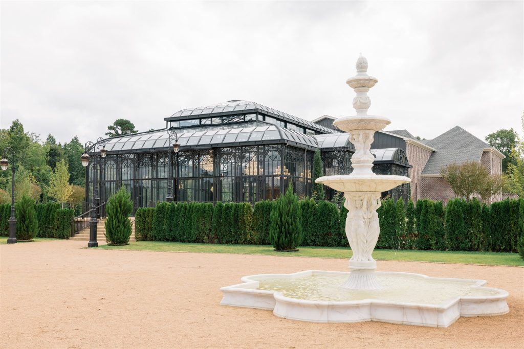 For this special celebration, the couple chose The Conservatory at Blackberry Ridge, a new addition to the Blackberry Ridge property in North Georgia. With its soaring glass walls, crystal chandeliers and French chateau–inspired architecture, the Conservatory is equal parts timeless and modern. From the wrought-iron accents to the European-style landscaping, every detail feels like it belongs in the French countryside.