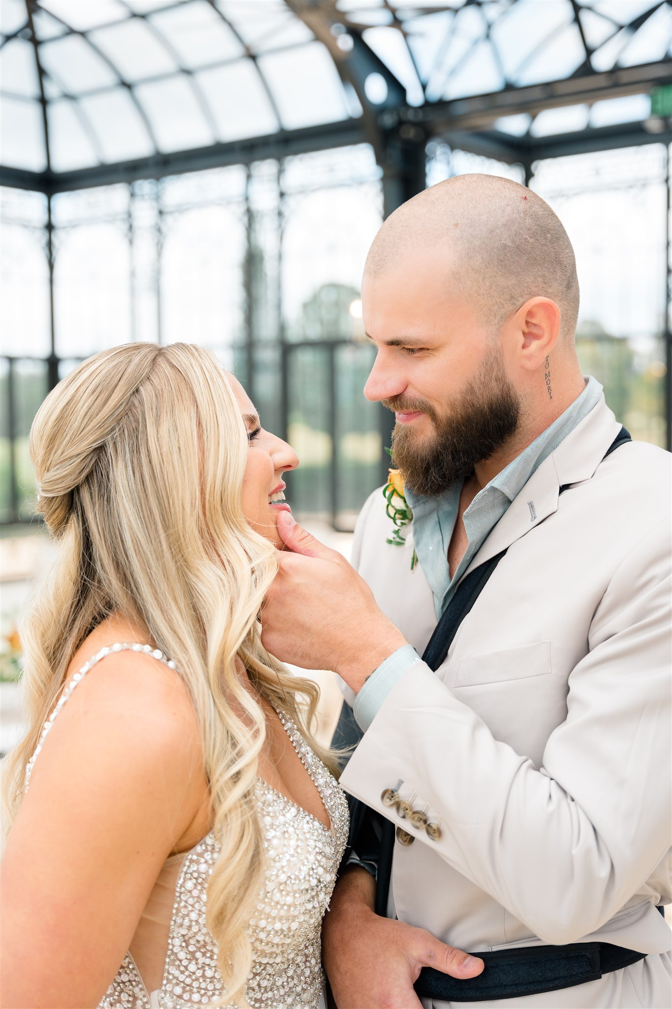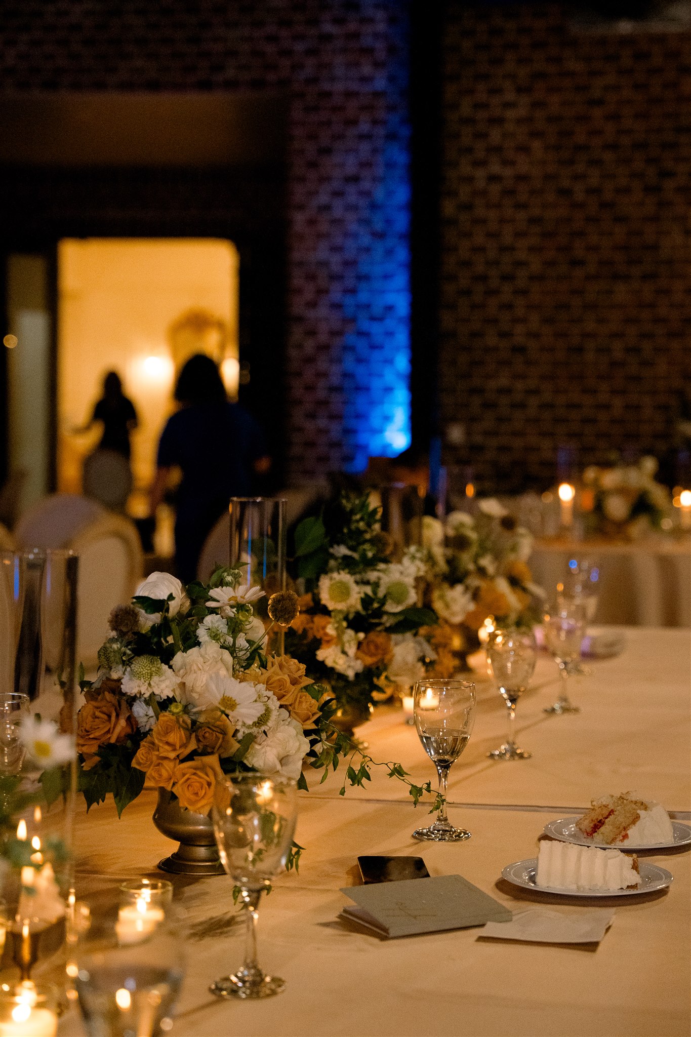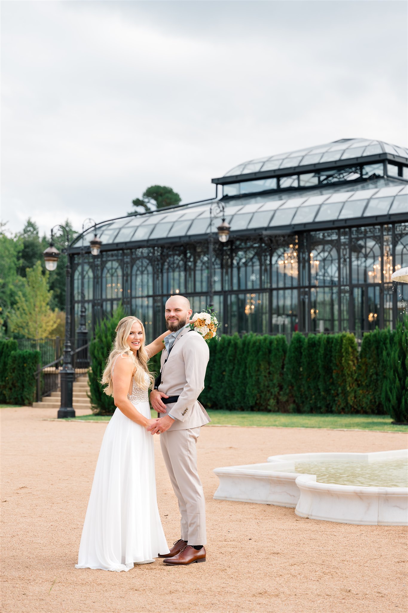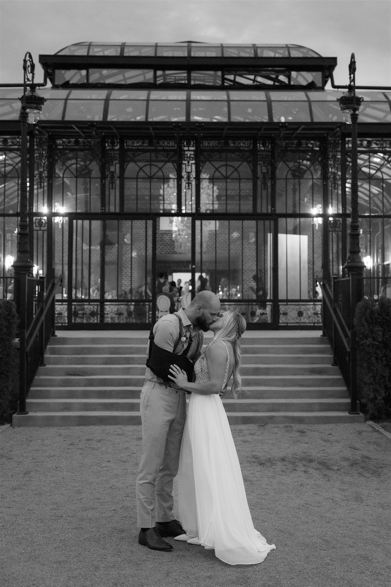 As the sun set, the celebration continued with a candlelit dinner inside the Conservatory. Warm-toned florals paired with champagne linens and dark wood chargers gave the glass hall a cozy glow. This color palette and decor softened the grandeur of the space, while keeping the evening true to the couple’s elegant, yet inviting vision. Heartfelt toasts and an evening of dancing carried the celebration into the night, weaving together the intimacy of their elopement with the joy of community.