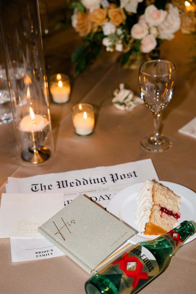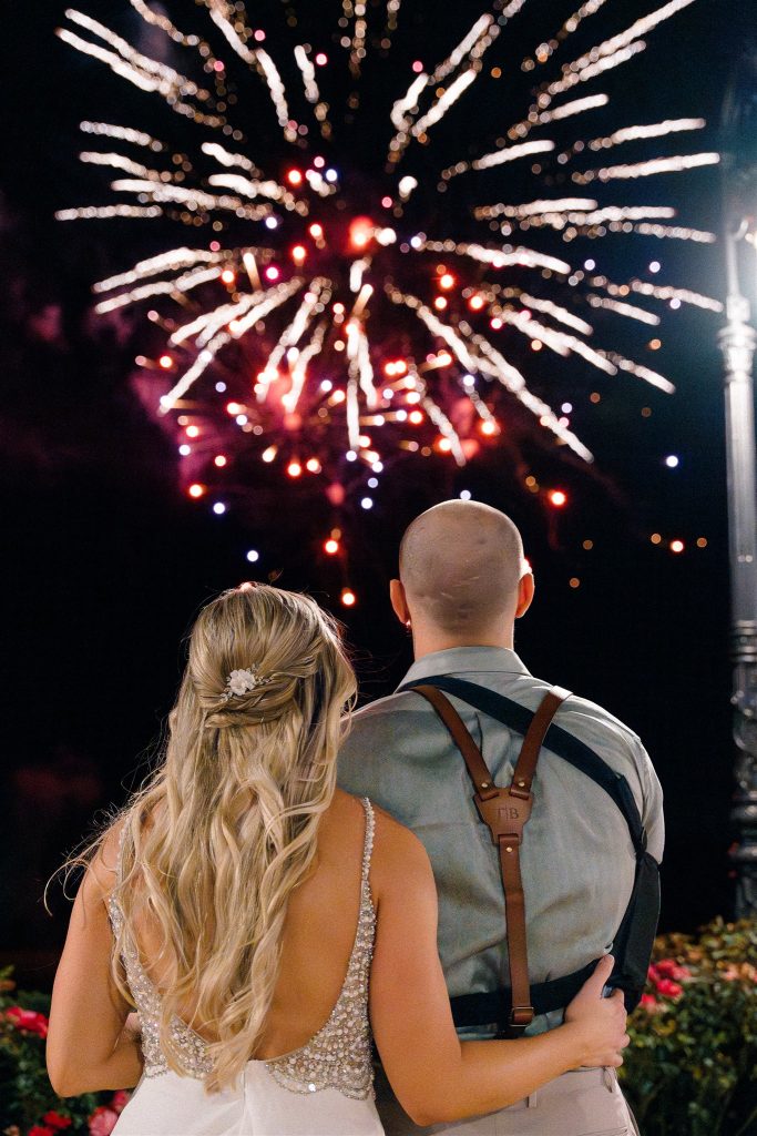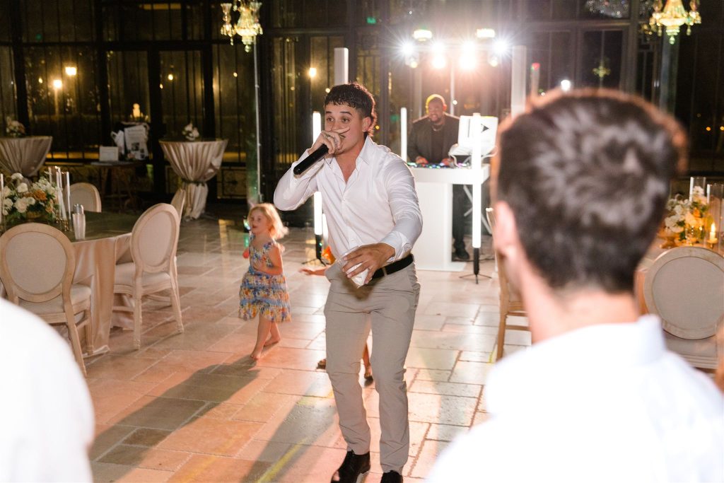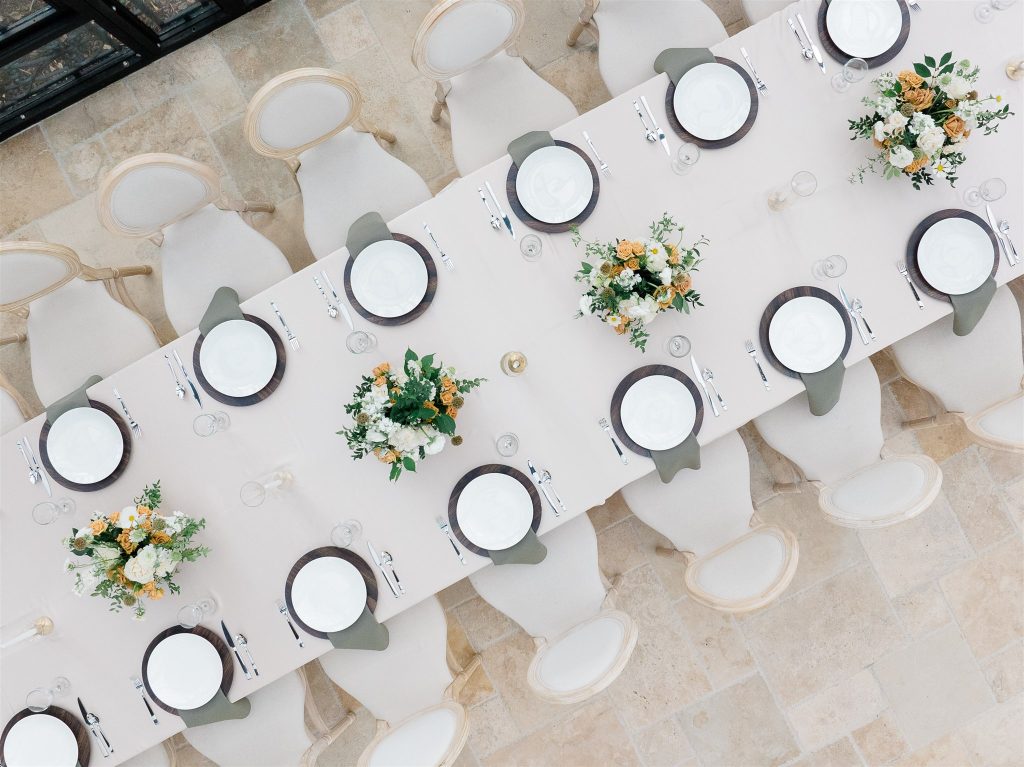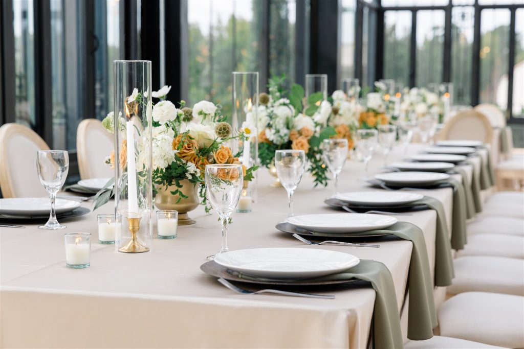 As the sun set, the celebration continued with a candlelit dinner inside the Conservatory. Warm-toned florals paired with champagne linens and dark wood chargers gave the glass hall a cozy glow. This color palette and decor softened the grandeur of the space, while keeping the evening true to the couple’s elegant, yet inviting vision. Heartfelt toasts and an evening of dancing carried the celebration into the night, weaving together the intimacy of their elopement with the joy of community.