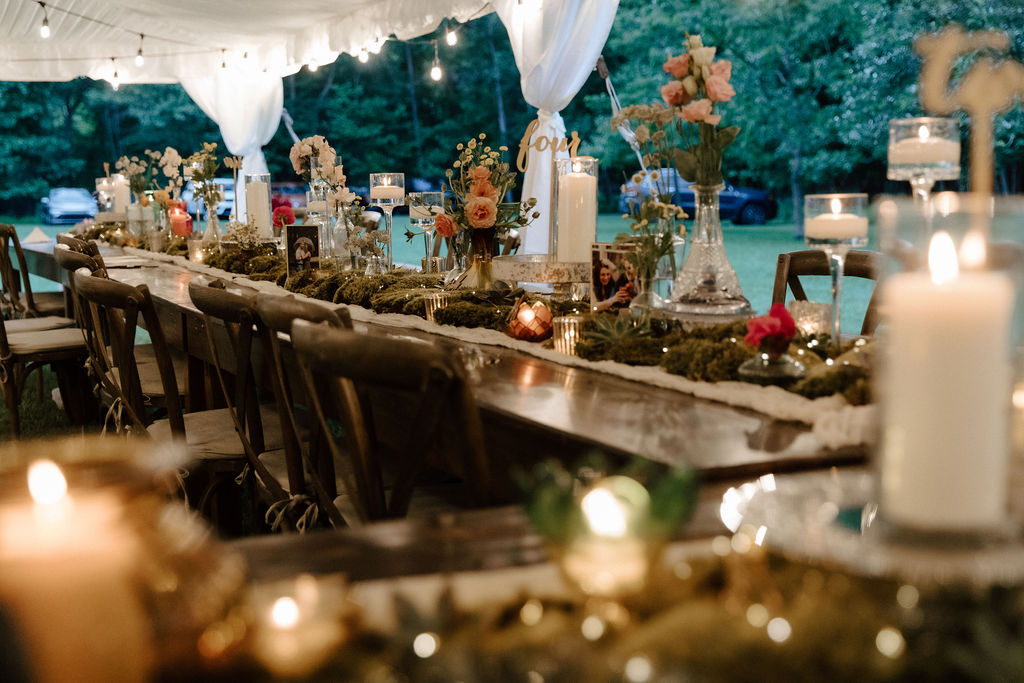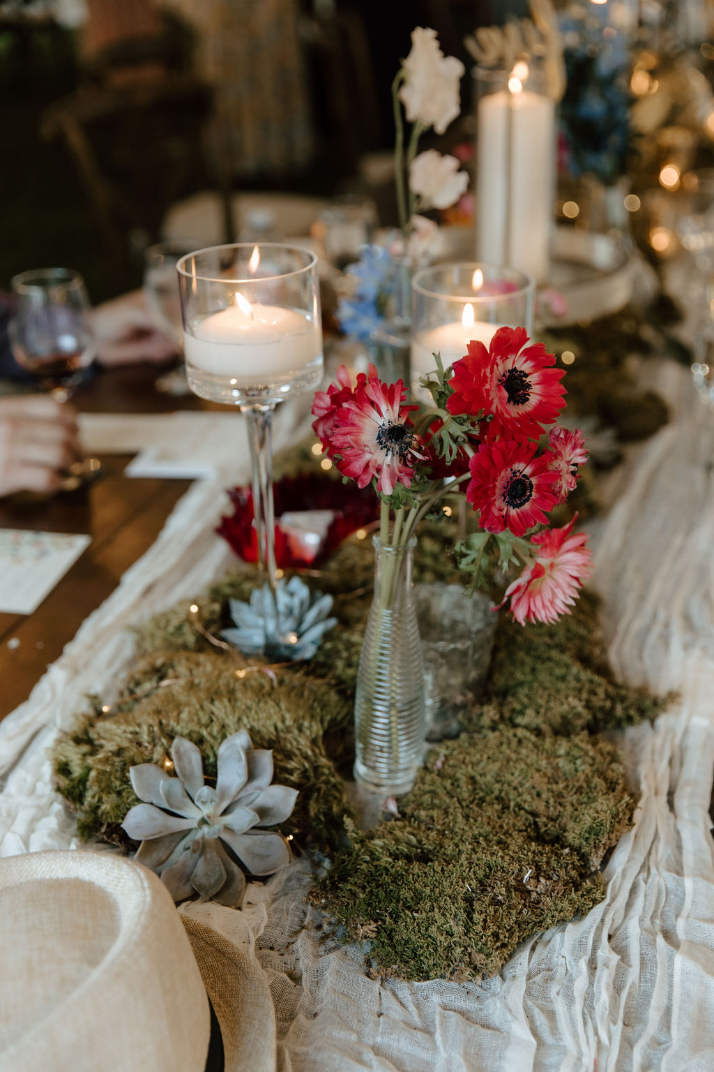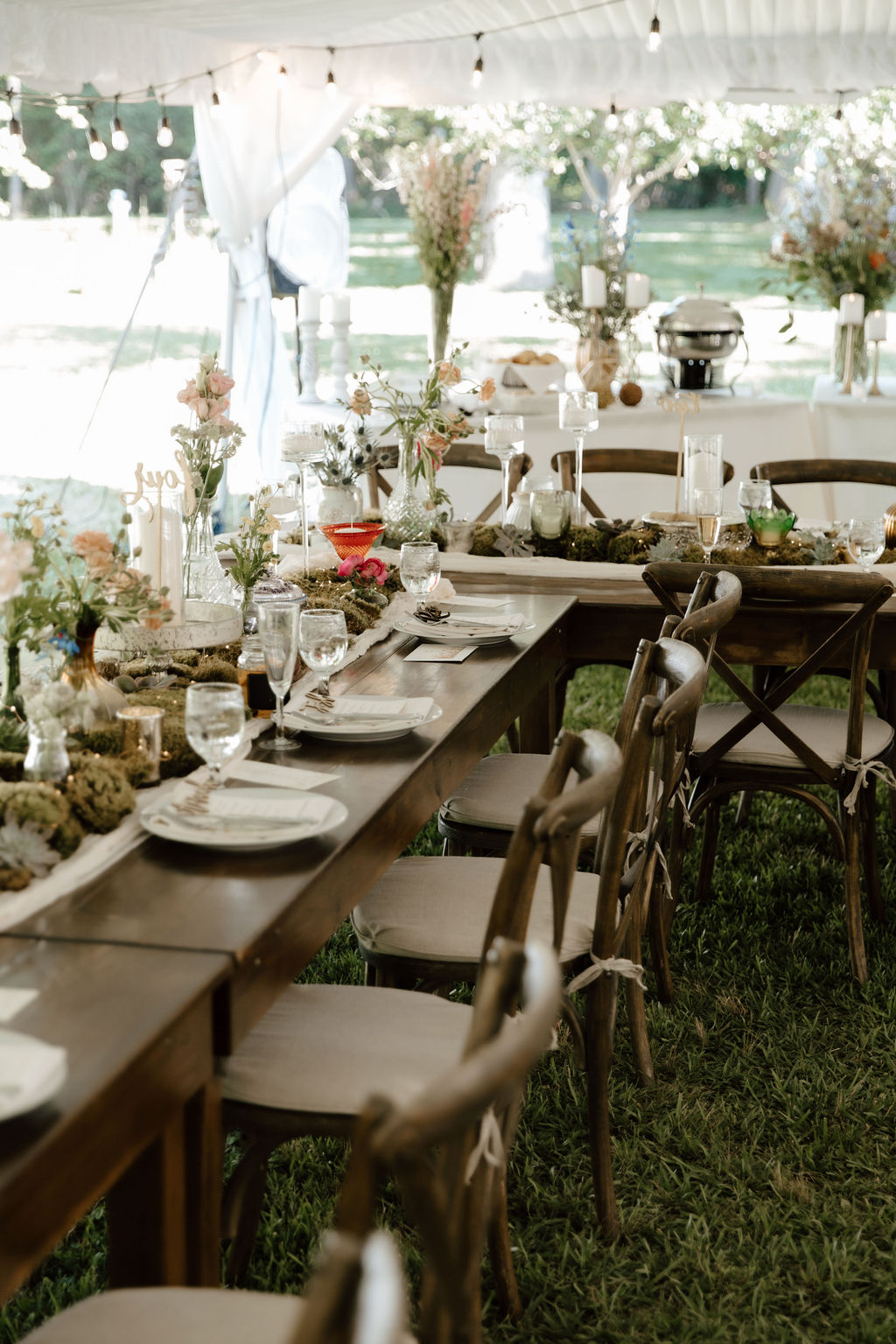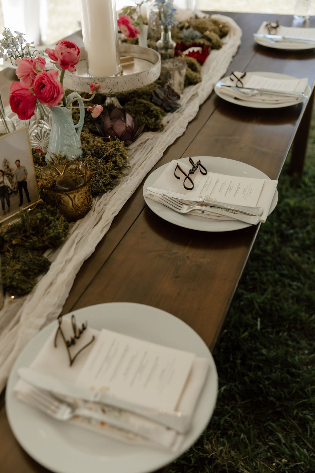 The setting couldn’t have been more fitting. Autumn, who jokes that she secretly wishes she could live on a homestead while continuing her career in medicinal chemistry, found the backyard celebration perfectly aligned with her spirit. Leaning into the idea of an intimate garden dinner party, she and David invited guests to wear their floral best and don whimsical fascinators. The earthy décor featured thrifted vintage glassware, mossy wildflower arrangements, glowing string lights and framed family photos thoughtfully placed throughout. With florals by her Autumn’s aunt and DIY pieces throughout, the celebration was truly one-of-a-kind.