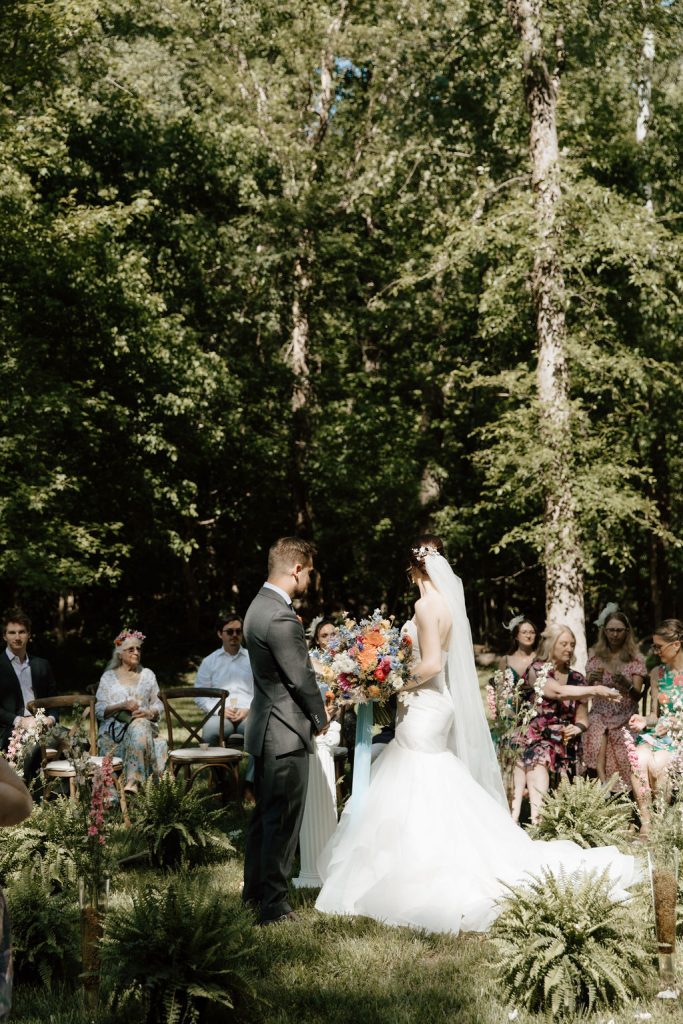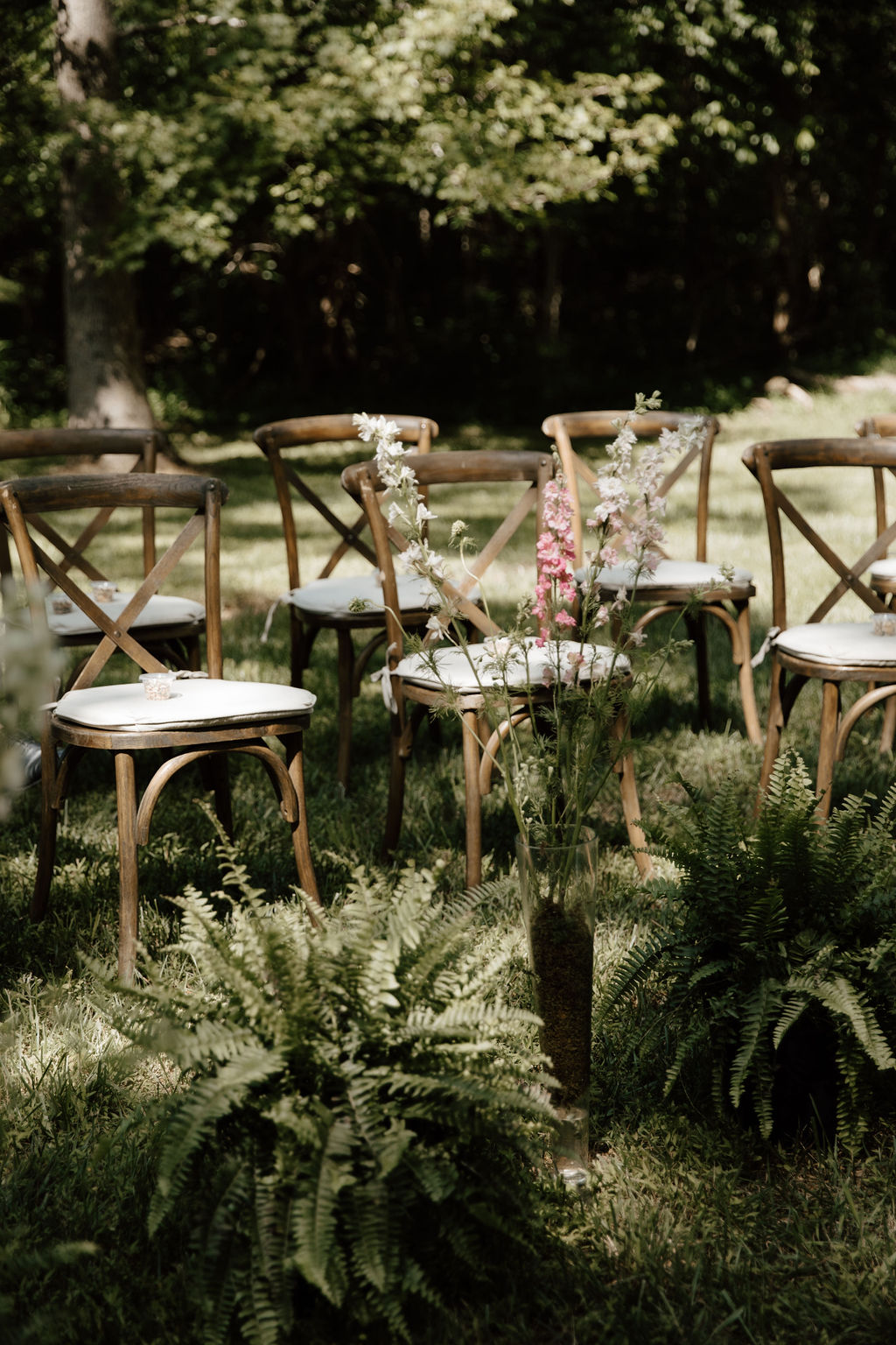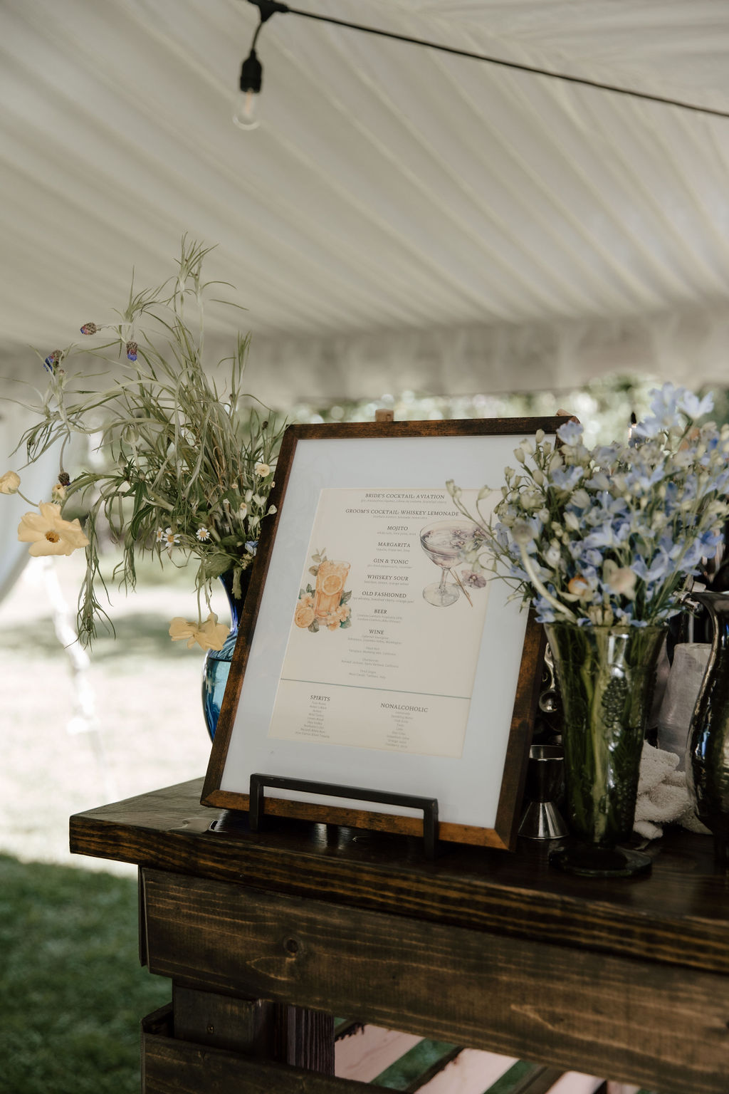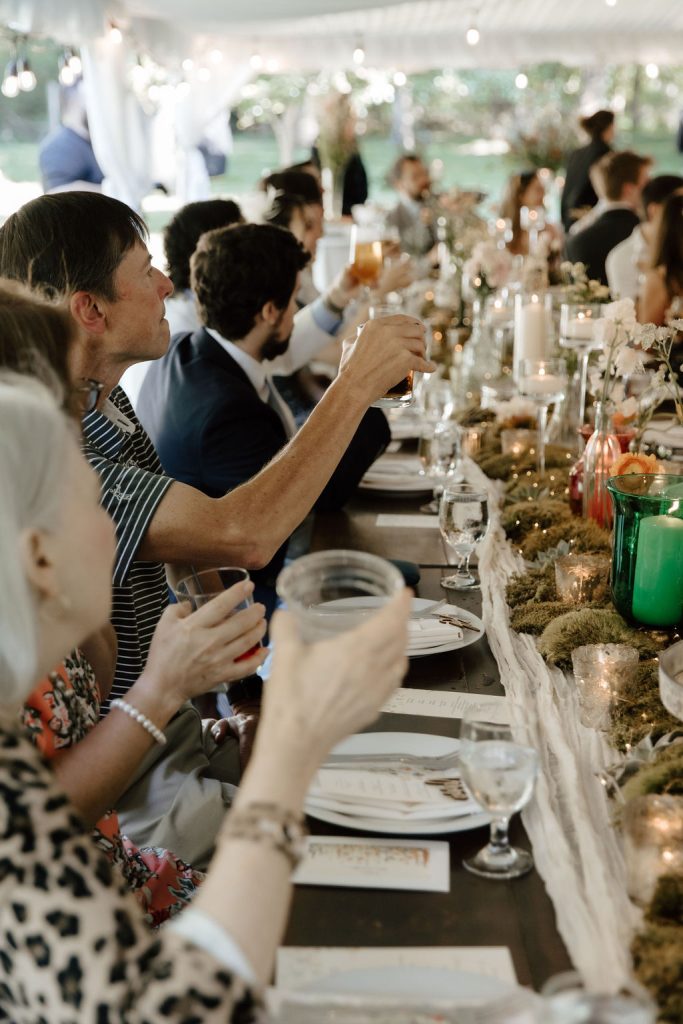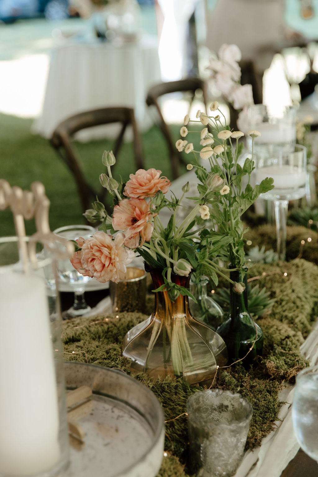 The setting couldn’t have been more fitting. Autumn, who jokes that she secretly wishes she could live on a homestead while continuing her career in medicinal chemistry, found the backyard celebration perfectly aligned with her spirit. Leaning into the idea of an intimate garden dinner party, she and David invited guests to wear their floral best and don whimsical fascinators. The earthy décor featured thrifted vintage glassware, mossy wildflower arrangements, glowing string lights and framed family photos thoughtfully placed throughout. With florals by her Autumn’s aunt and DIY pieces throughout, the celebration was truly one-of-a-kind.