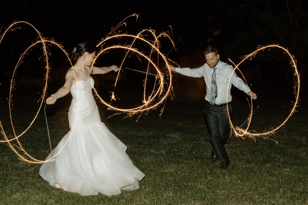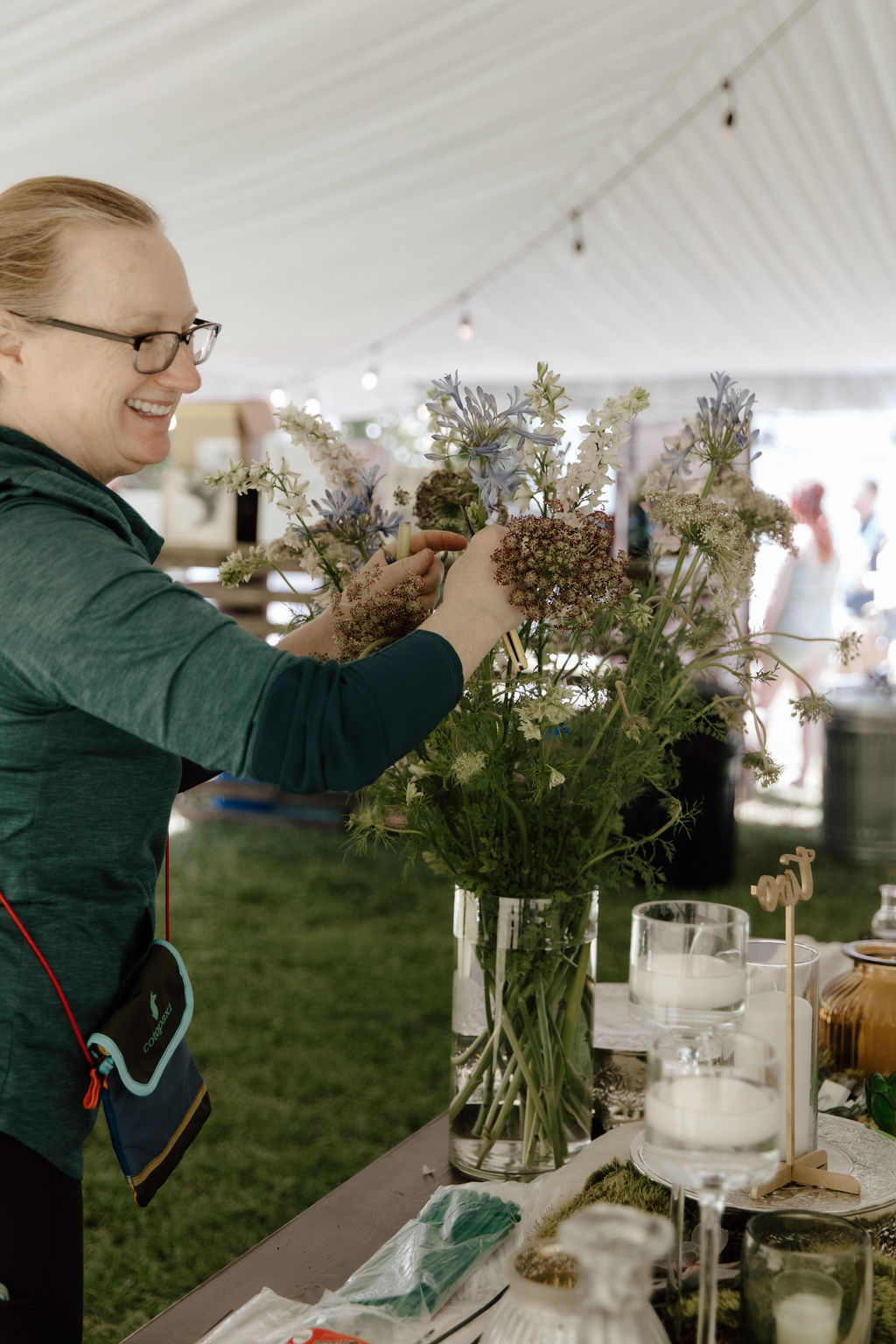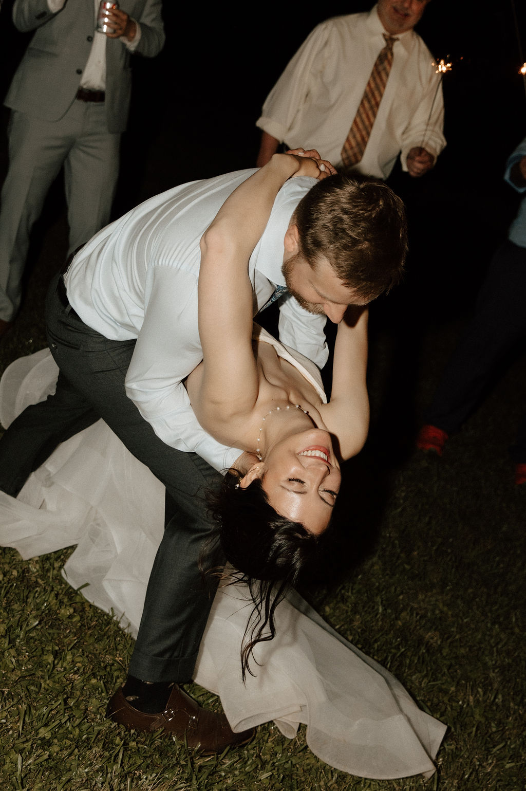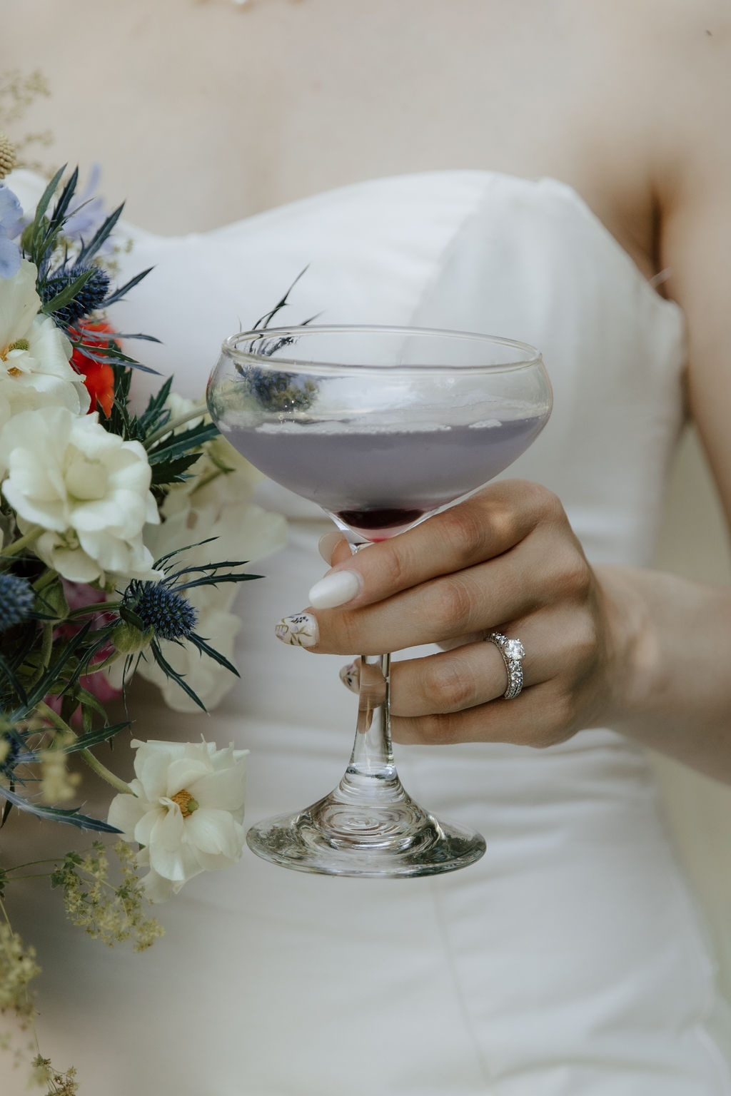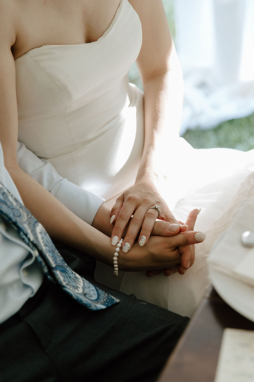 The setting couldn’t have been more fitting. Autumn, who jokes that she secretly wishes she could live on a homestead while continuing her career in medicinal chemistry, found the backyard celebration perfectly aligned with her spirit. Leaning into the idea of an intimate garden dinner party, she and David invited guests to wear their floral best and don whimsical fascinators. The earthy décor featured thrifted vintage glassware, mossy wildflower arrangements, glowing string lights and framed family photos thoughtfully placed throughout. With florals by her Autumn’s aunt and DIY pieces throughout, the celebration was truly one-of-a-kind.