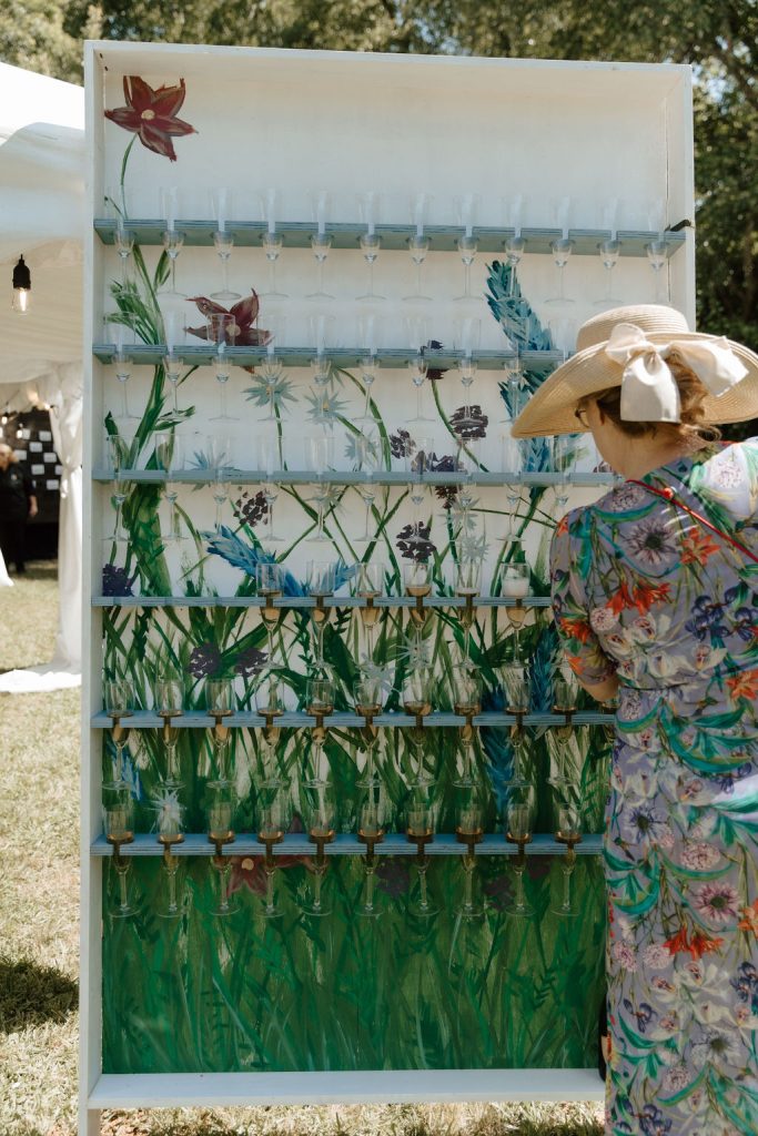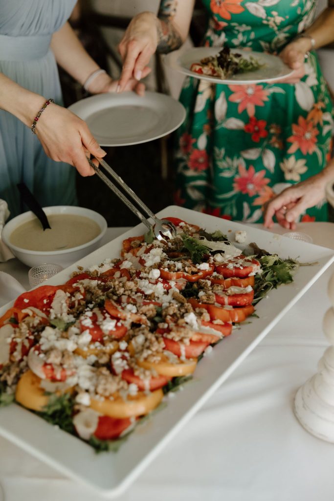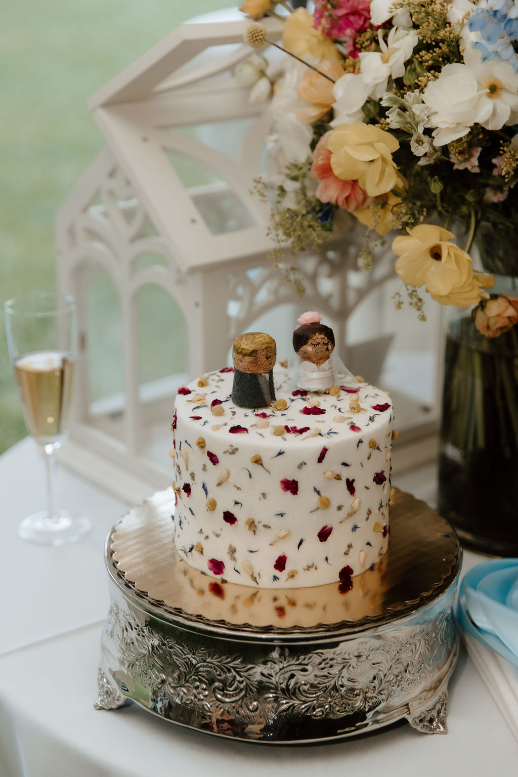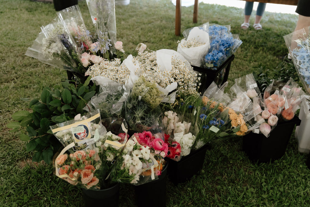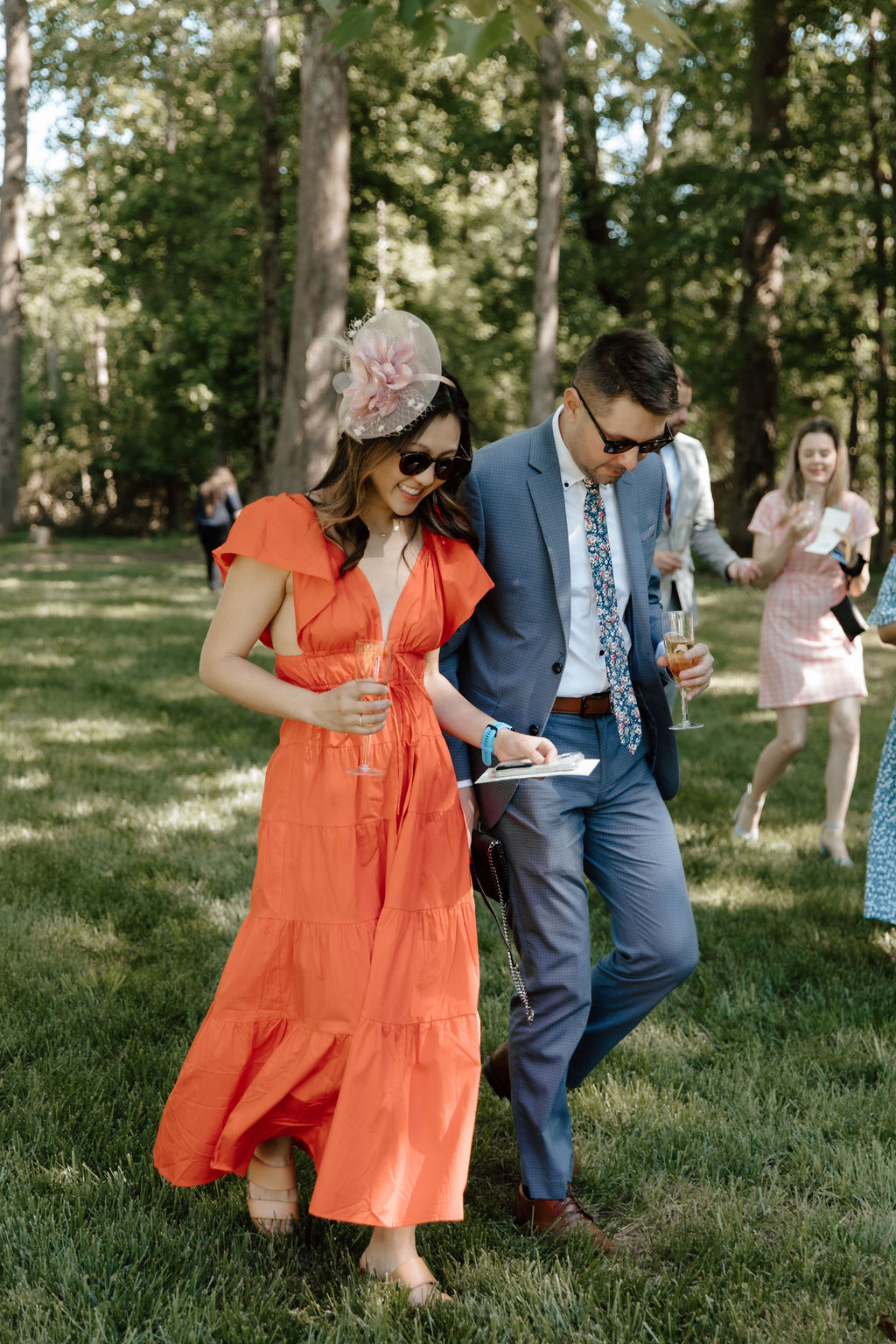 The setting couldn’t have been more fitting. Autumn, who jokes that she secretly wishes she could live on a homestead while continuing her career in medicinal chemistry, found the backyard celebration perfectly aligned with her spirit. Leaning into the idea of an intimate garden dinner party, she and David invited guests to wear their floral best and don whimsical fascinators. The earthy décor featured thrifted vintage glassware, mossy wildflower arrangements, glowing string lights and framed family photos thoughtfully placed throughout. With florals by her Autumn’s aunt and DIY pieces throughout, the celebration was truly one-of-a-kind.
