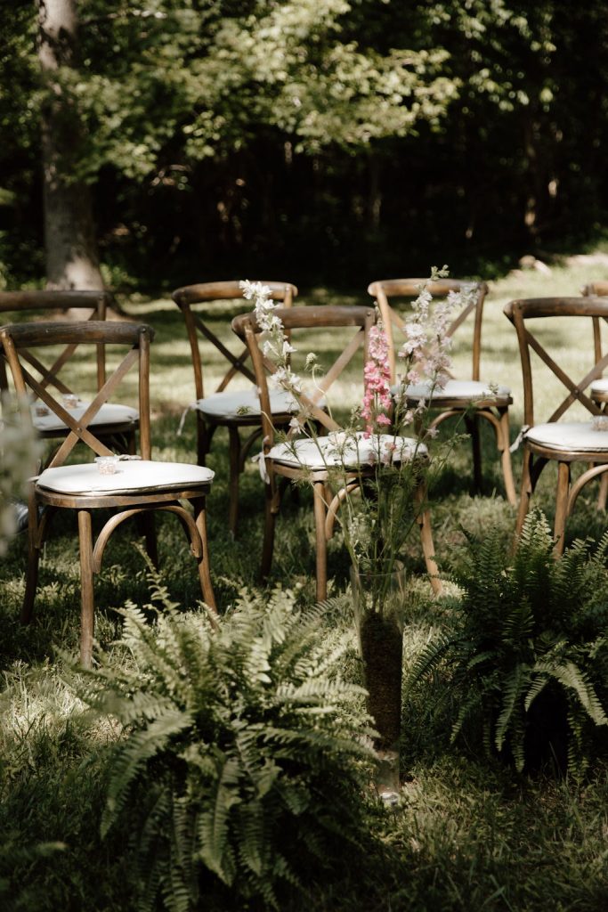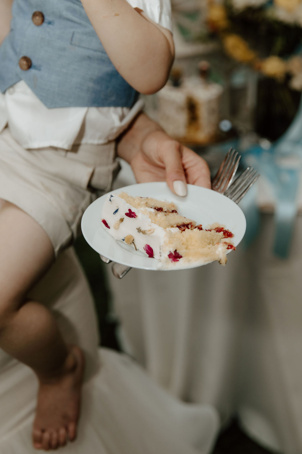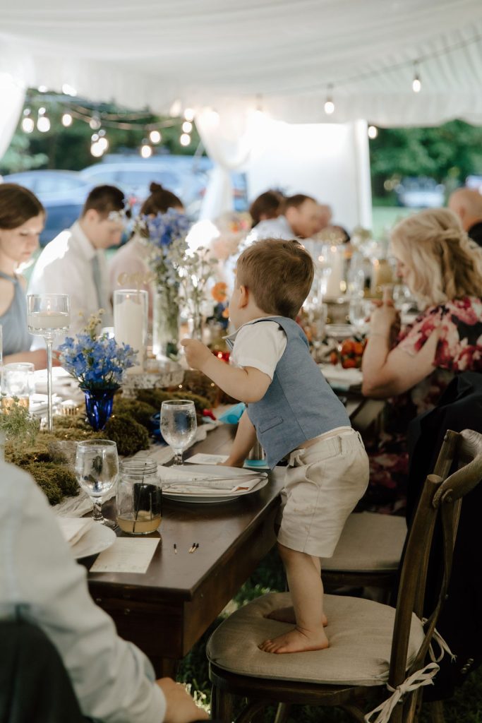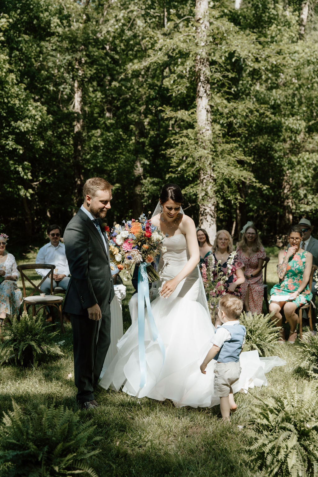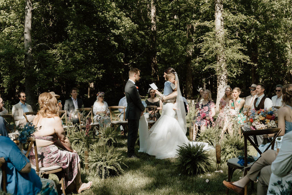 The ceremony itself carried symbolic touches they had missed the first time around. Chairs formed a circle around Autumn and David, creating an “in the round” setting. They also incorporated a ring-warming ritual, inviting loved ones to hold and bless the wedding bands before the exchange. Adding the sweetest layer to the day, their toddler son was the ring bearer and barely left his mother’s side all day.