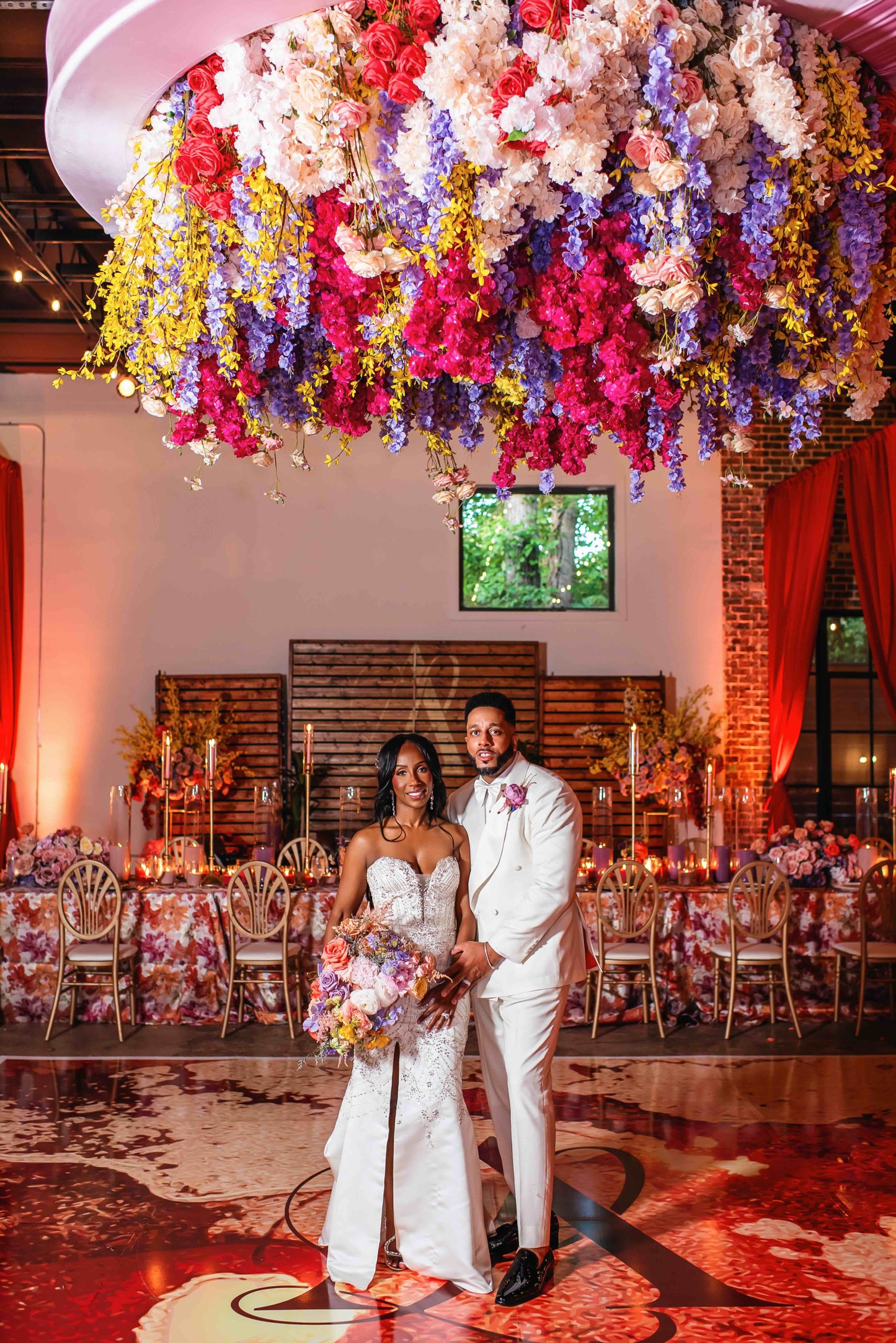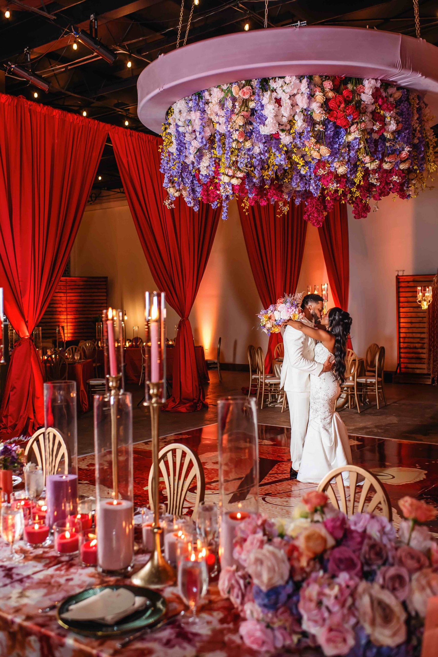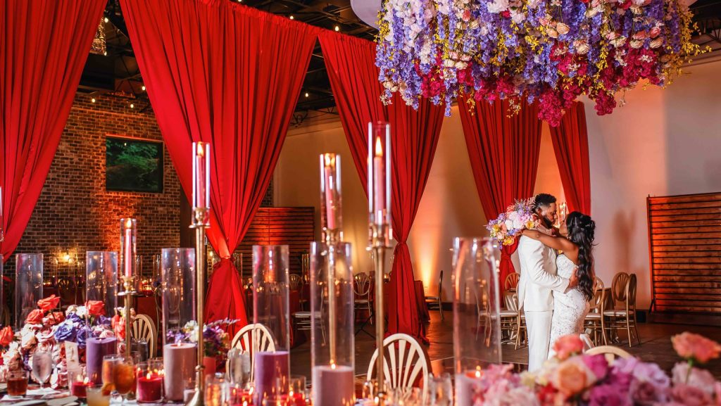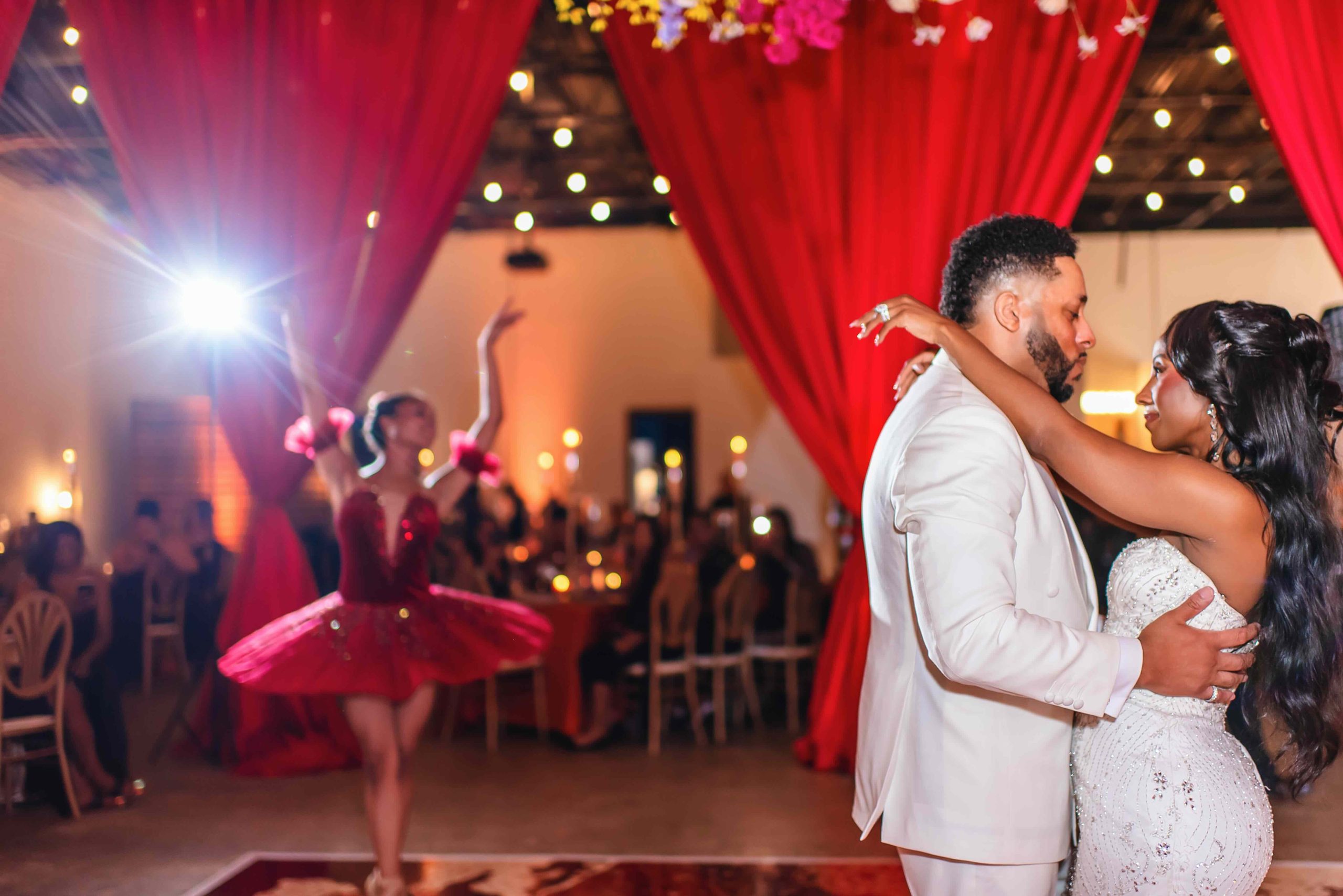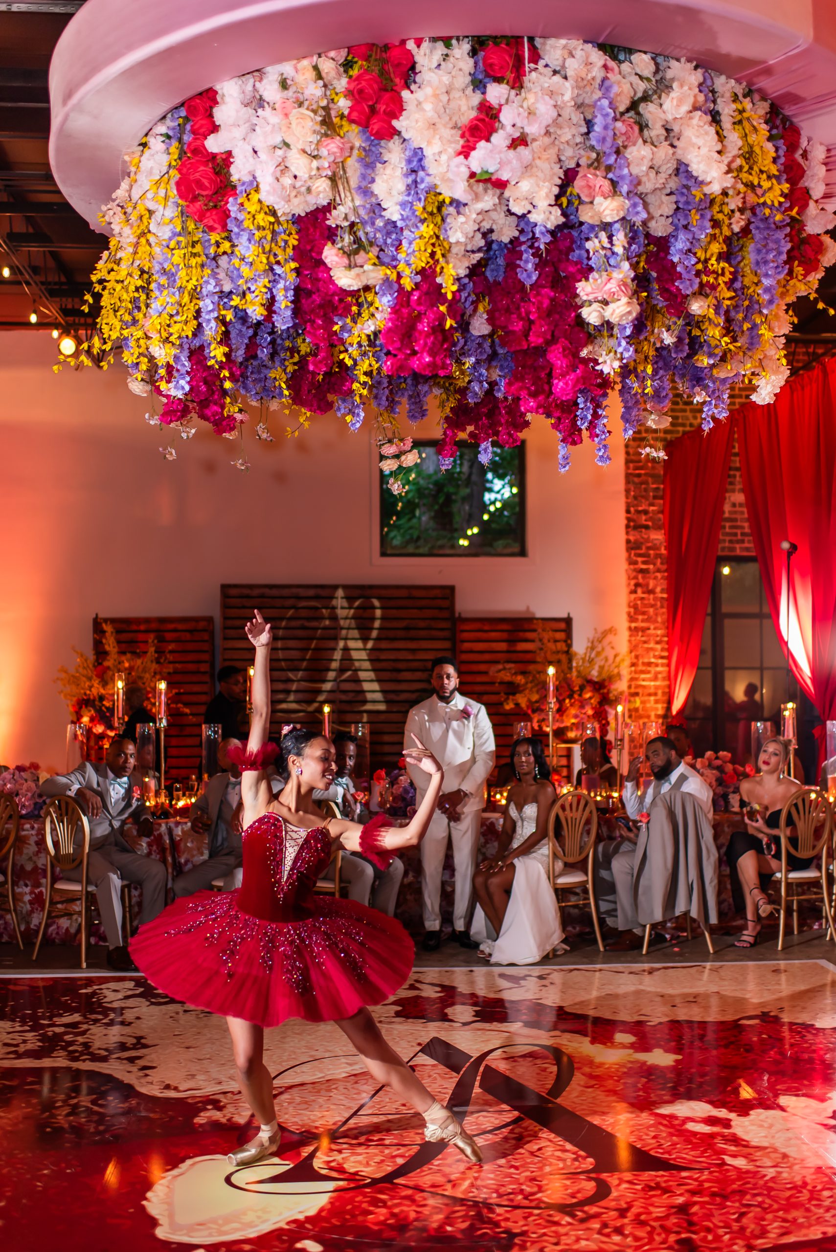 If the ceremony was heartfelt, the reception was spellbinding. Typically industrial, the venue was reimagined into a vibrant dreamscape, complete with cascading red drapery and suspended florals creating a blooming canopy overhead. Their first dance was cinematic, made all the more magical as a ballerina pirouetted around them.