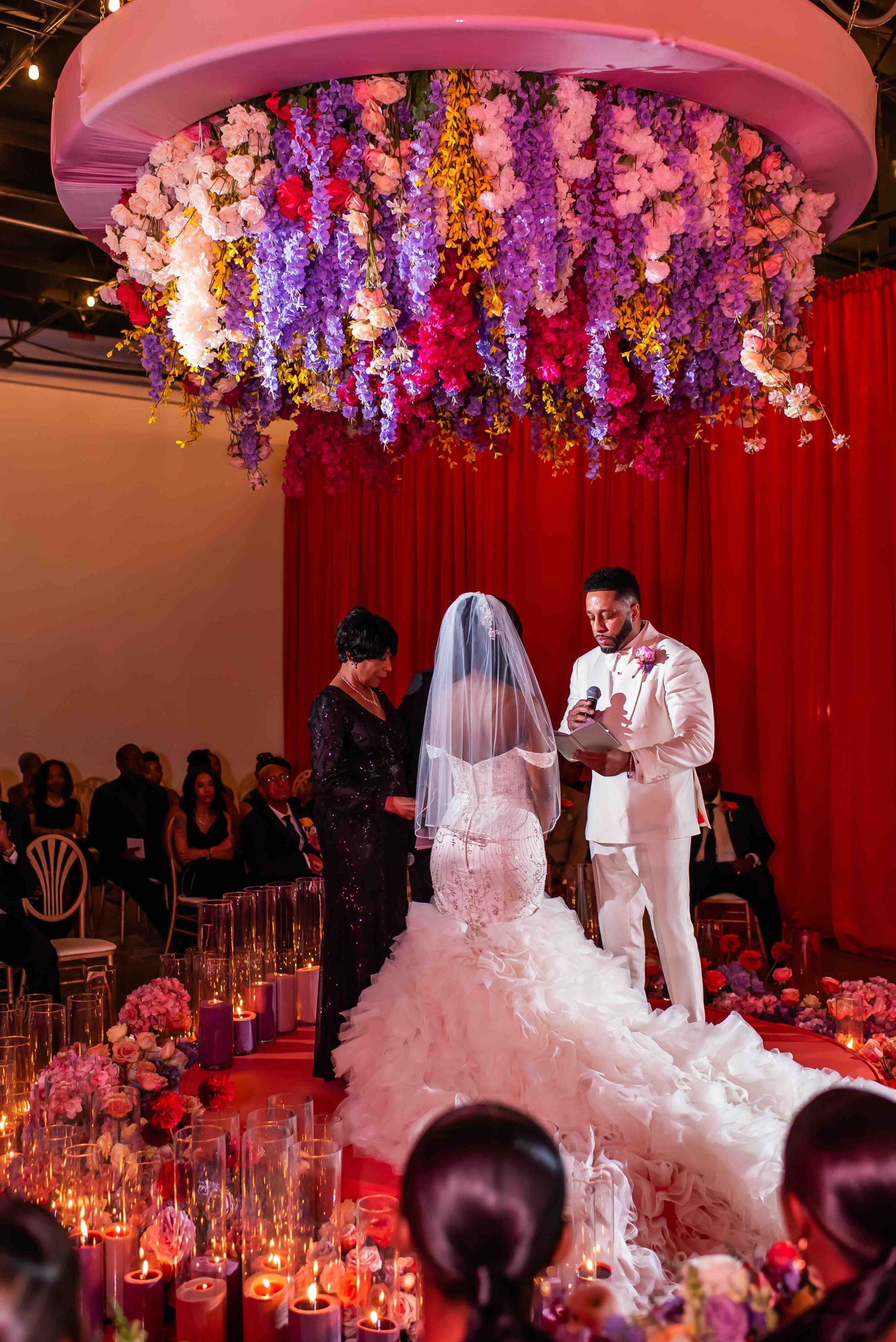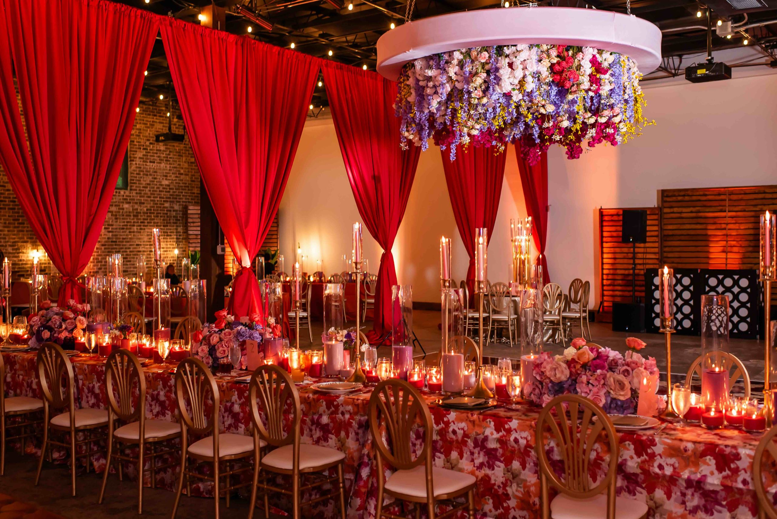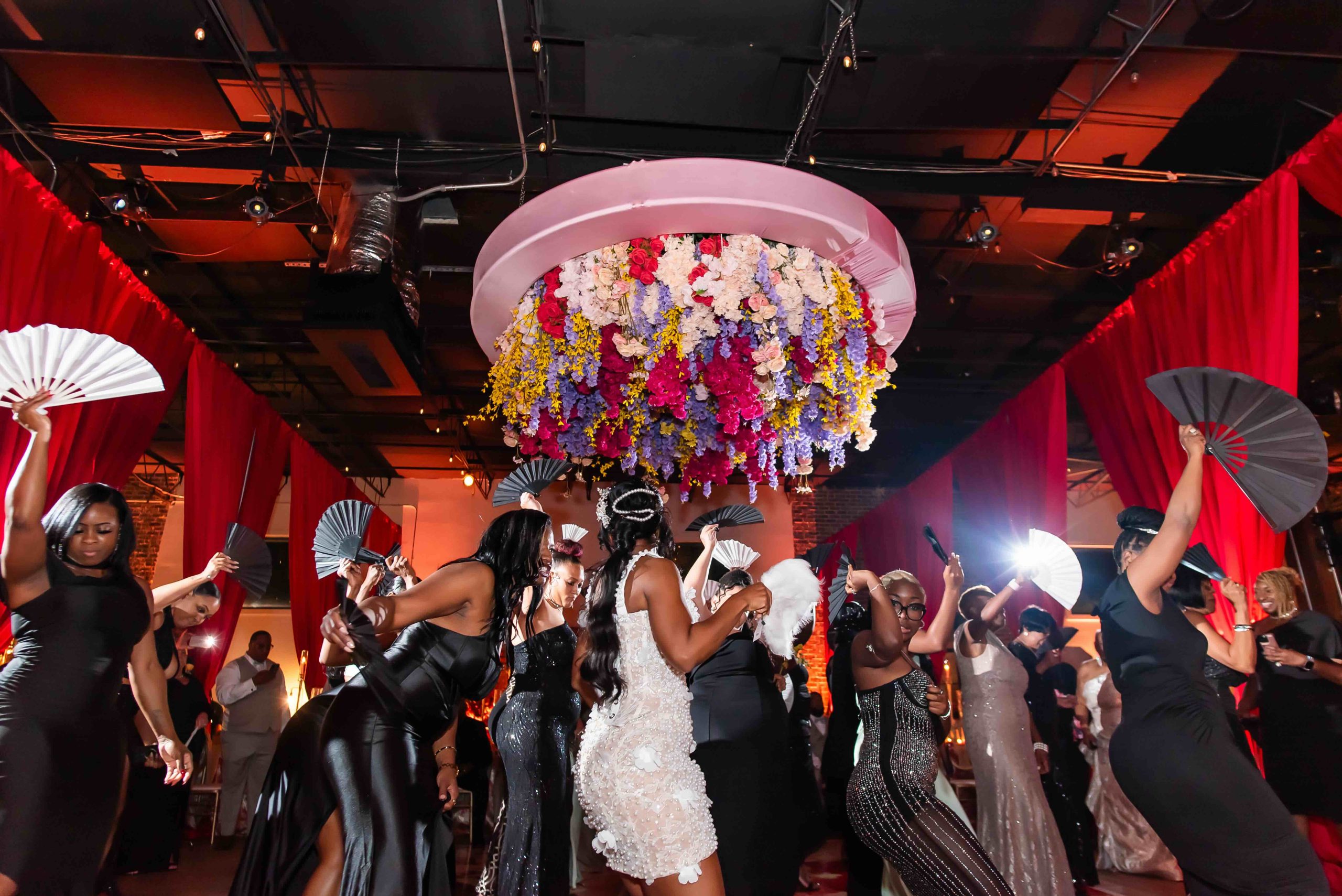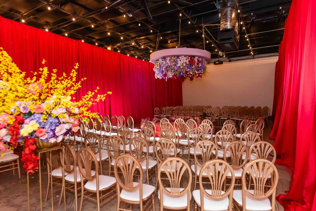 If the ceremony was heartfelt, the reception was spellbinding. Typically industrial, the venue was reimagined into a vibrant dreamscape, complete with cascading red drapery and suspended florals creating a blooming canopy overhead. Their first dance was cinematic, made all the more magical as a ballerina pirouetted around them.