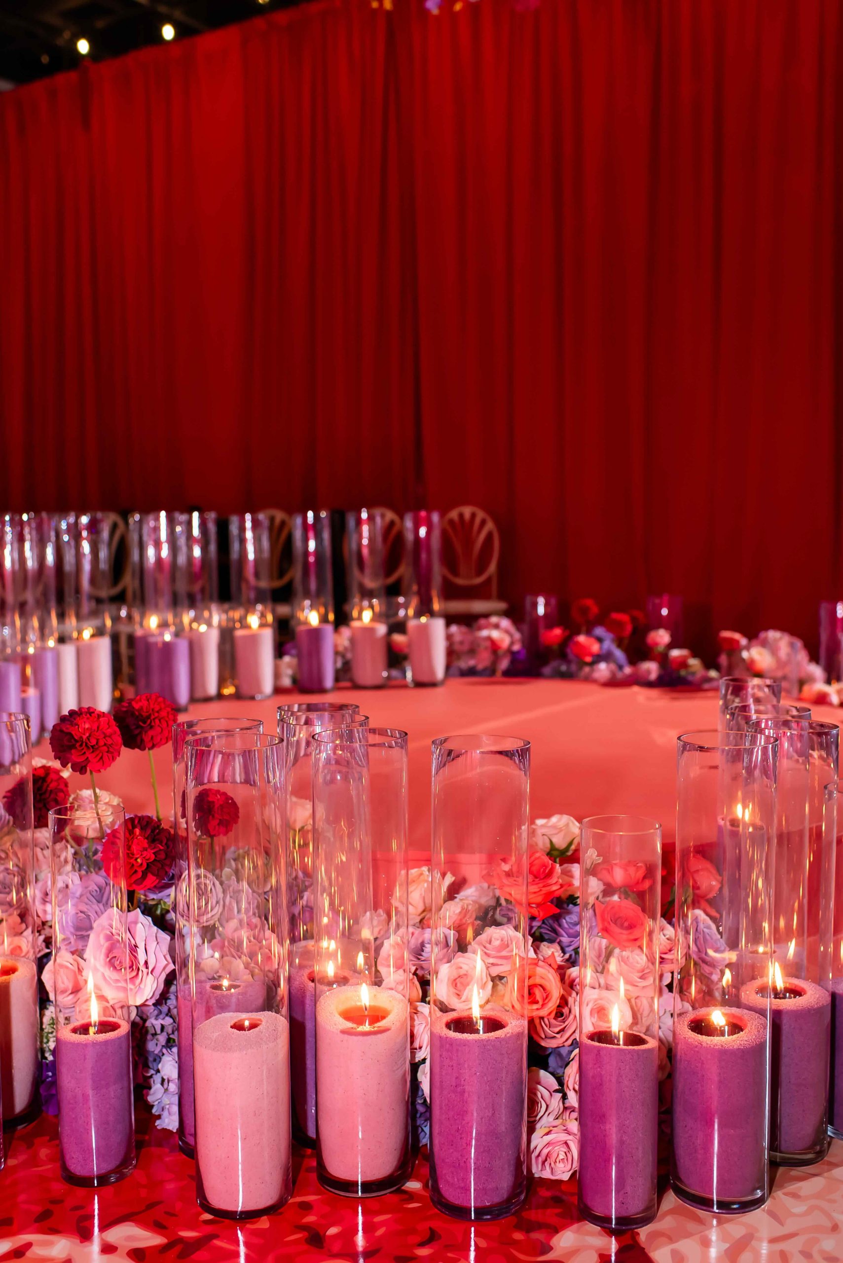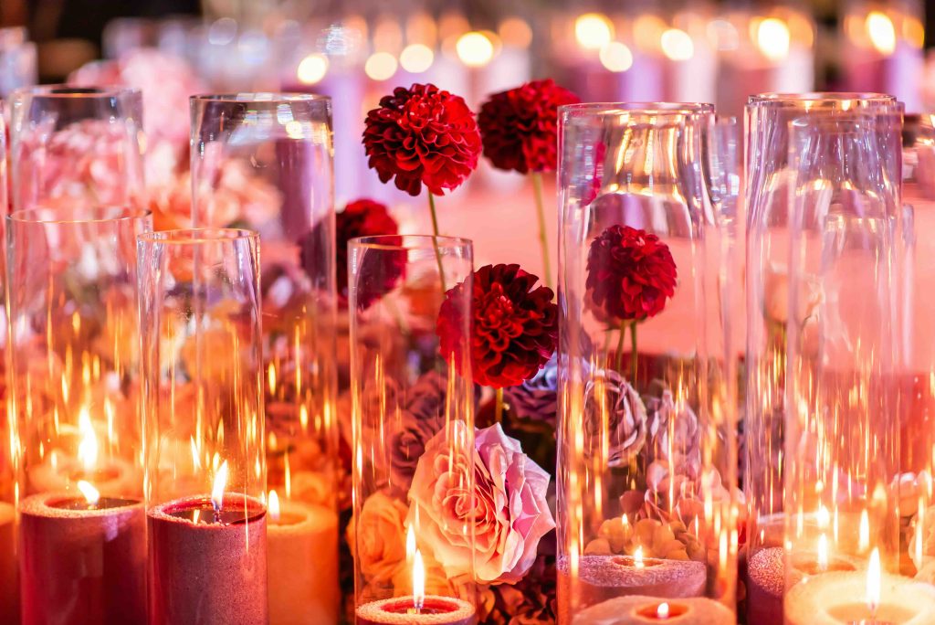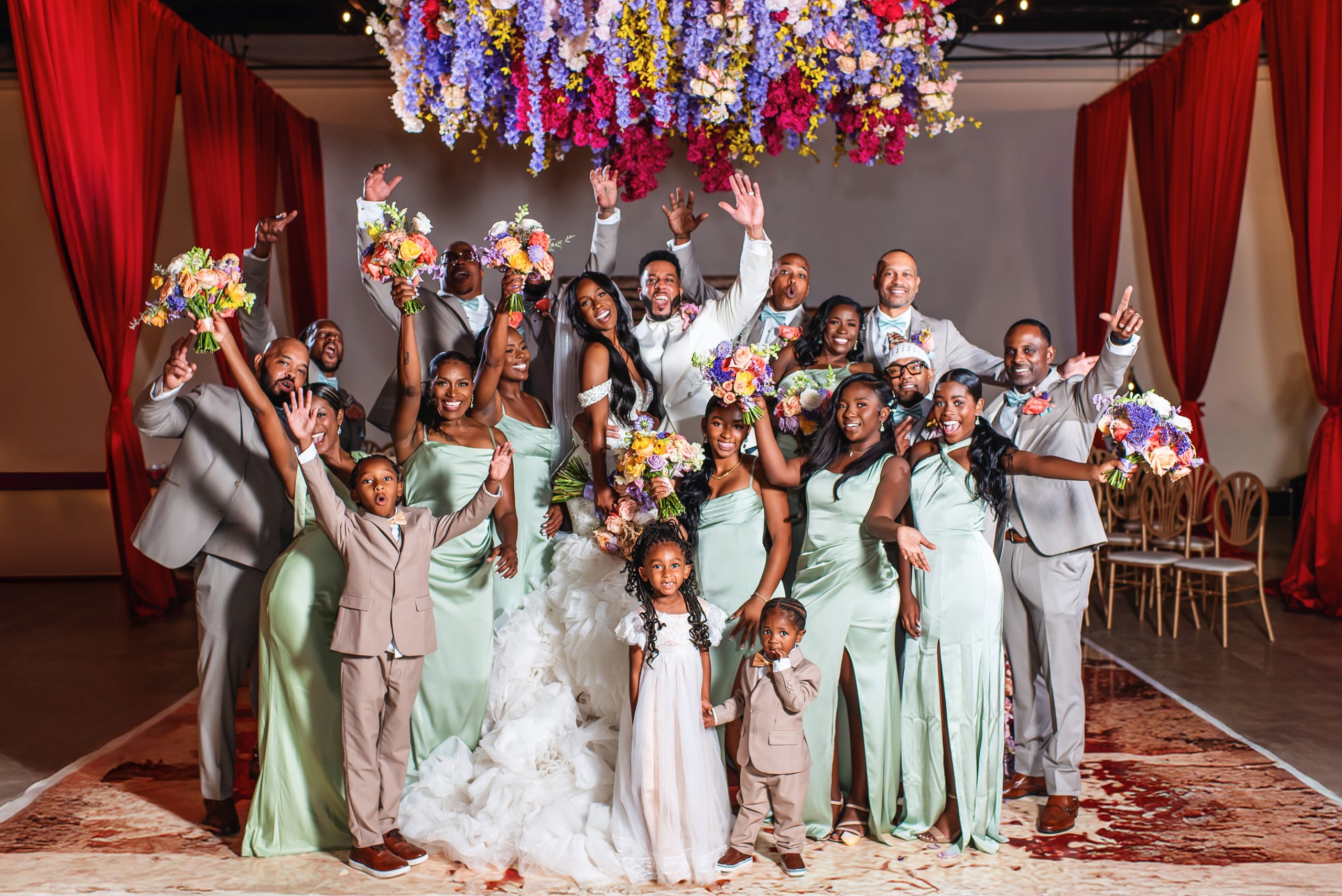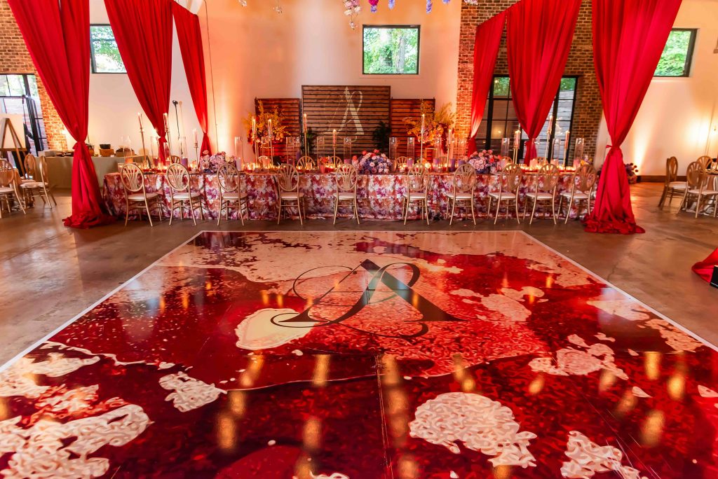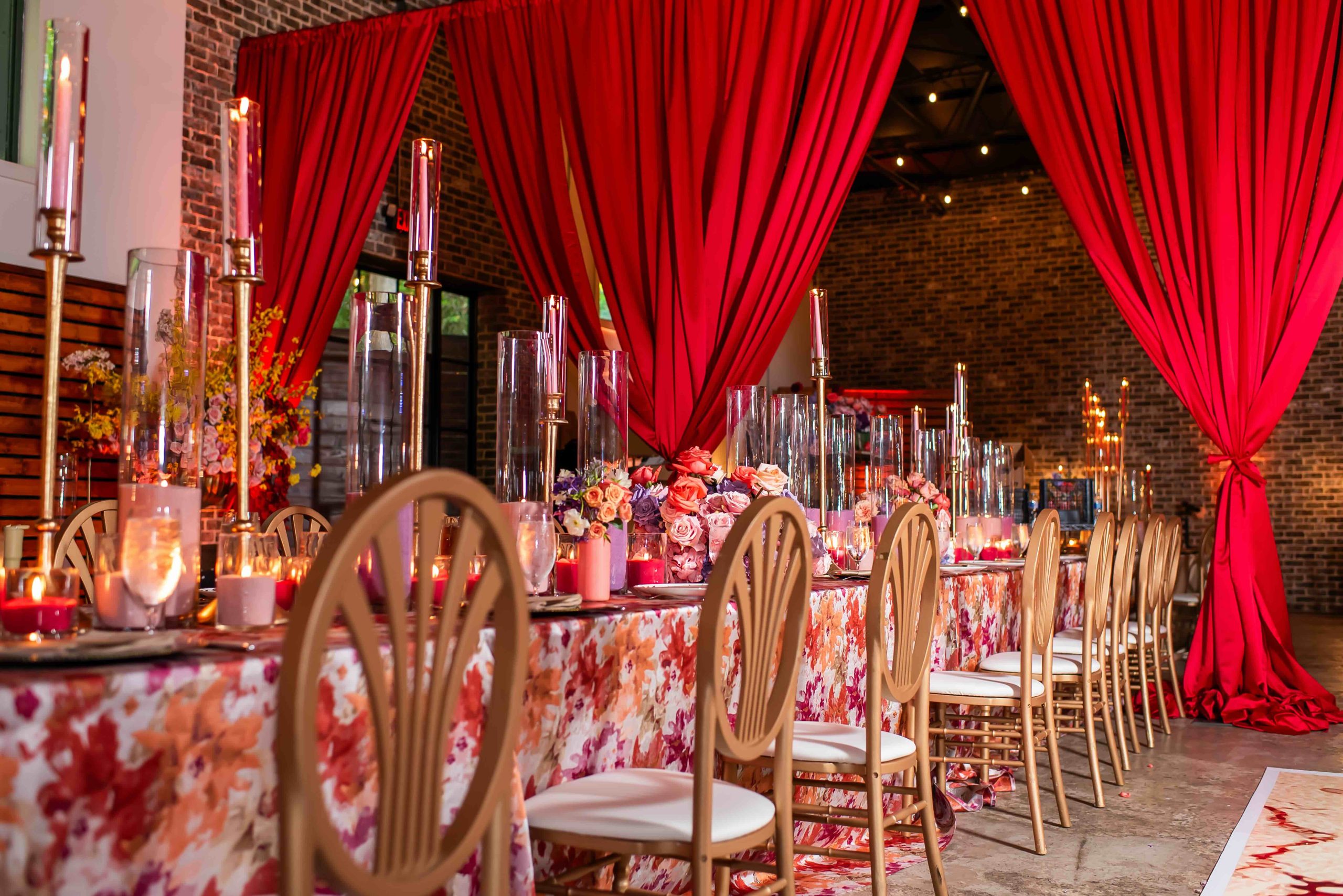 If the ceremony was heartfelt, the reception was spellbinding. Typically industrial, the venue was reimagined into a vibrant dreamscape, complete with cascading red drapery and suspended florals creating a blooming canopy overhead. Their first dance was cinematic, made all the more magical as a ballerina pirouetted around them.