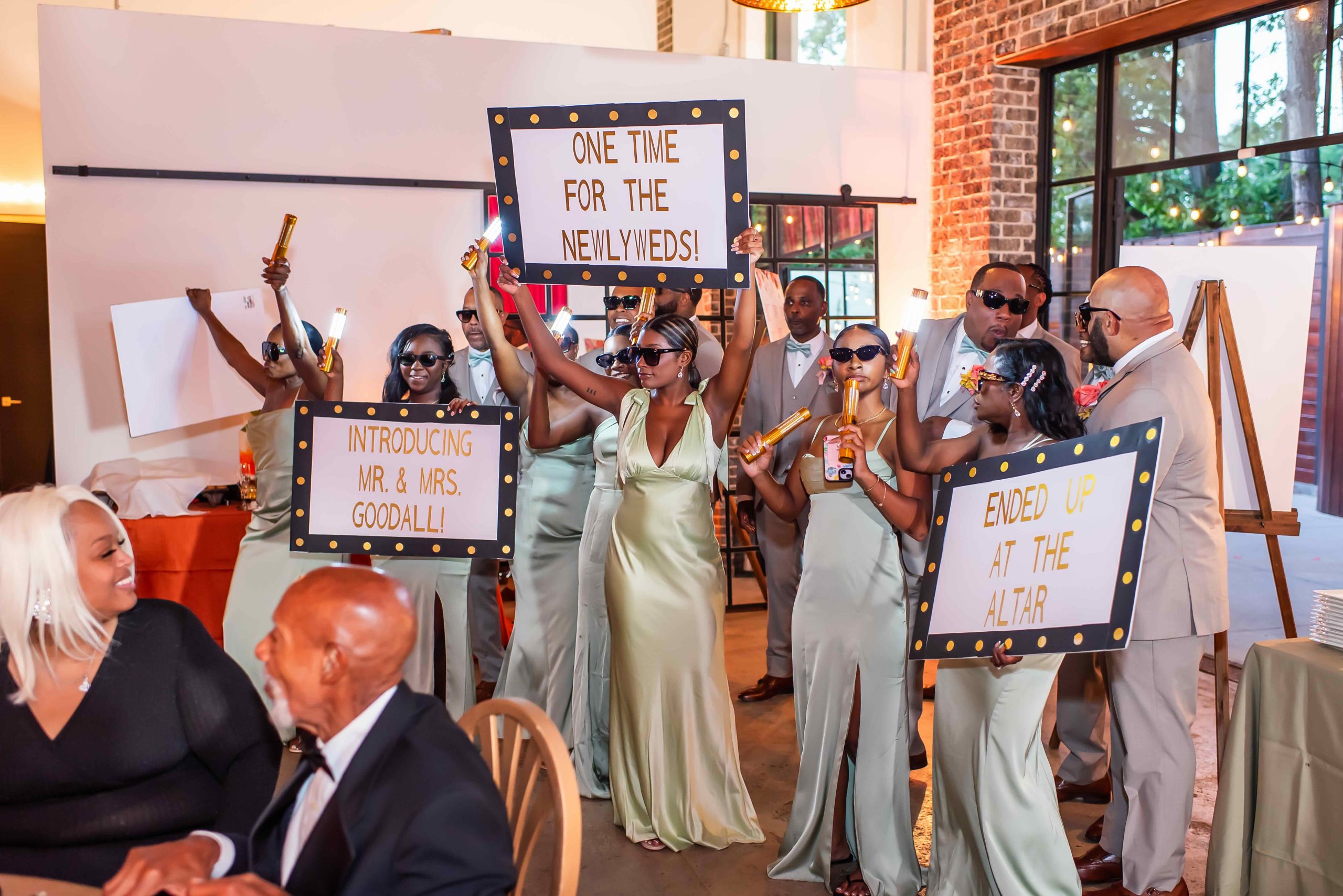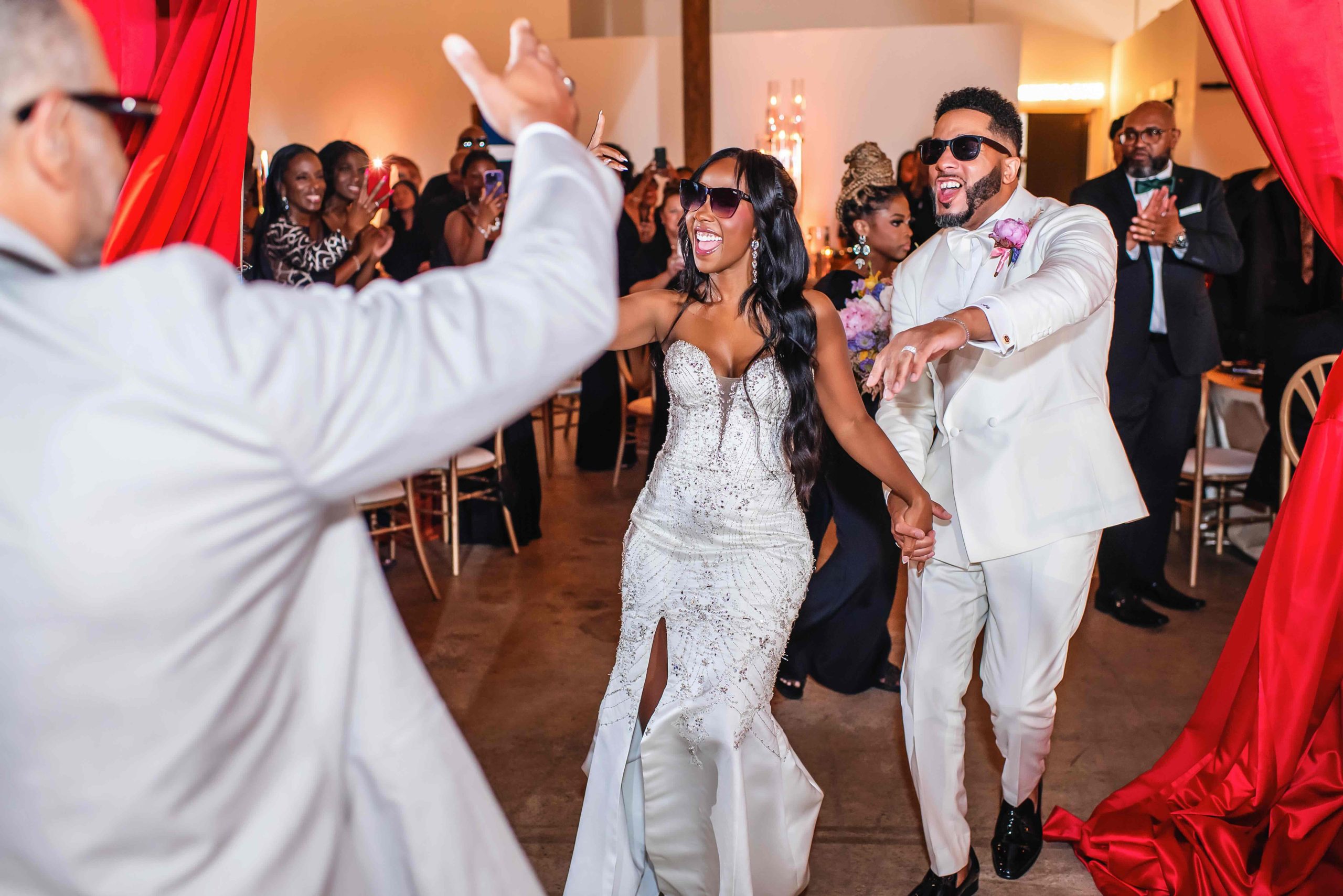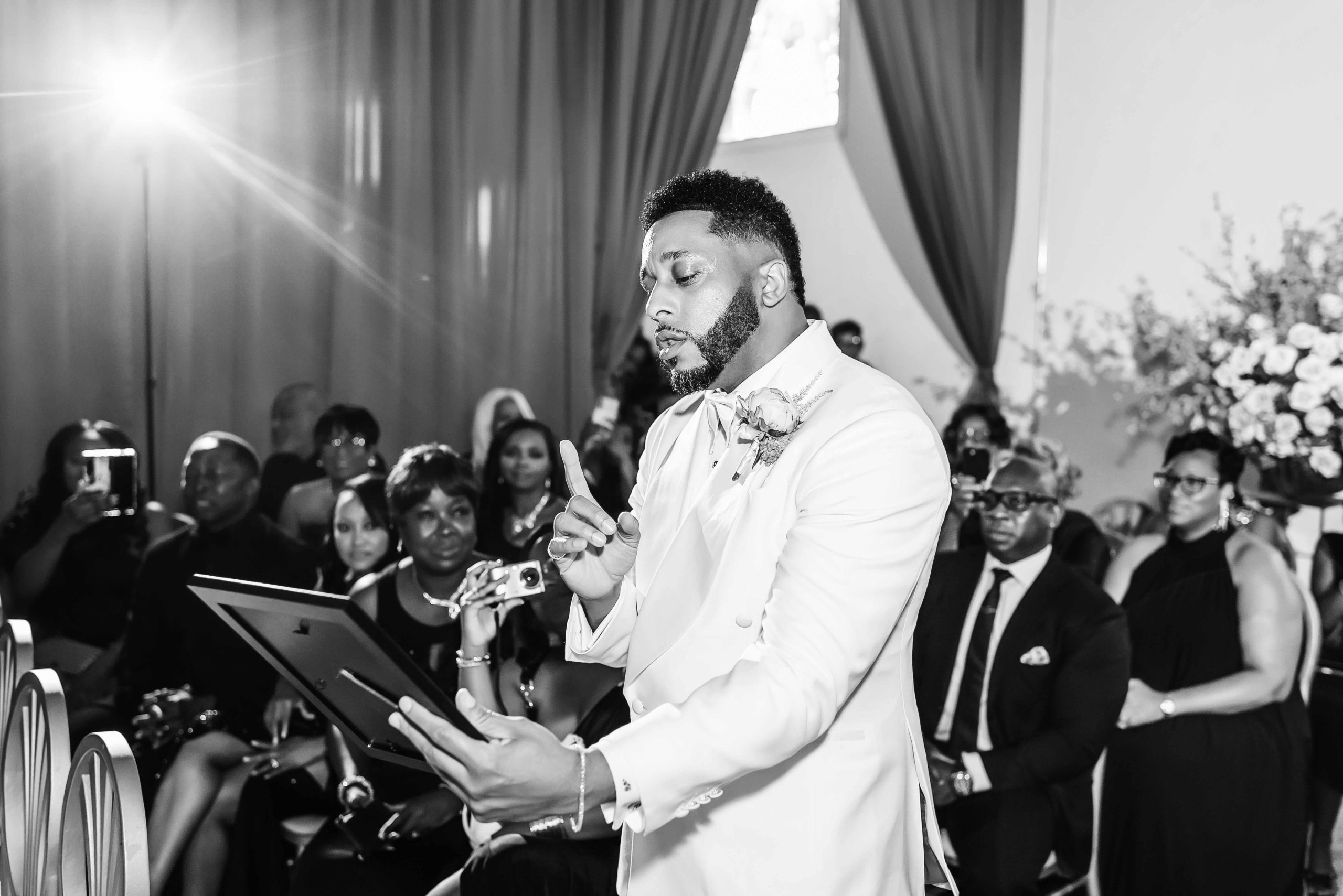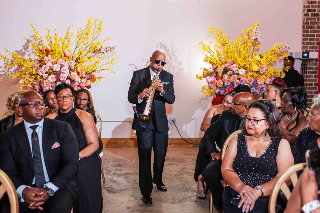 At 42West, gospel melodies filled the air as guests were ushered to their seats. The altar, positioned in the center of the room, symbolized how the couple’s union would be held by the support of their community. Guests dressed in elegant black highlighted the couple’s presence: Lawanda in a sparkling crystal-adorned mermaid gown by Winnie Couture, and As-Samad in a crisp, all-white double-breasted tuxedo.