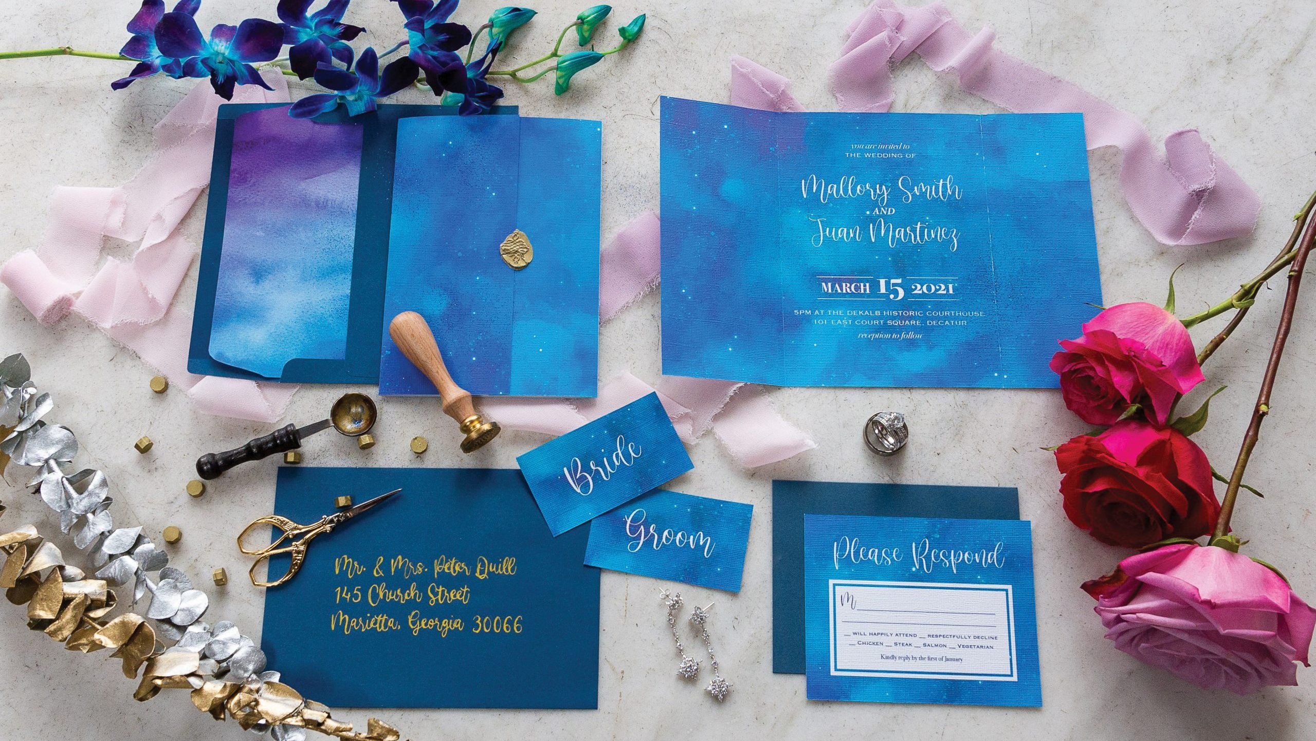“We want to encourage brides to ‘shoot for the stars’ on their big day and shrug off limitations. To illustrate this, we paired bold, vibrant celestial colors with a classic neutral space. We featured our bride in a stunning, refined silhouette and coordinated colors for our groom’s suit.”