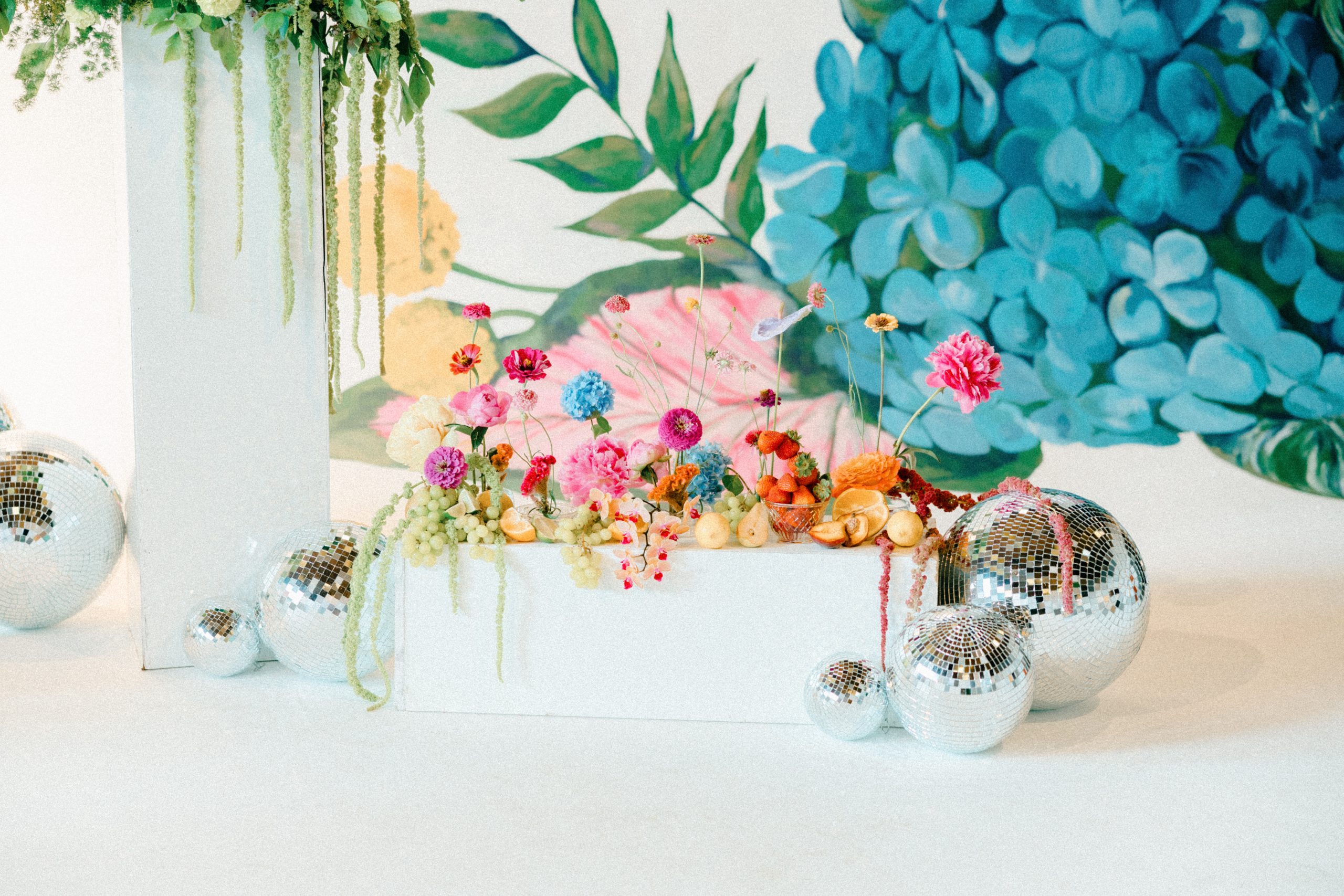 From the start, the couple knew their wedding needed to feel electric, nostalgic and entirely theirs. Pulling inspiration from 1970s disco posters, Camaryn’s illustrations and their own home decor, Megan Corbat Design crafted an extraordinary scene. To tie it all together, she leaned into Atlanta’s June bounty, using local, seasonal blooms from area farms and her own cutting garden, all accented by funky disco balls and fresh fruit.