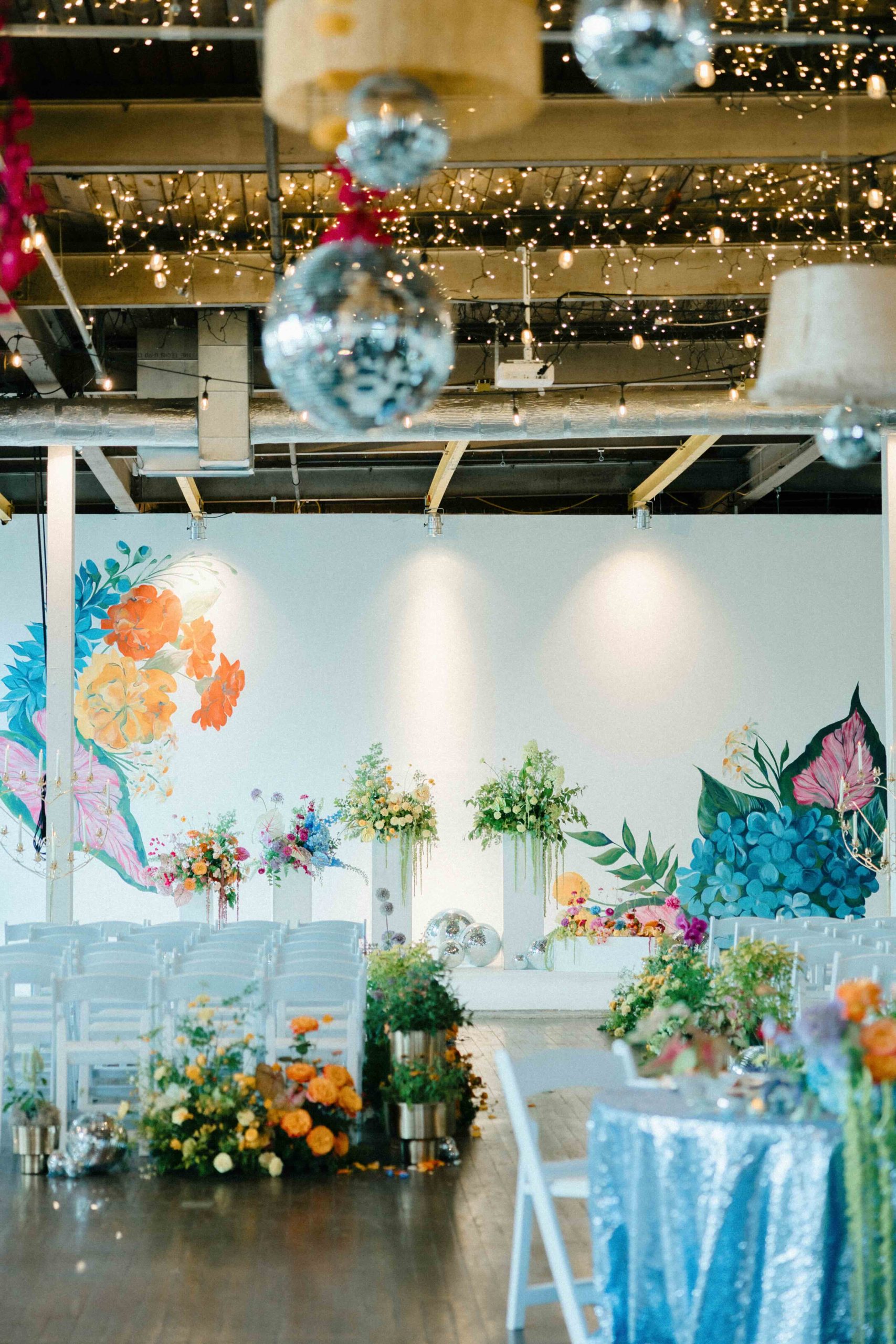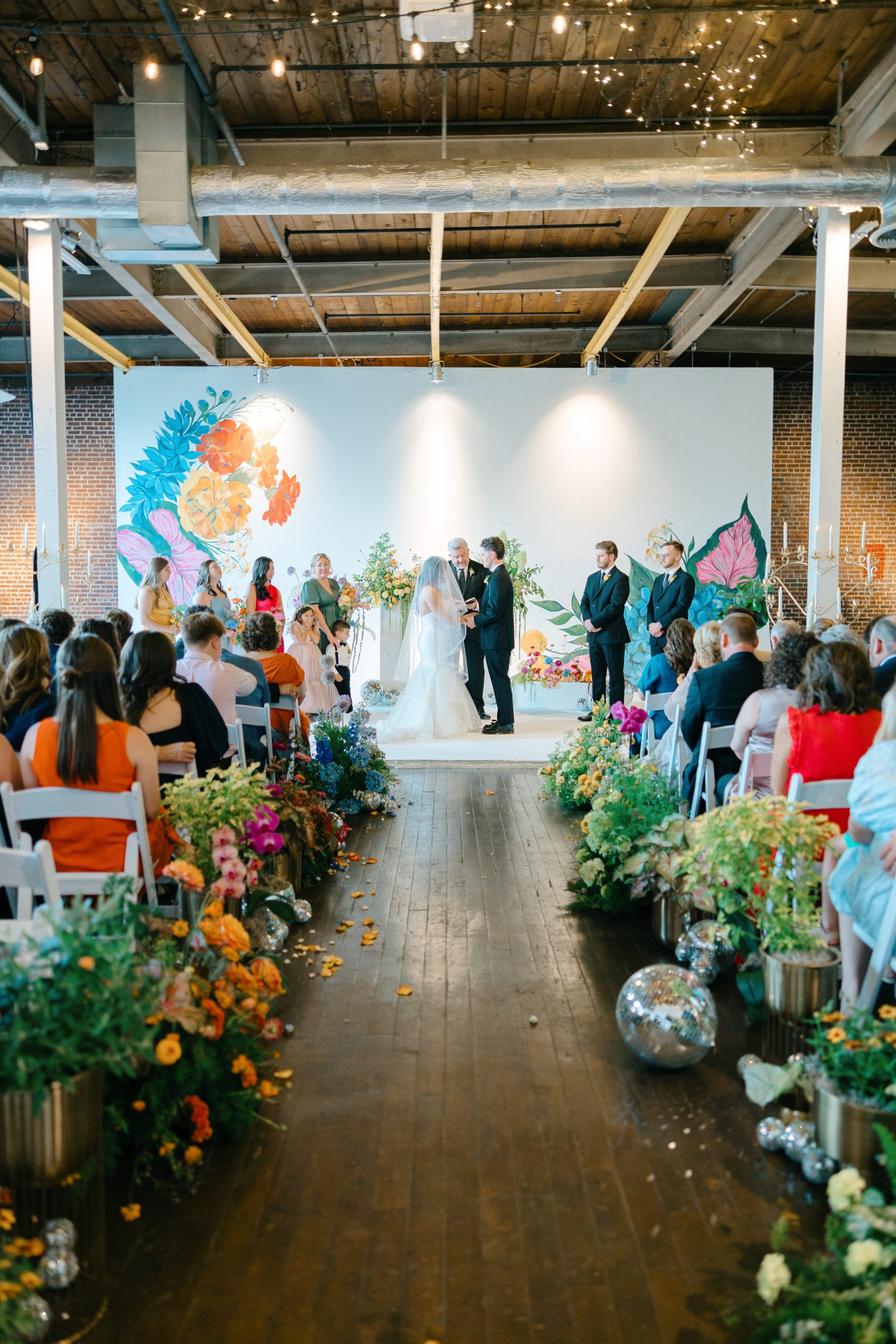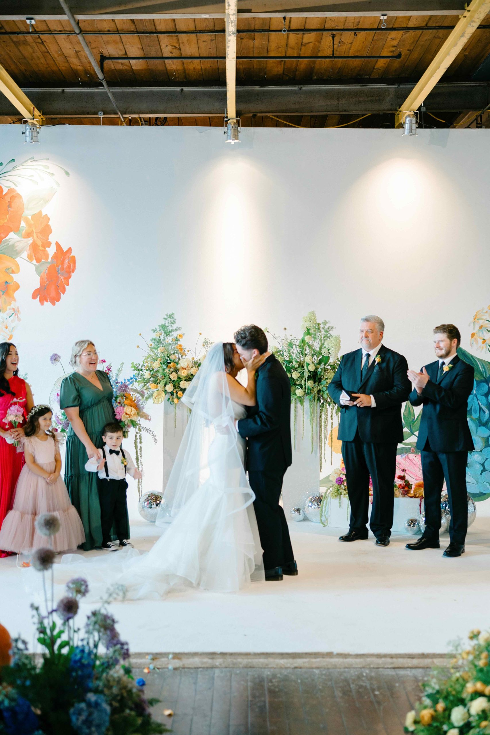 Oftentimes, wedding venues get described as blank canvases. But for Camaryn and Levi, Ambient Plus Studio became a living studio. Instead of a grand reveal, their family spent the day at the venue, getting ready together and witnessing the design come to life. As light shifted throughout the morning, Melissa Richardson of Mel Makes painted a blooming mural across the white stage, and Megan Corbat Design’s colorful florals were placed with strategic whimsy. By the time the ceremony arrived, everyone had watched the couple’s vision fully realized.