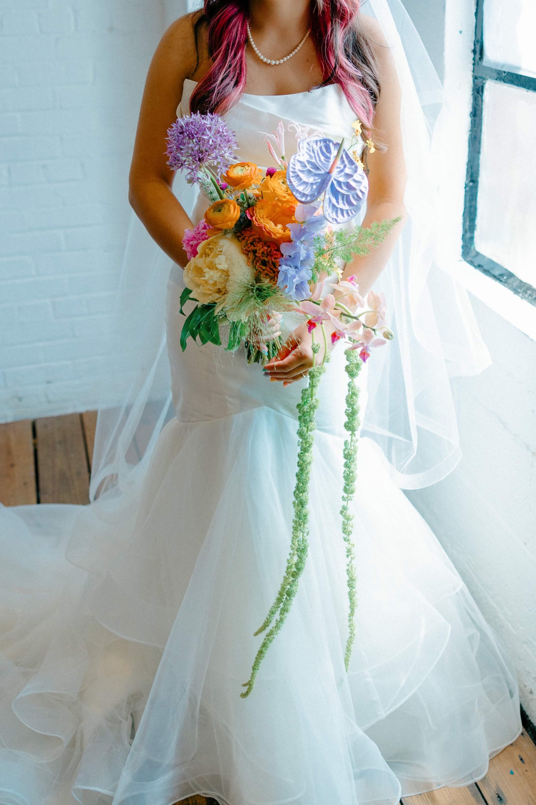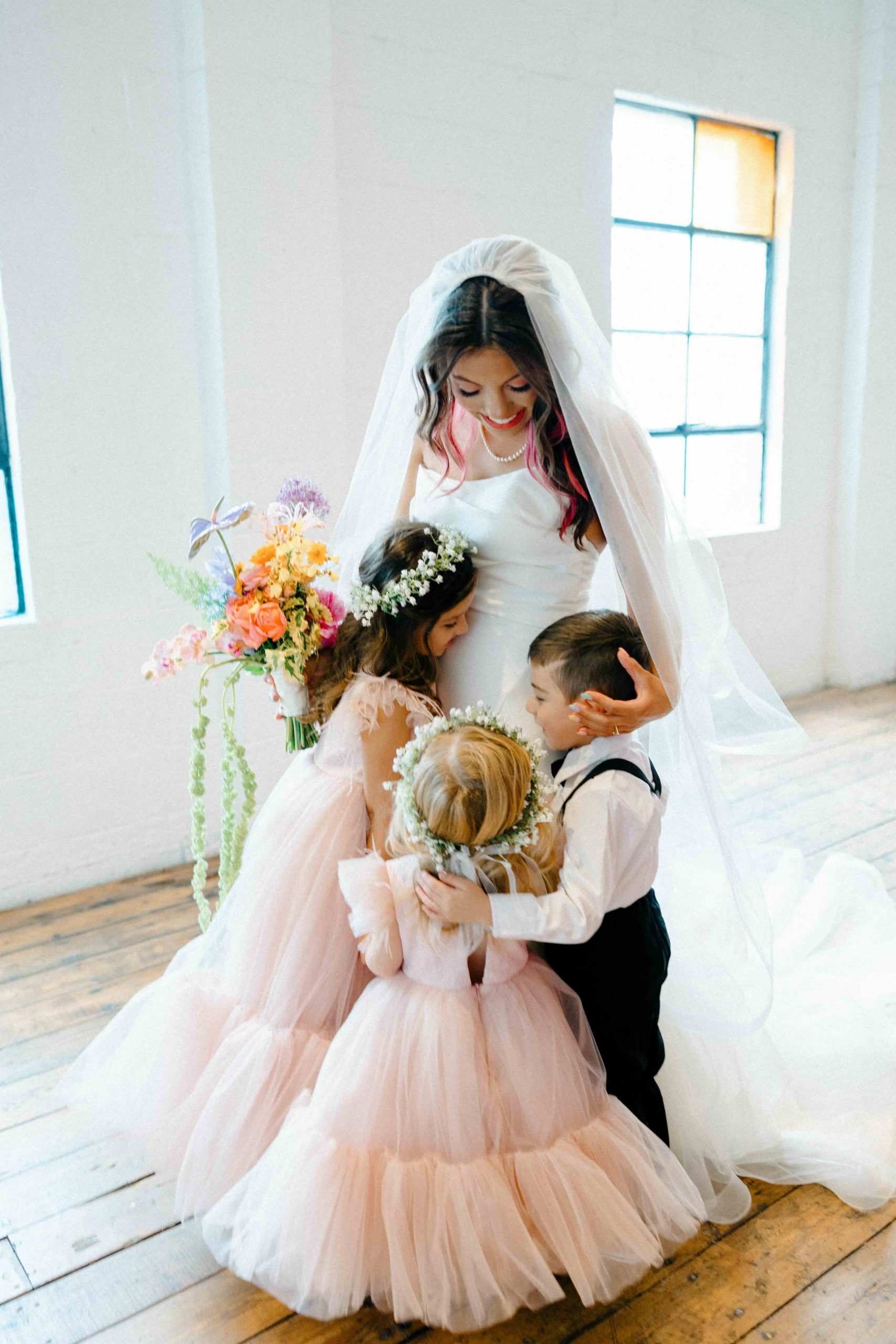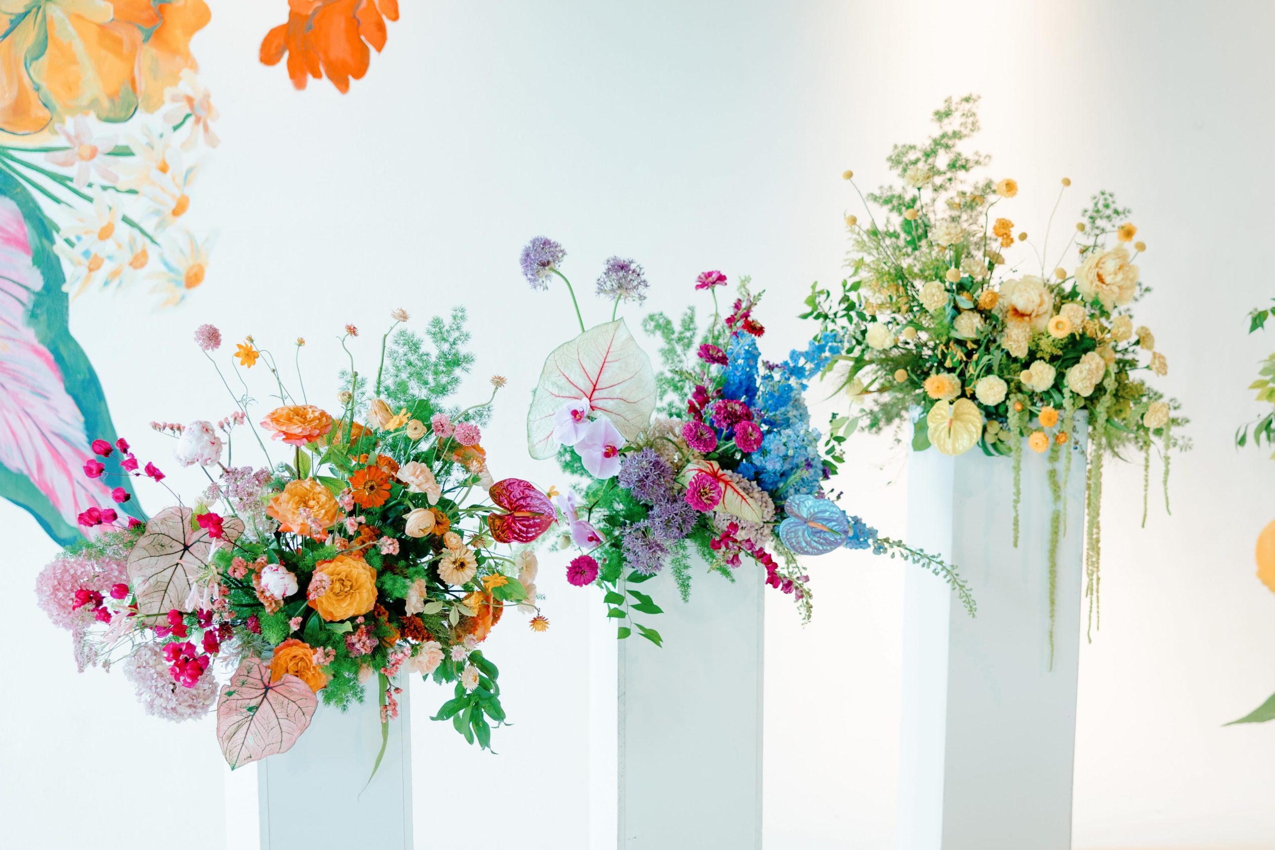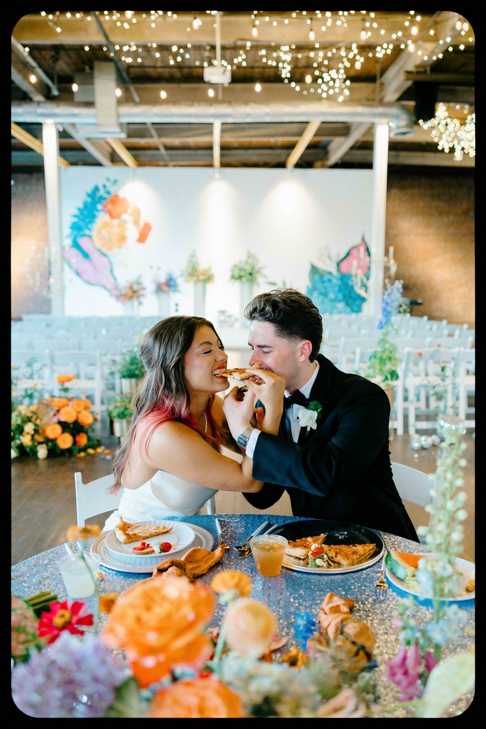 Oftentimes, wedding venues get described as blank canvases. But for Camaryn and Levi, Ambient Plus Studio became a living studio. Instead of a grand reveal, their family spent the day at the venue, getting ready together and witnessing the design come to life. As light shifted throughout the morning, Melissa Richardson of Mel Makes painted a blooming mural across the white stage, and Megan Corbat Design’s colorful florals were placed with strategic whimsy. By the time the ceremony arrived, everyone had watched the couple’s vision fully realized.