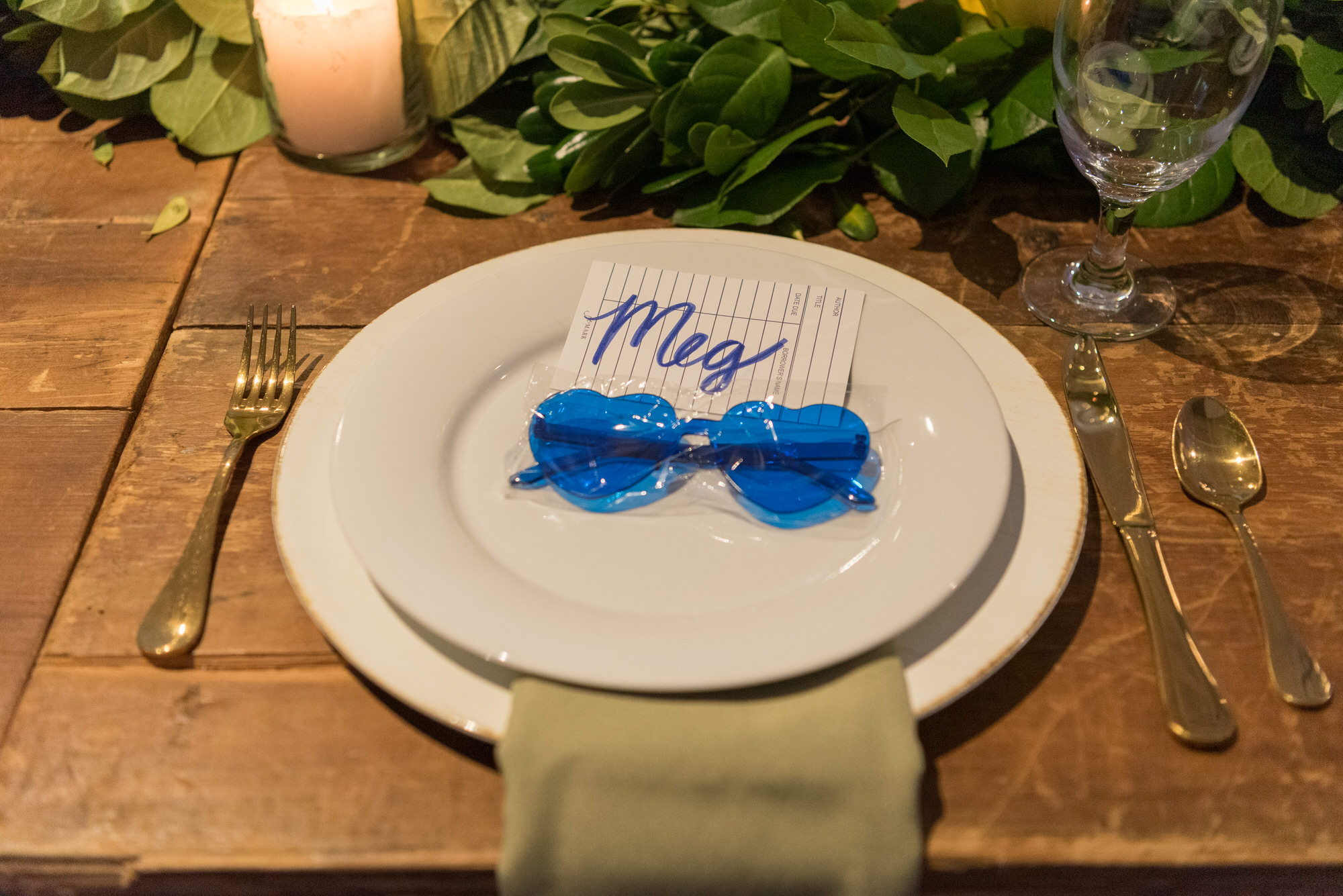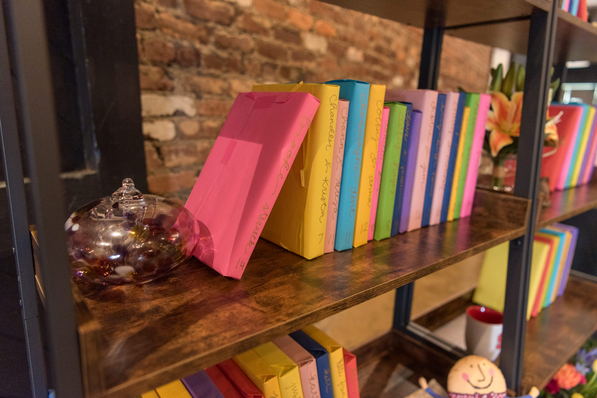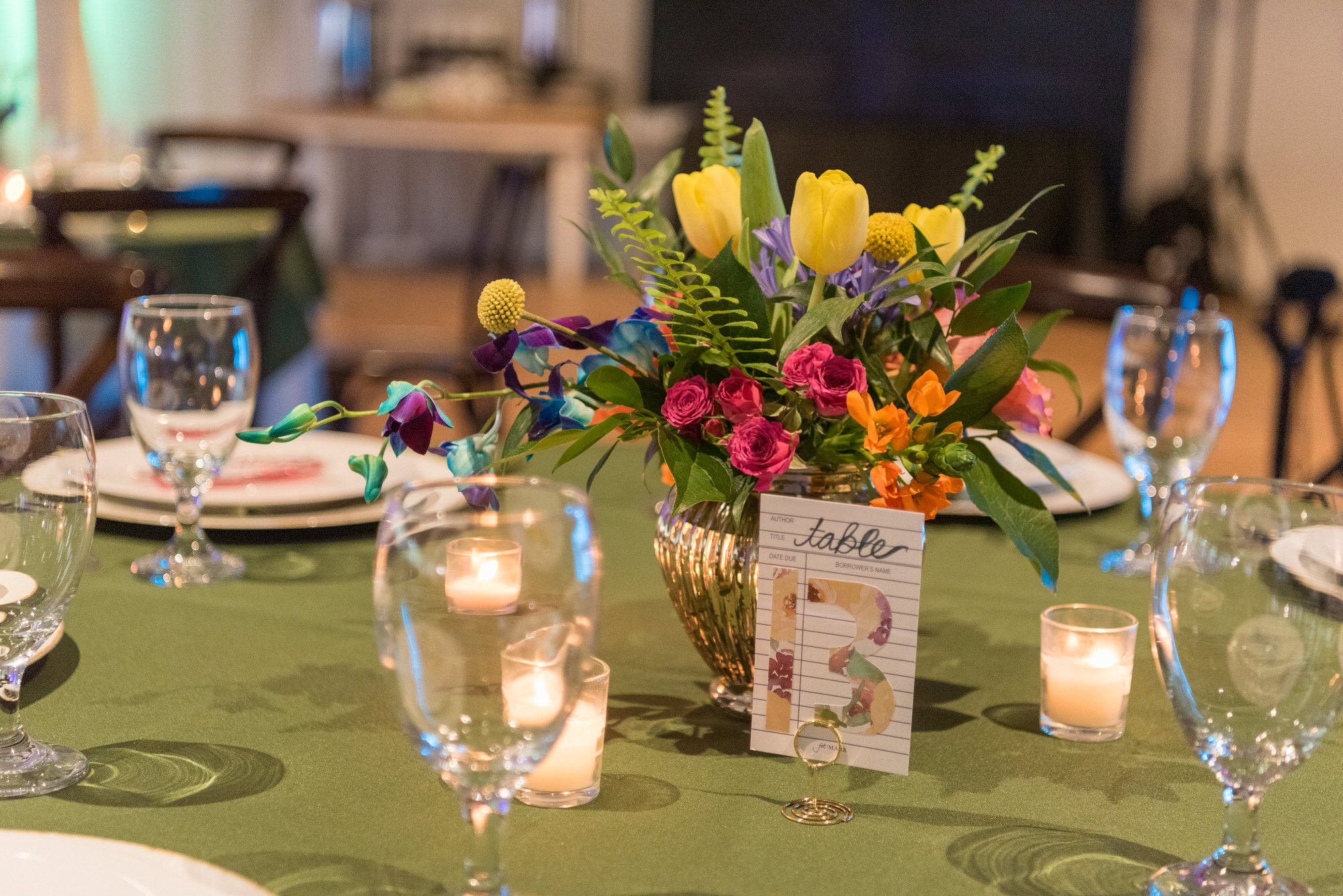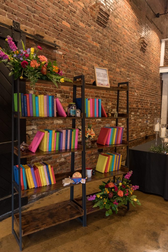The design of the day radiated cheer, with vibrant florals, playful details and nods to the couple’s love of storytelling. One of the most memorable touches was their seating chart—a bookshelf lined with colorfully wrapped books, each with a guest’s name and seating assignment on the spine. This clever display echoed their save-the-dates, which featured customized bookmarks inviting guests to “bookmark our date.”