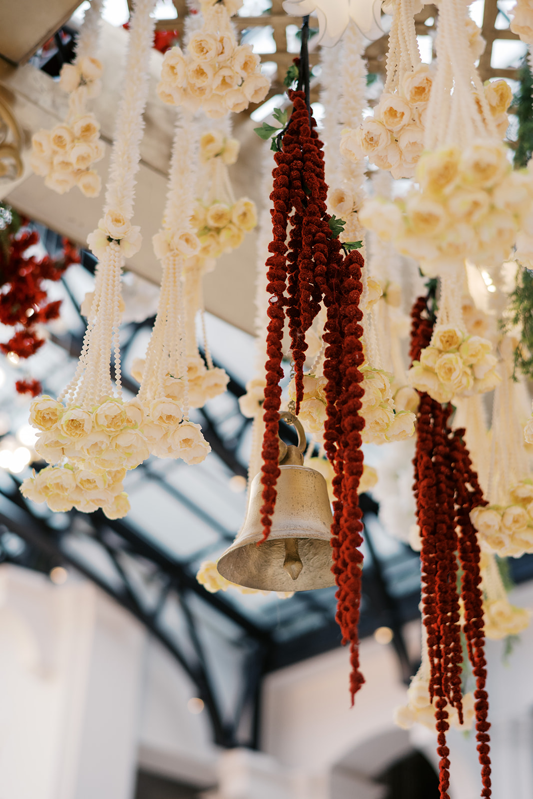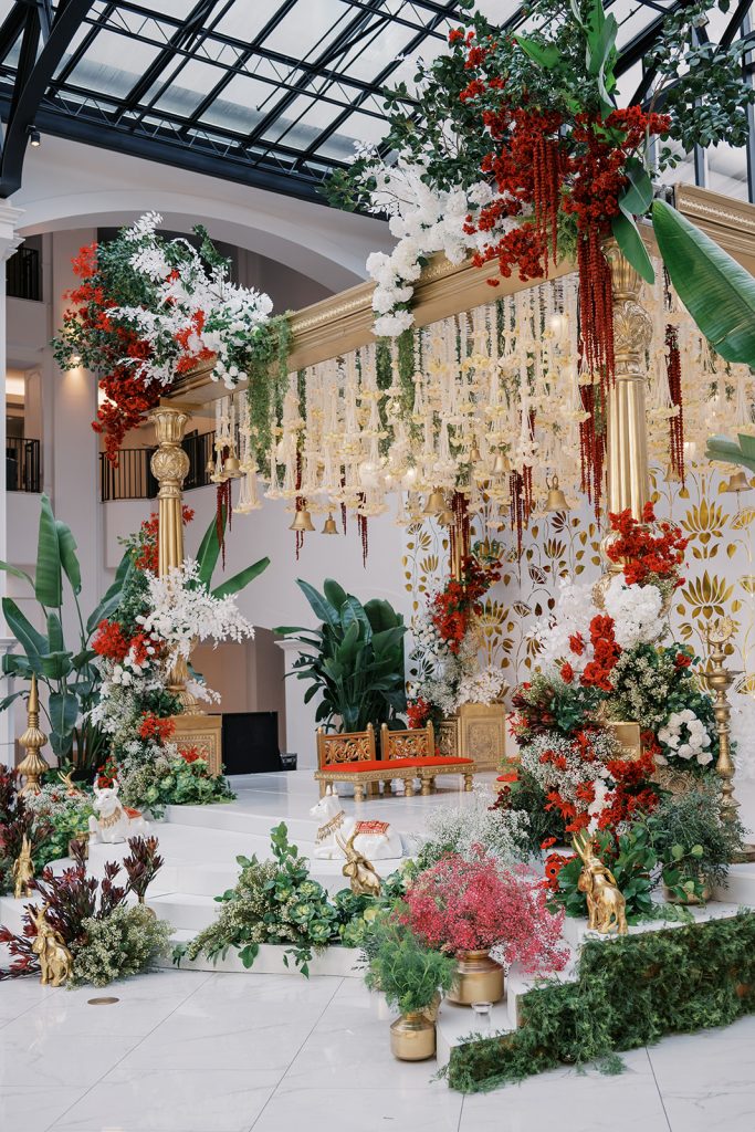Accented with gold and steeped in shades of red, green and white, Château Élan’s Glasstop Atrium transformed into a South Indian dreamscape. Planner RHS Events crafted a design that intertwined the traditions Deepa grew up with and the contemporary aesthetic she loves today. As guests entered the Hindu ceremony, they were met with golden light pouring through the atrium ceiling, jasmine and orchids cascading overhead and a mandap glowing with brass lamps and lush florals.