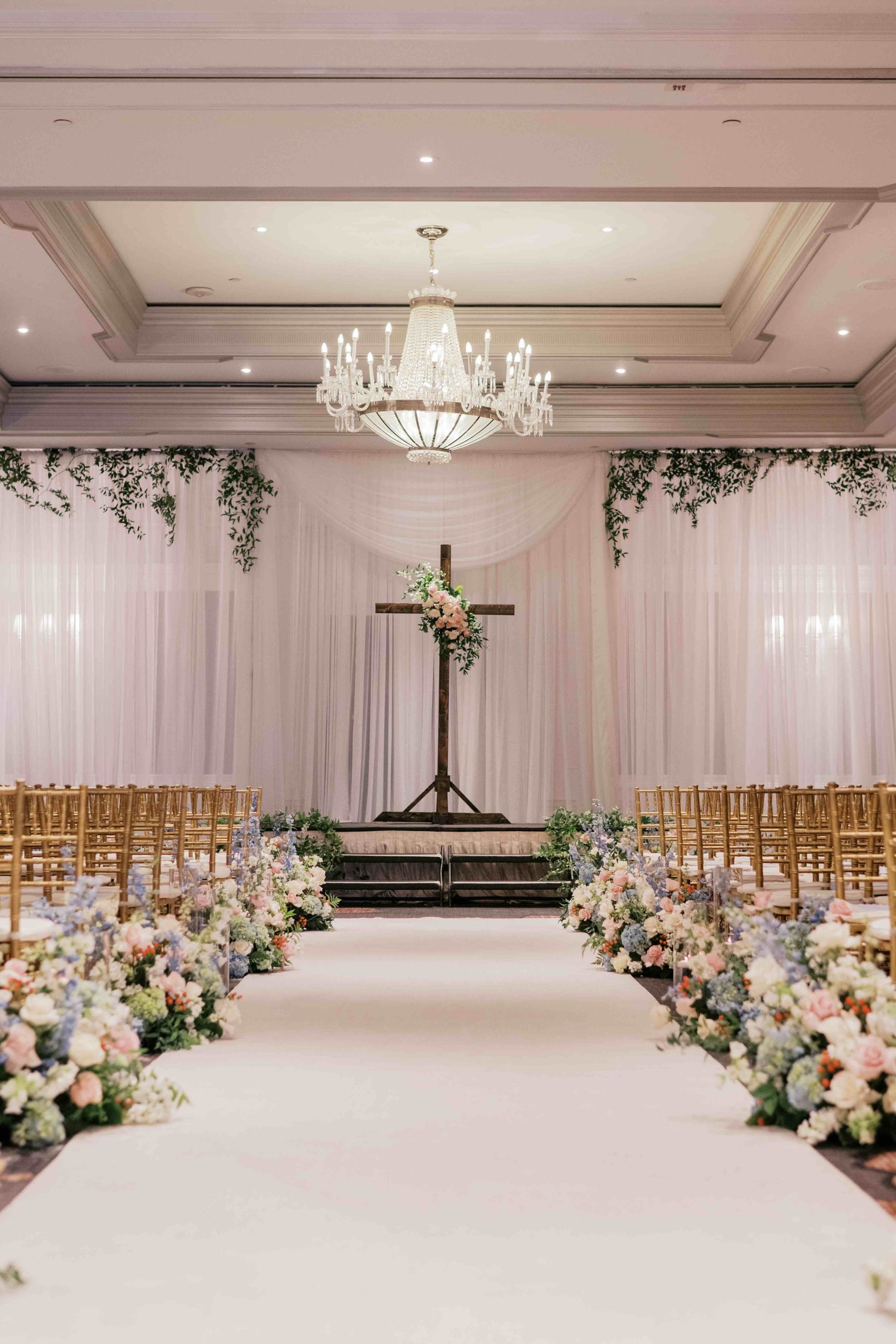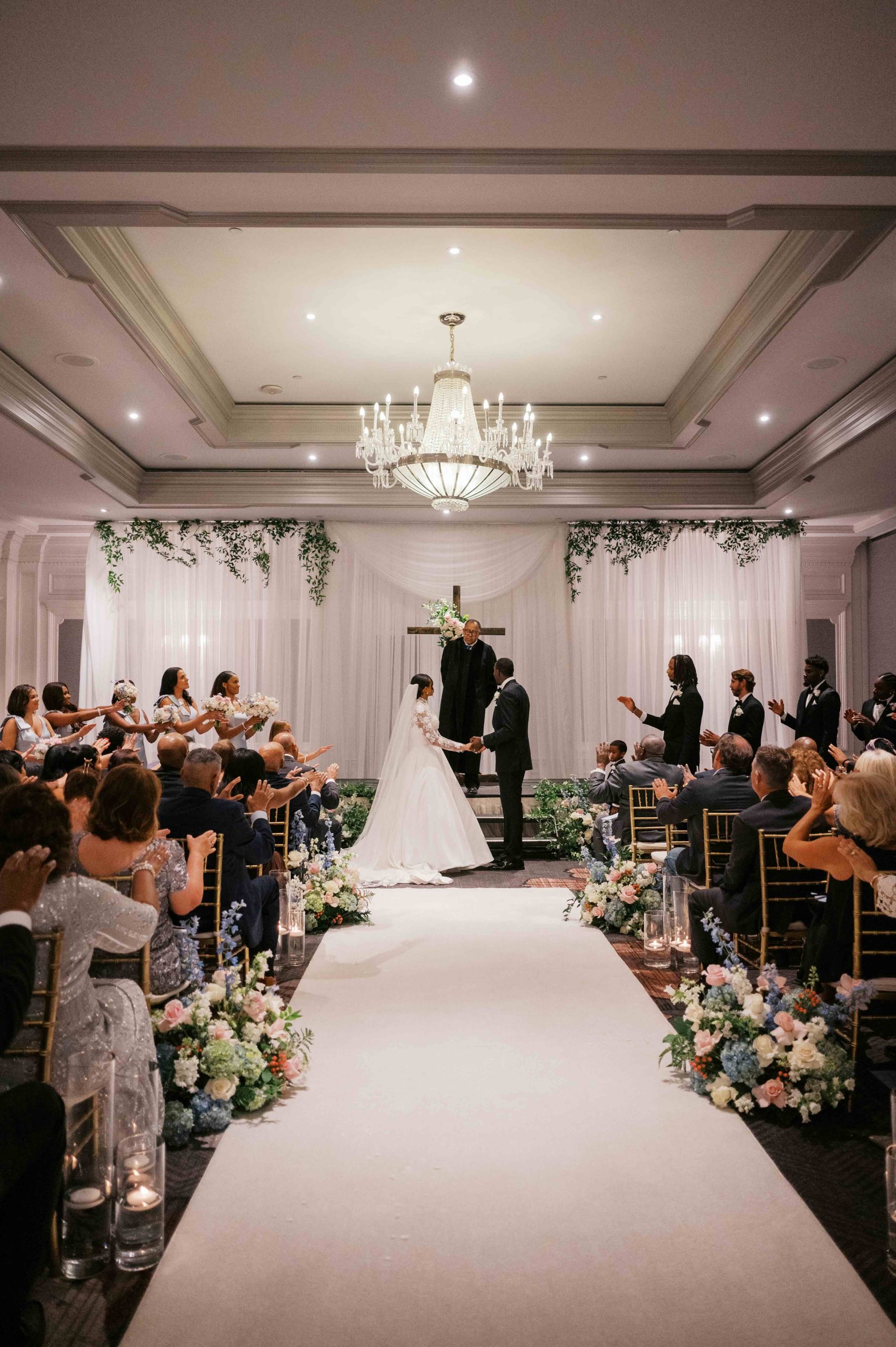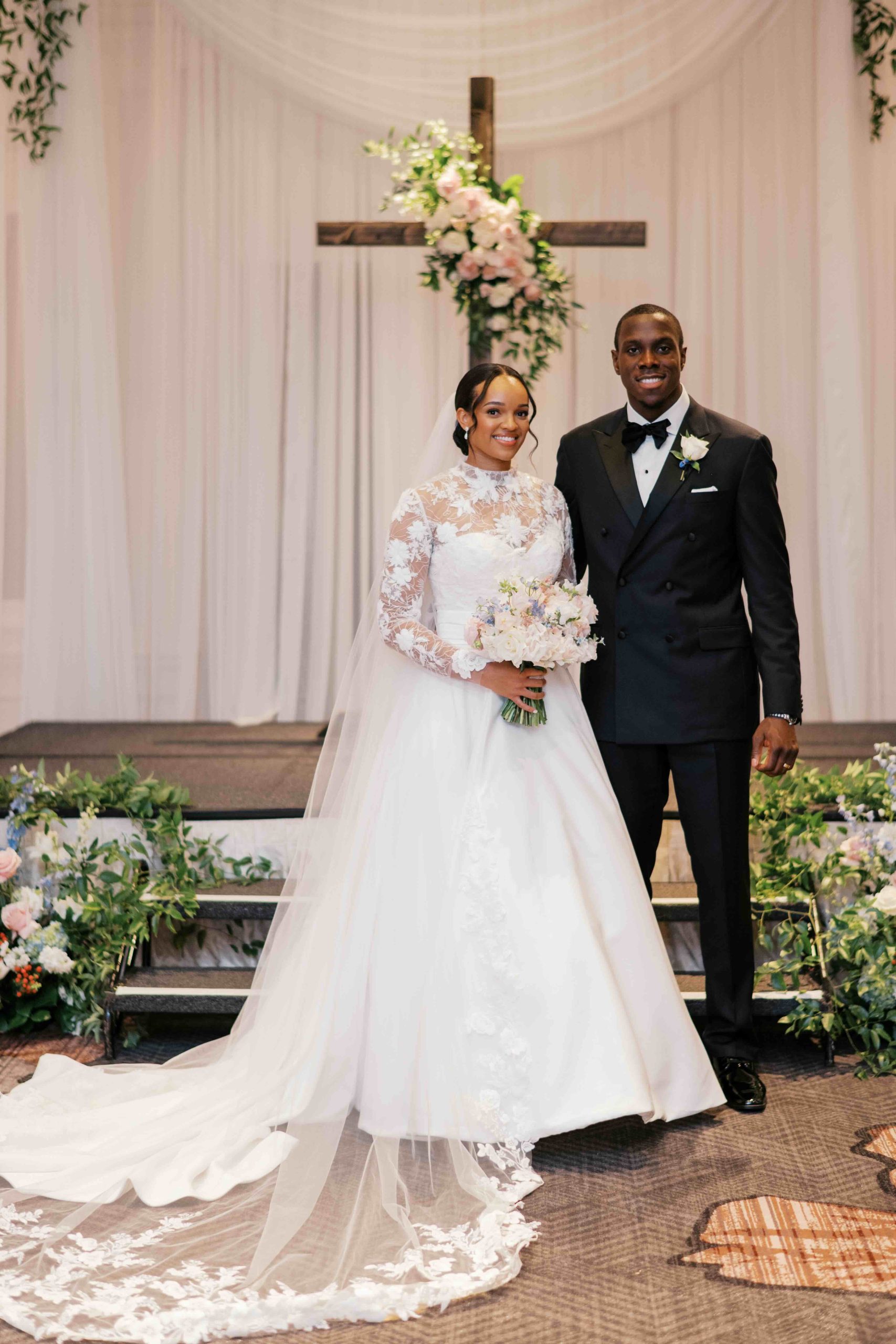 On their wedding day, Lauren and Jonathan chose to forego a first look, saving that moment for the ceremony. As Lauren walked down an aisle flanked by lush pastel blooms, Jonathan’s authentic, emotional reaction set the tone for the ceremony that followed. Officiated by Lauren’s childhood pastor and standing before a flower-adorned wooden cross, the ceremony was intimate and centered on their faith.