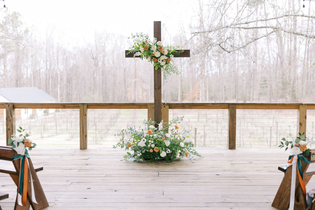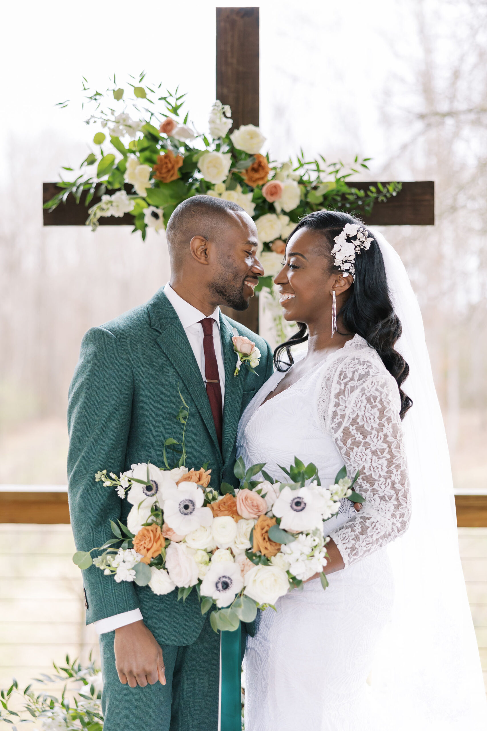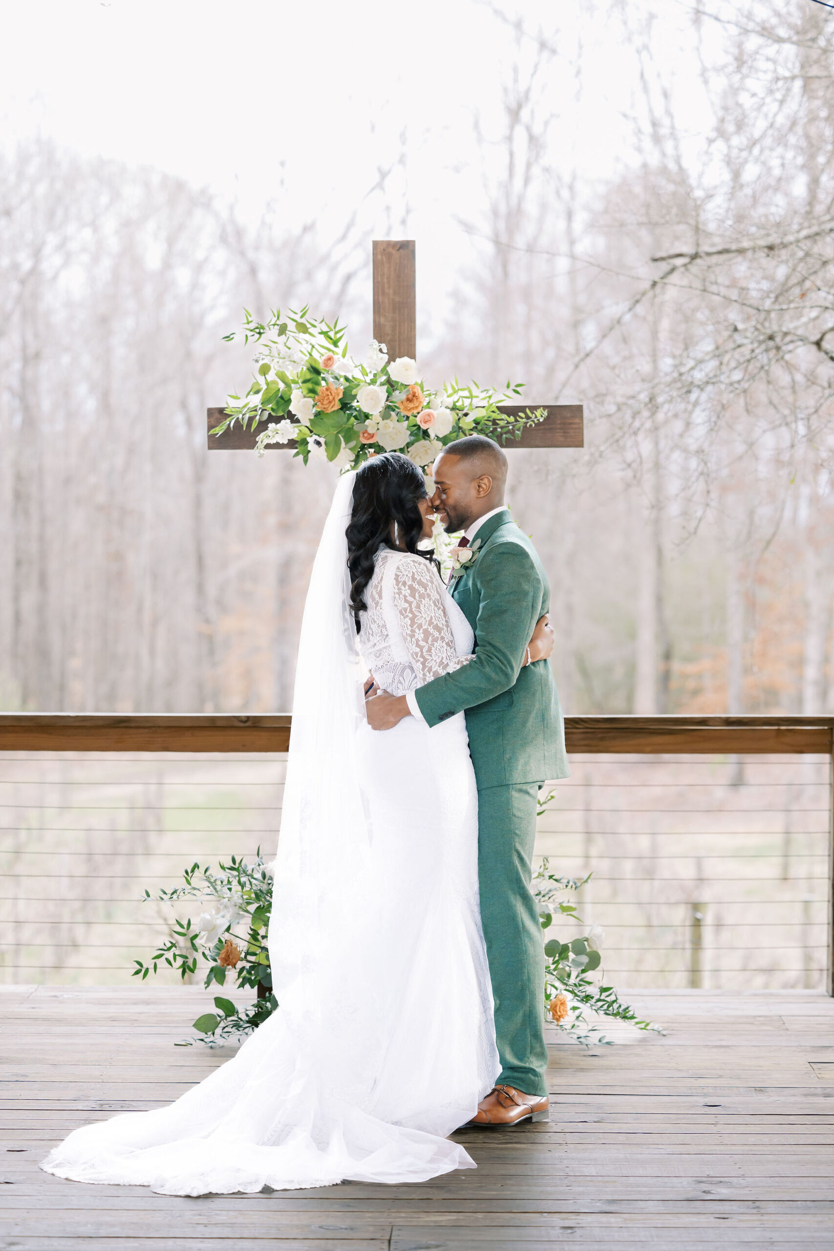 Faith served as the foundation of their day, guiding both their love story and their ceremony. A handcrafted wooden cross adorned with florals stood as the focal point of their vows, a symbolic reminder of the devotion they share. Inside, earthy greenery wove through the space, bringing the beauty of nature indoors. The result was an atmosphere that felt less like an event and more like a heartfelt gathering.