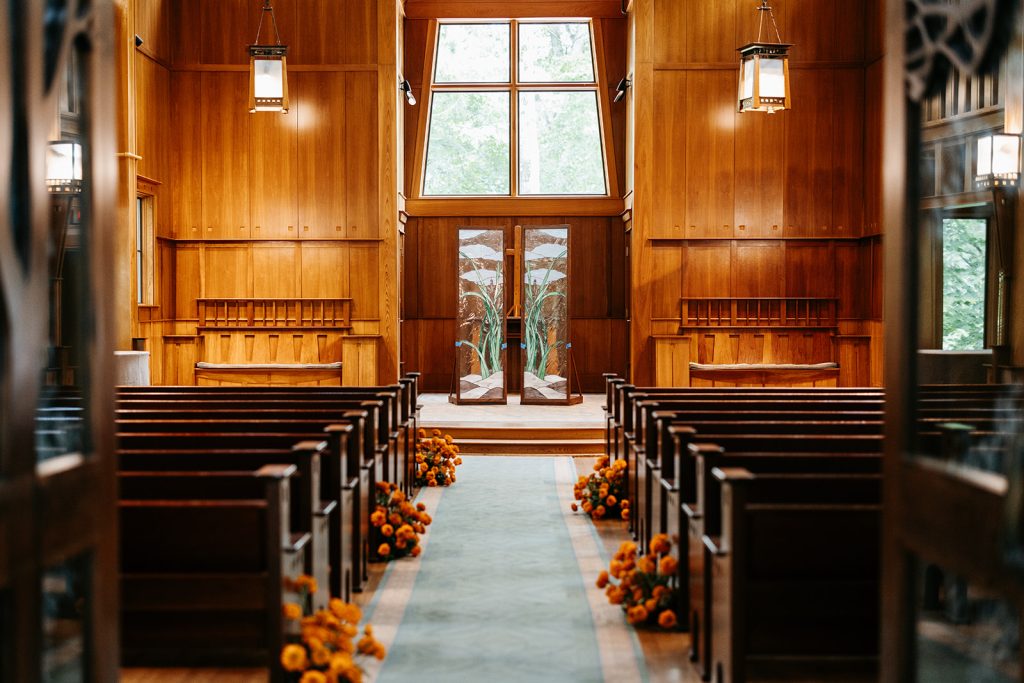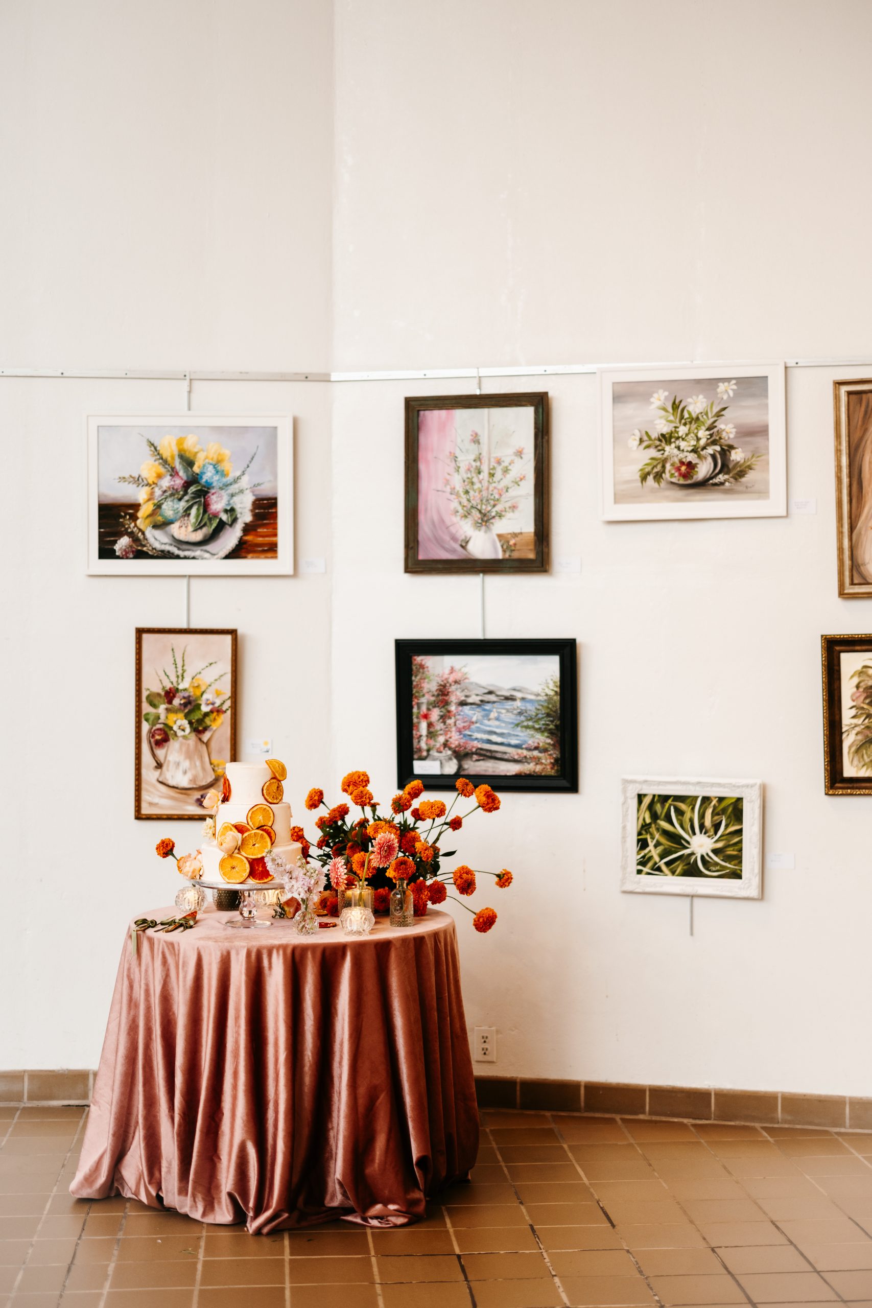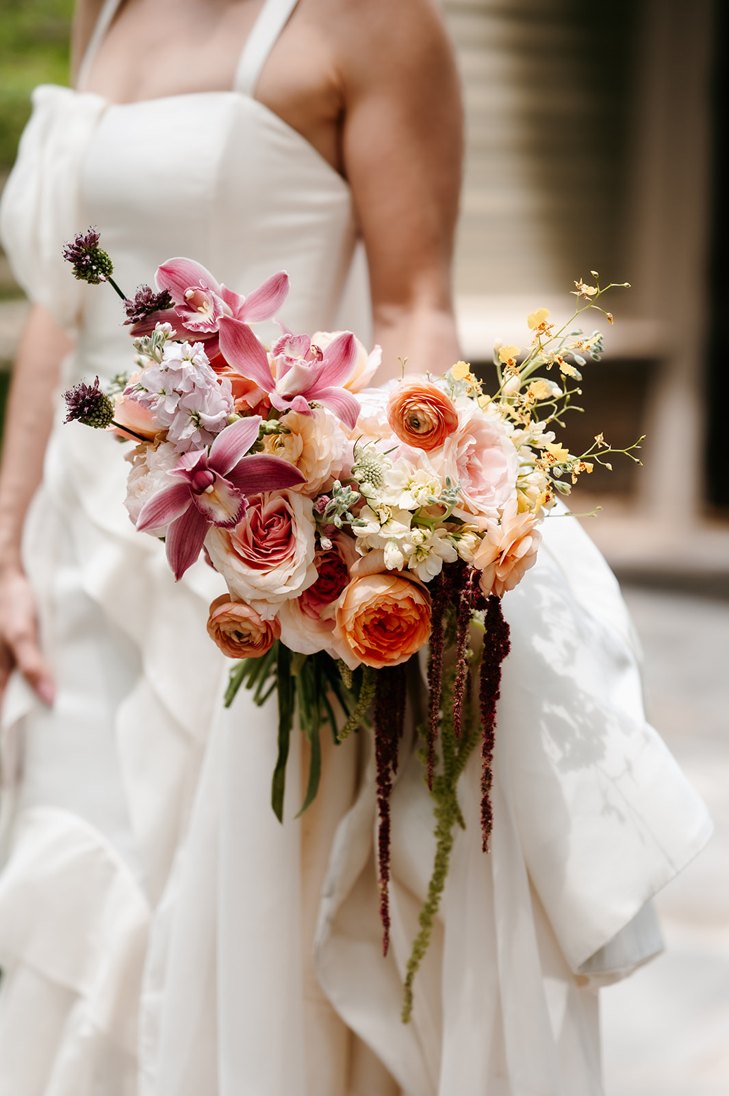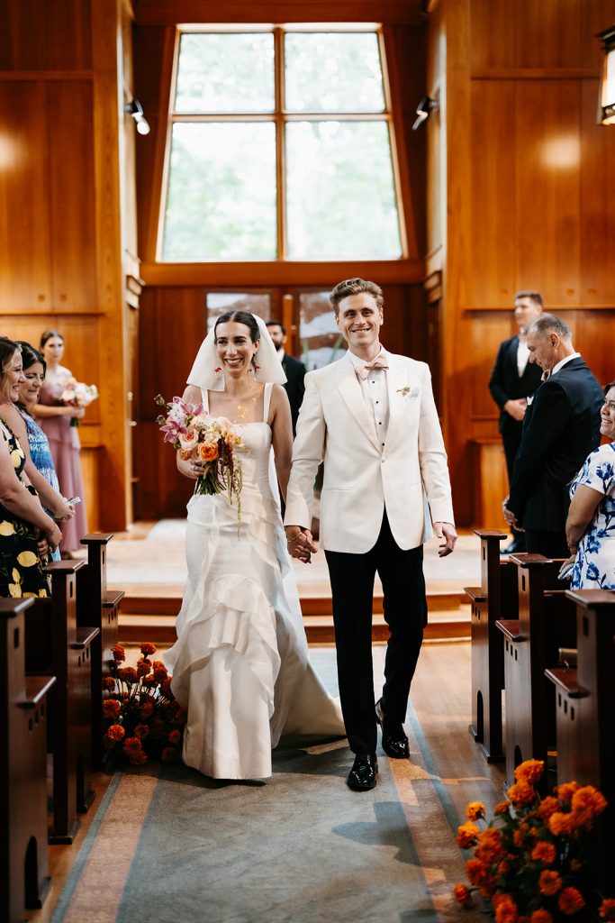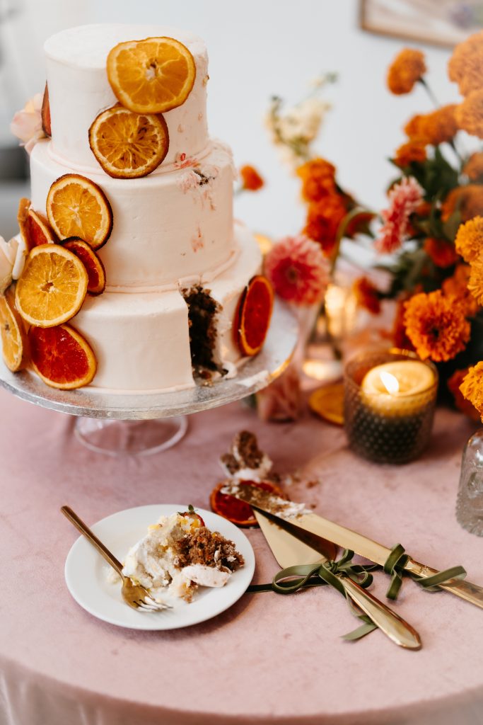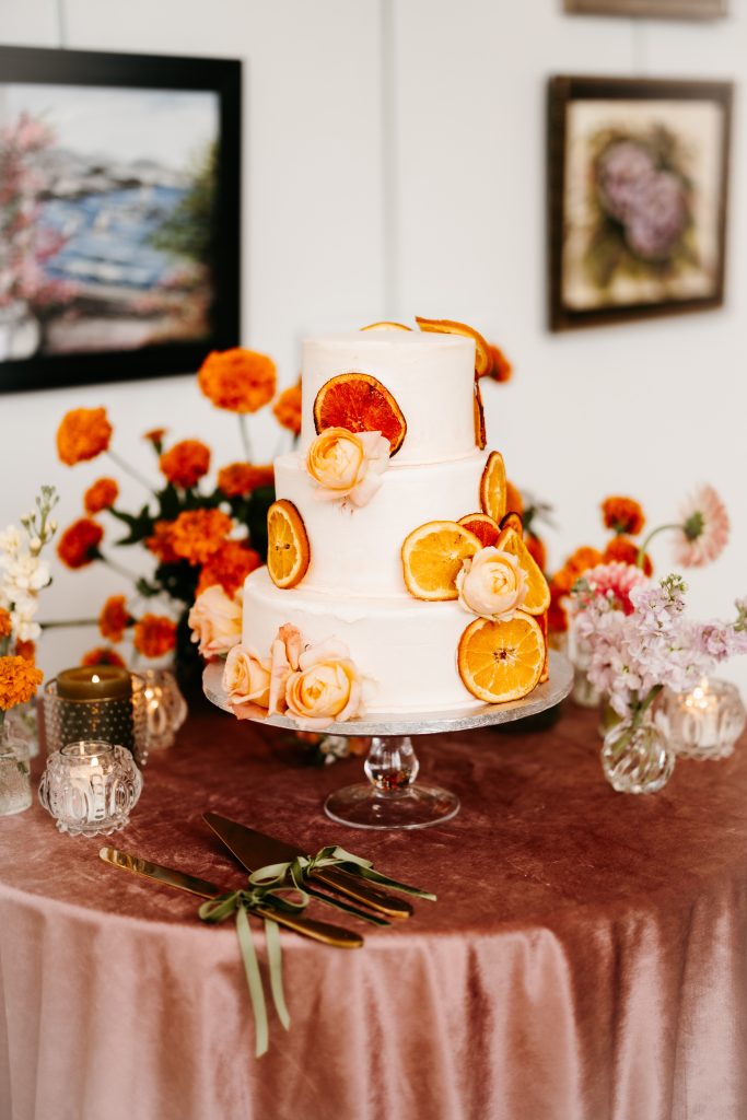 On the day itself, the venue’s natural beauty was brightened further with a citrus-inspired palette of orange, yellow and pink. From marigolds lining the chapel aisle to a carrot cake topped with candied orange slices, every detail added a fresh pop of color to an already enchanting backdrop.