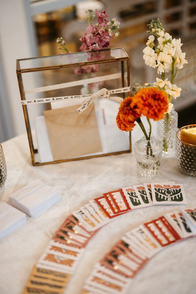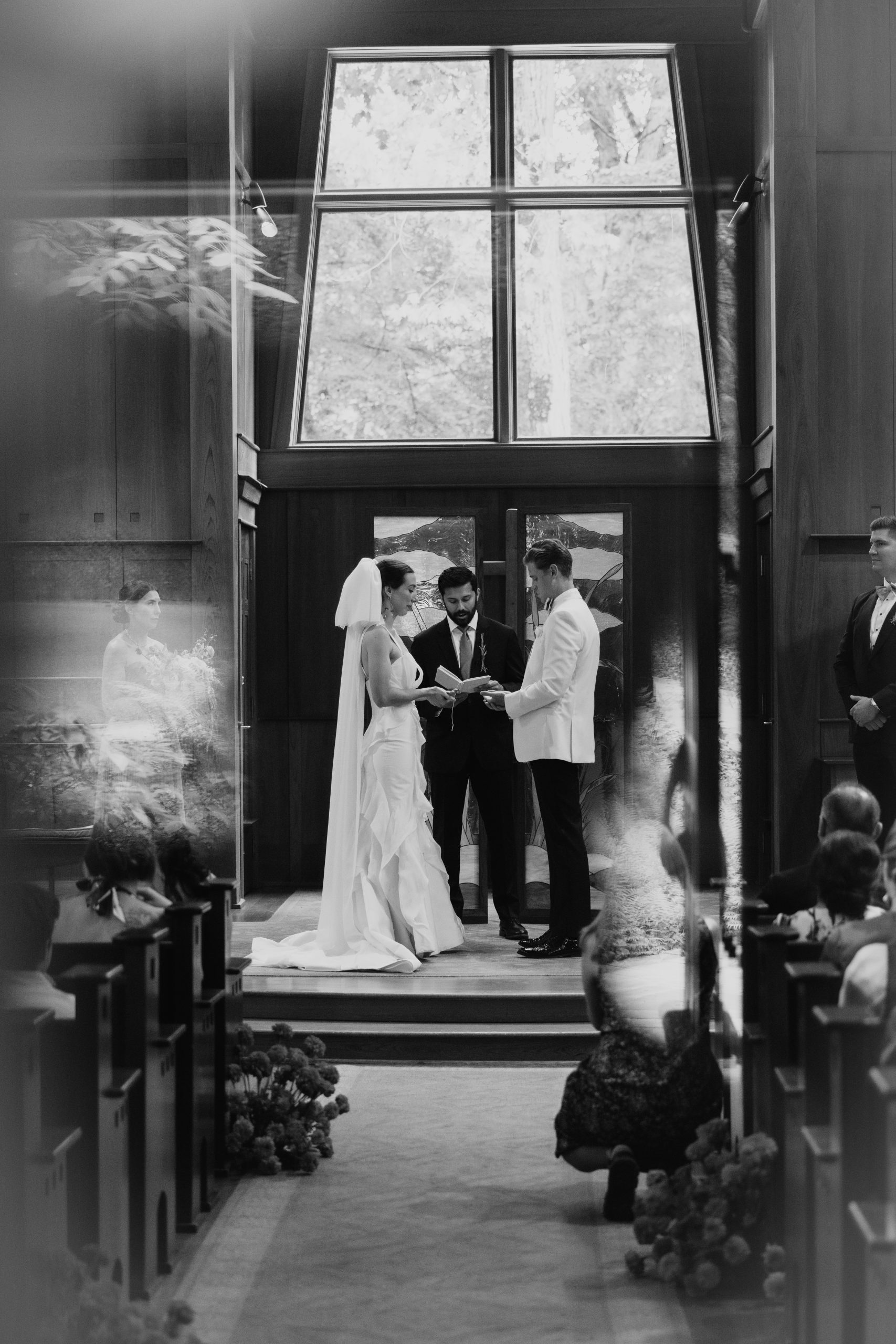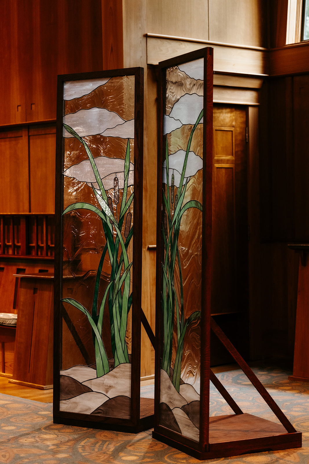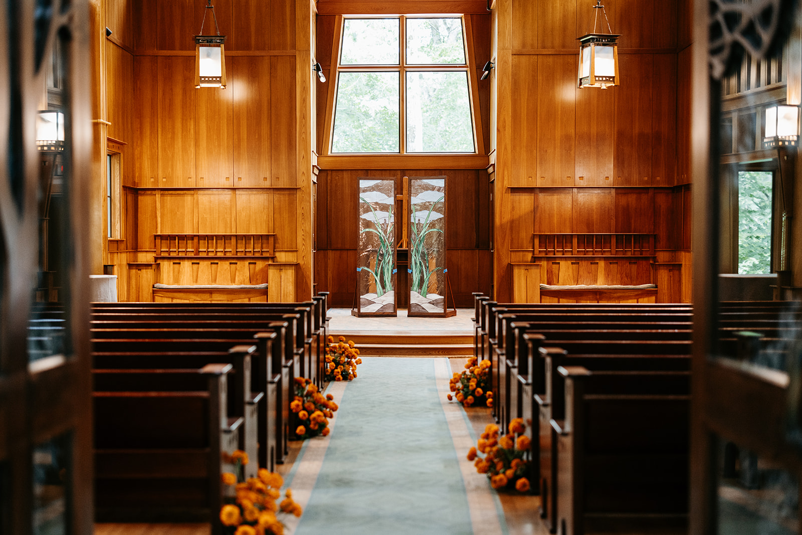 Their wedding day reflected not only their relationship, but also their families and histories. Sean has long admired the Tudor-style homes of his Milwaukee suburb hometown, especially their stained-glass windows and intricate woodwork. To weave this influence into the ceremony, Izabela sourced two vintage stained-glass panels, which were then framed in oak by a local craftsman. Today, those pieces hang in the couple’s living room as daily reminders of their favorite day.