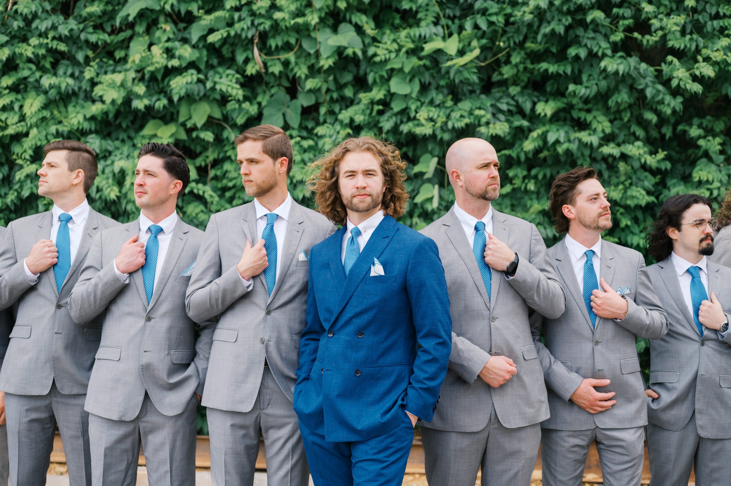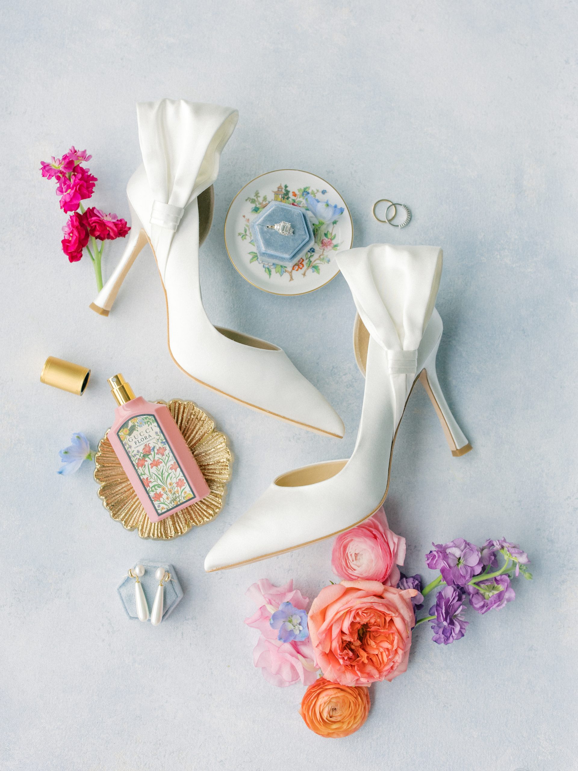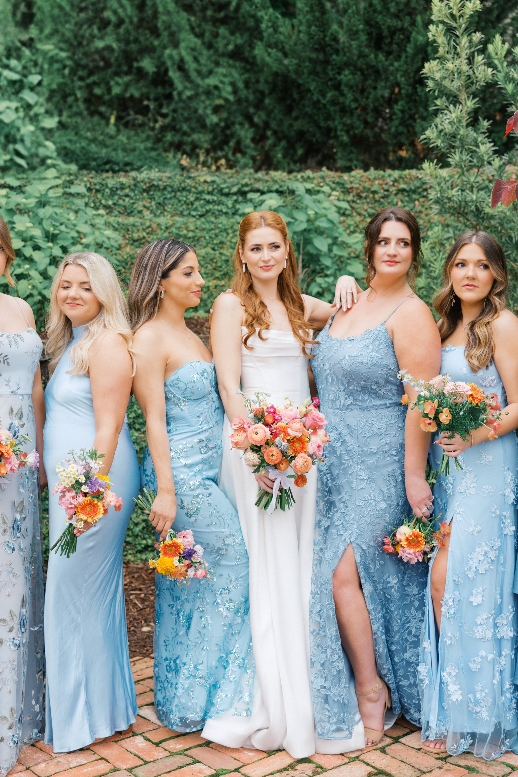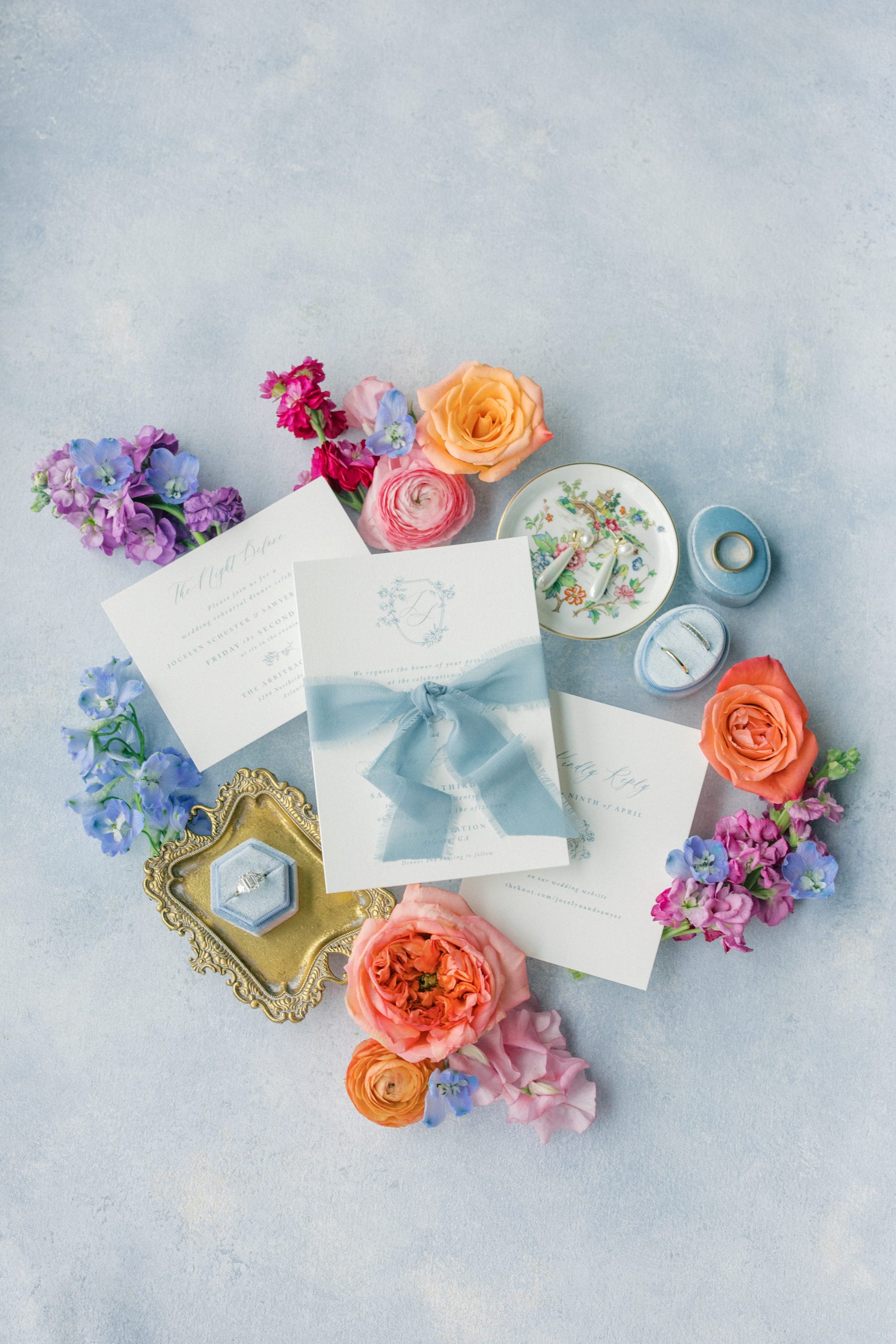 That same sense of thoughtful intention carried seamlessly into their wedding day. At Bishop Station, French blue anchored the palette, complemented by a spectrum of vibrant summer hues. The couple’s vision drew from the romance of Jane Austen and the playful elegance of Bridgerton, marrying modern high-fashion details with an inviting, unpretentious spirit. Guests were encouraged to embrace the theme with attire in sorbet tones, infusing the celebration with even more color and energy. While rooted in the traditions of a classic wedding, every detail was curated with intention, reflecting a relationship defined by joy, warmth and personality.