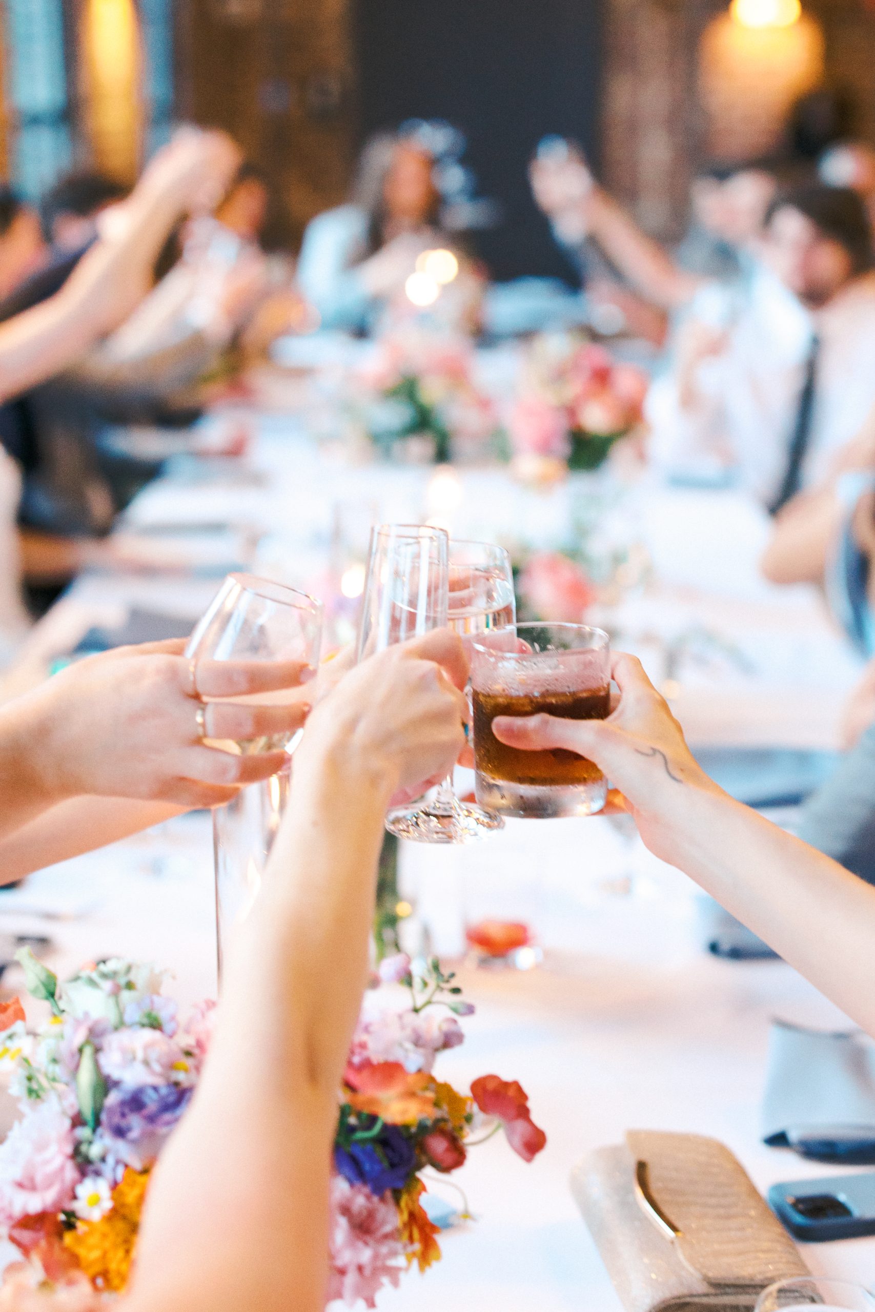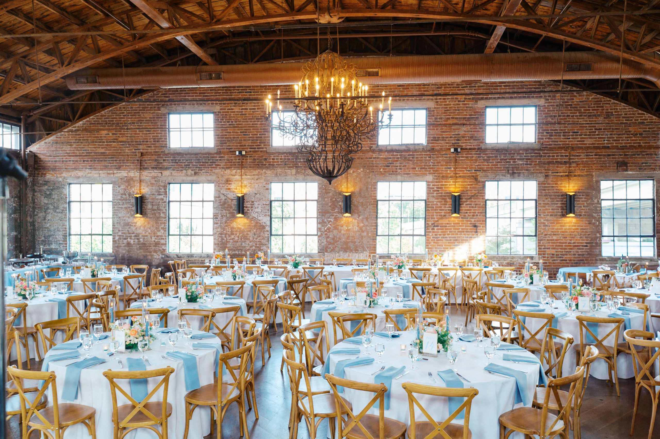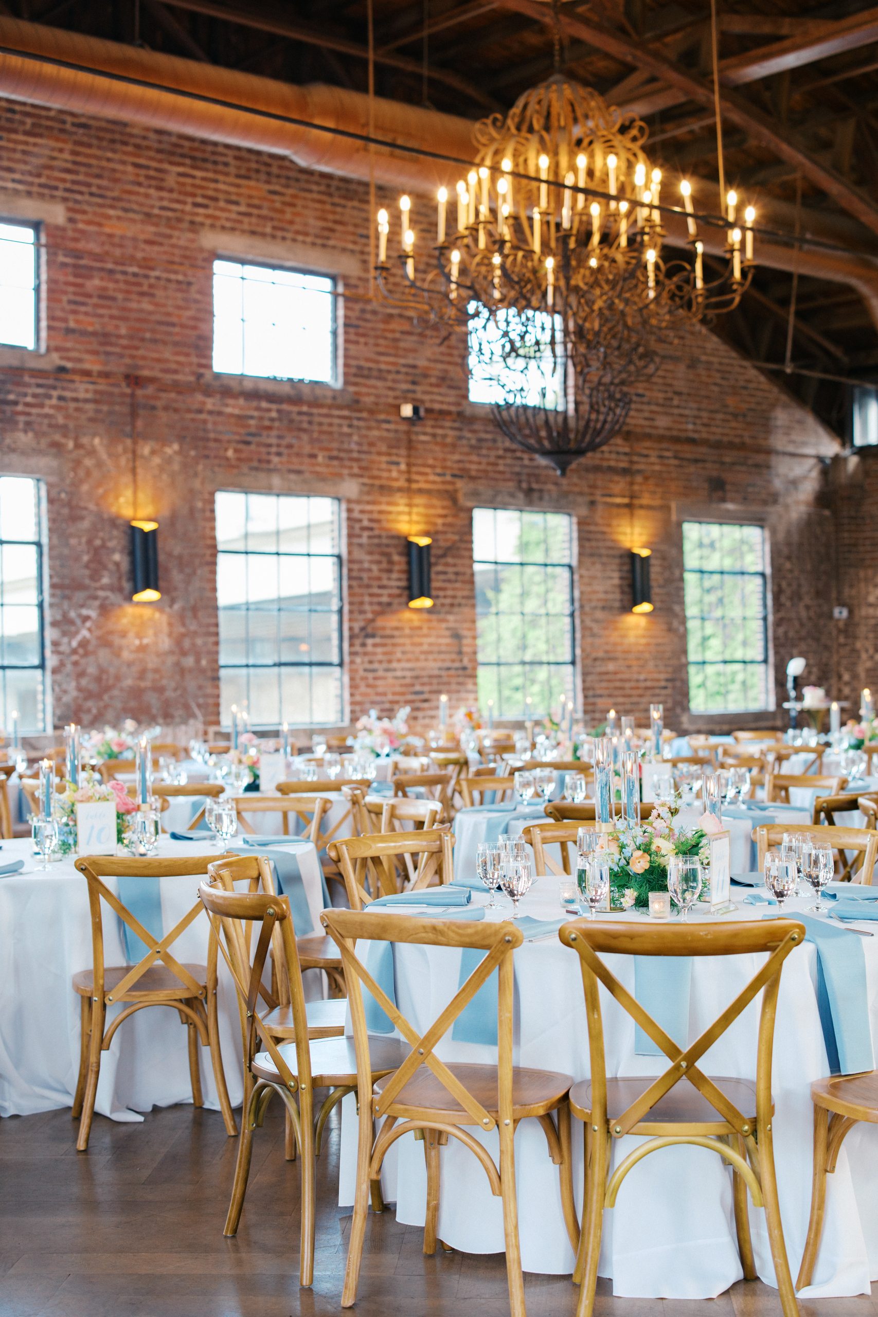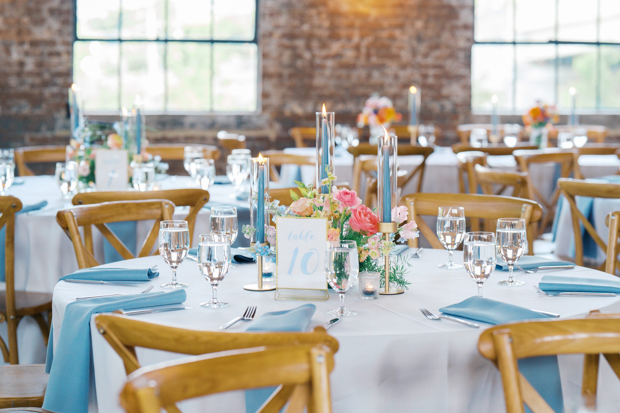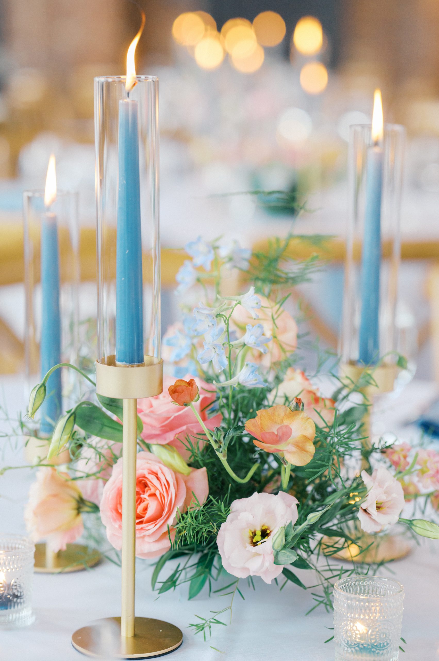 Floral arrangements featuring soft peaches, warm oranges, rich pinks and blue delphiniums felt intentional yet unfussy, bringing depth and color to the day without overshadowing the venue’s relaxed atmosphere or rich 1920s history. Gold accents pulled the tablescapes together, softening the exposed brick and iron elements while balancing the venue’s industrial edge.