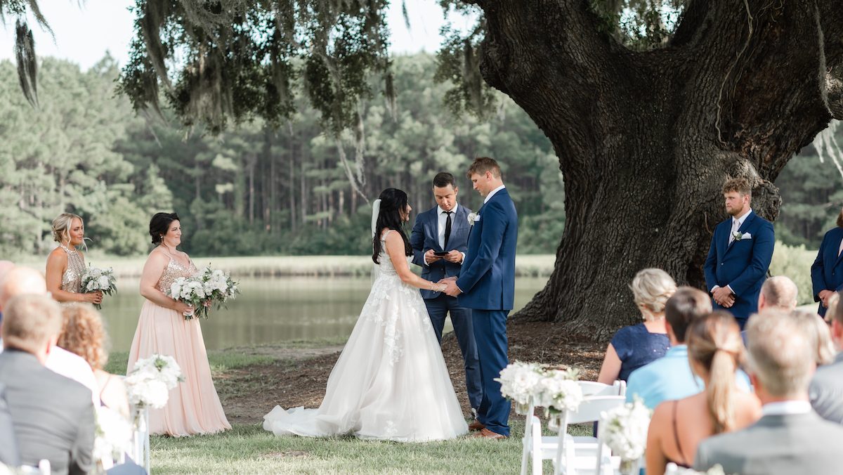 Beautifully lined with crepe myrtles, the winding road to their venue was the perfect introduction to their romantic lowcountry wedding. The pair tied the knot beneath the shade of an old oak tree.