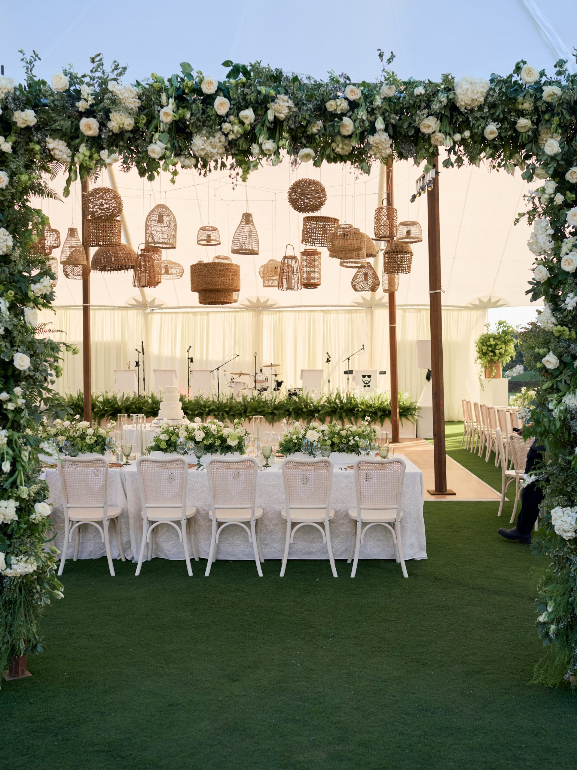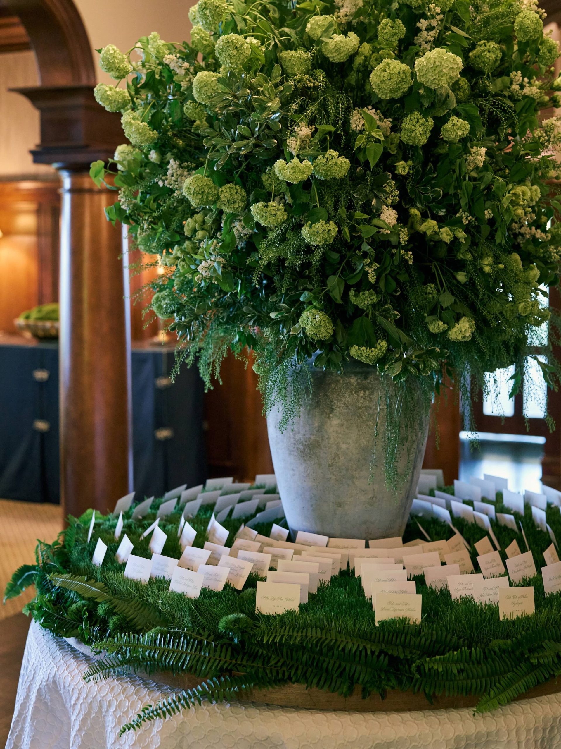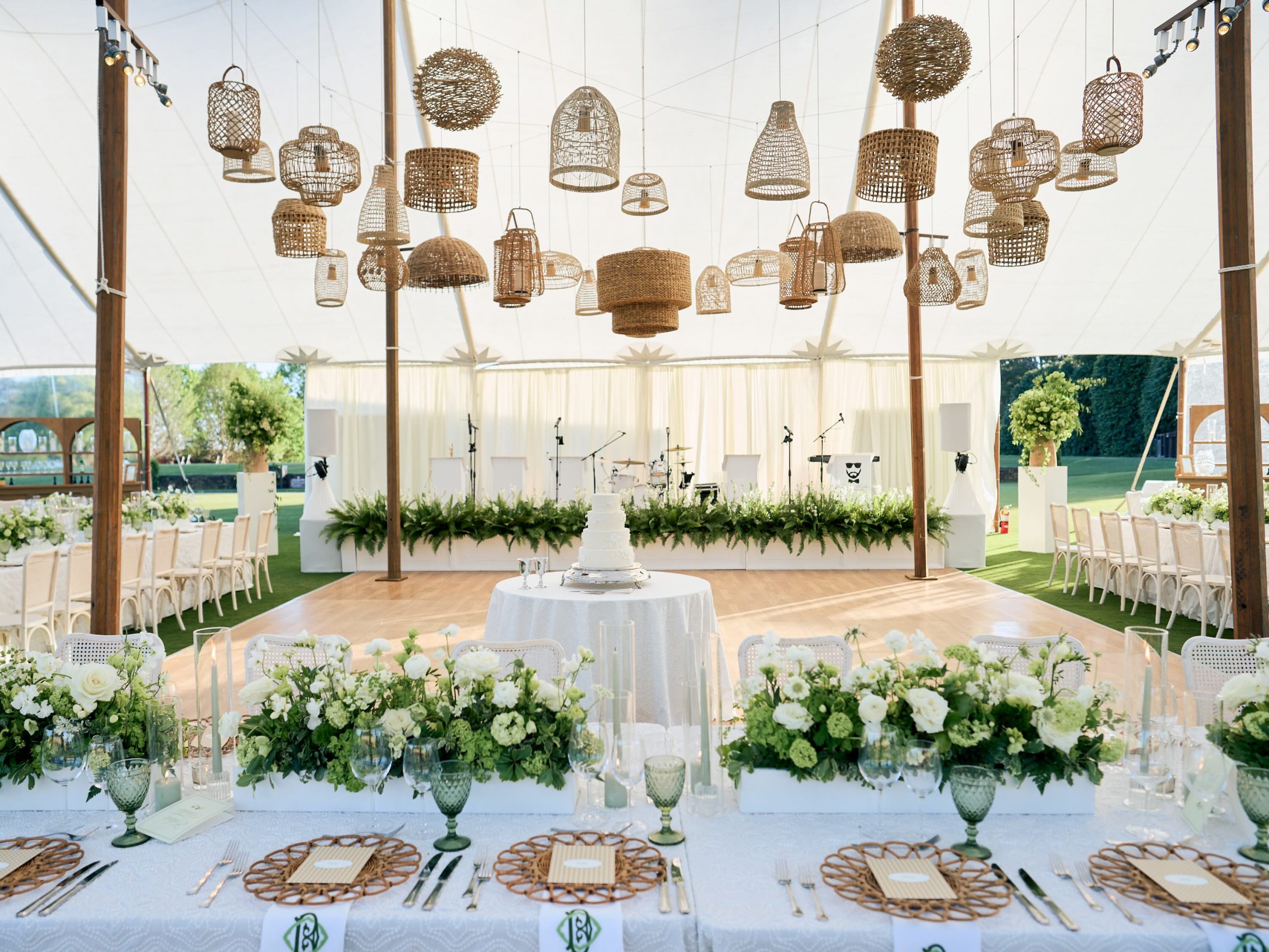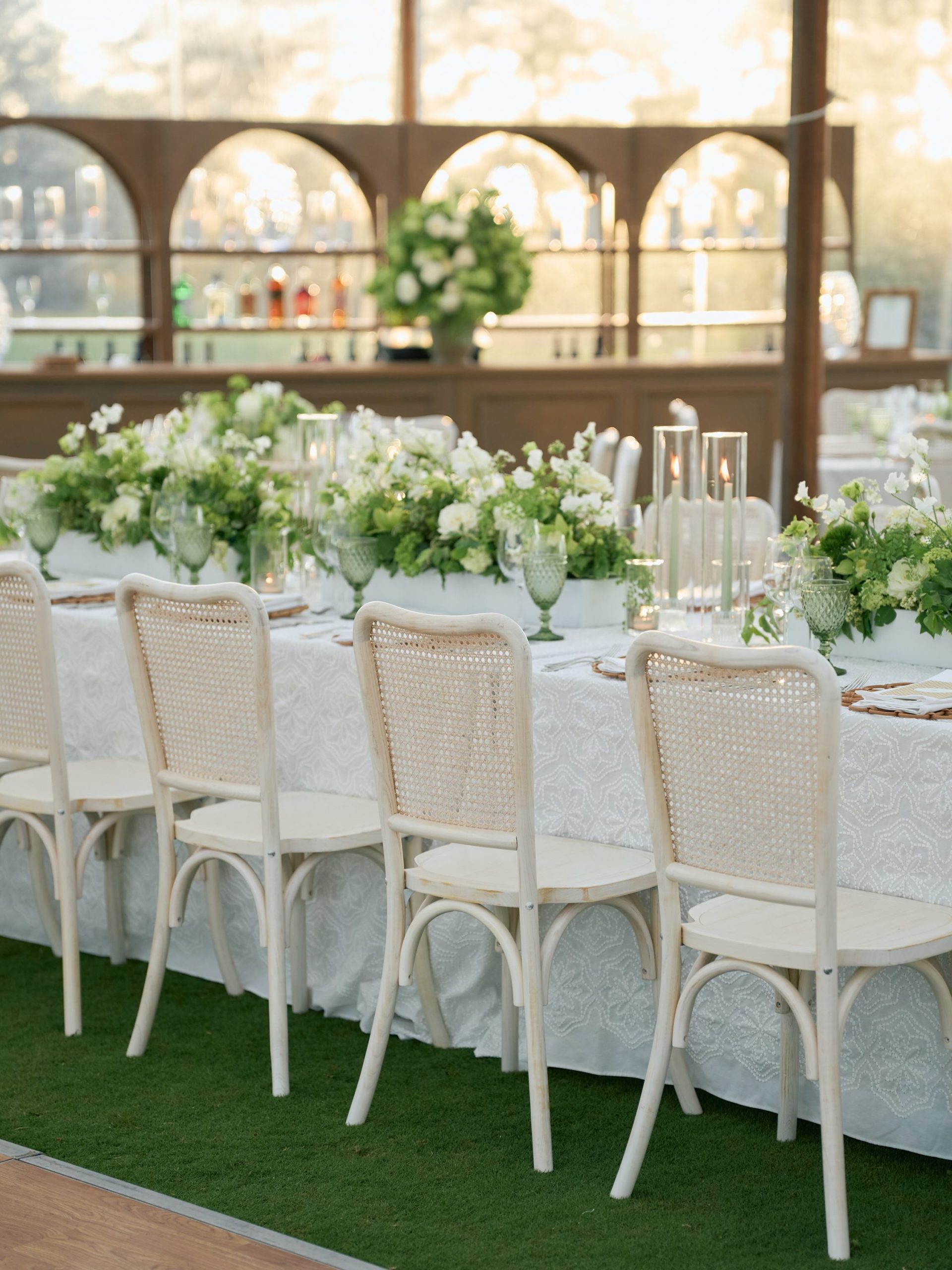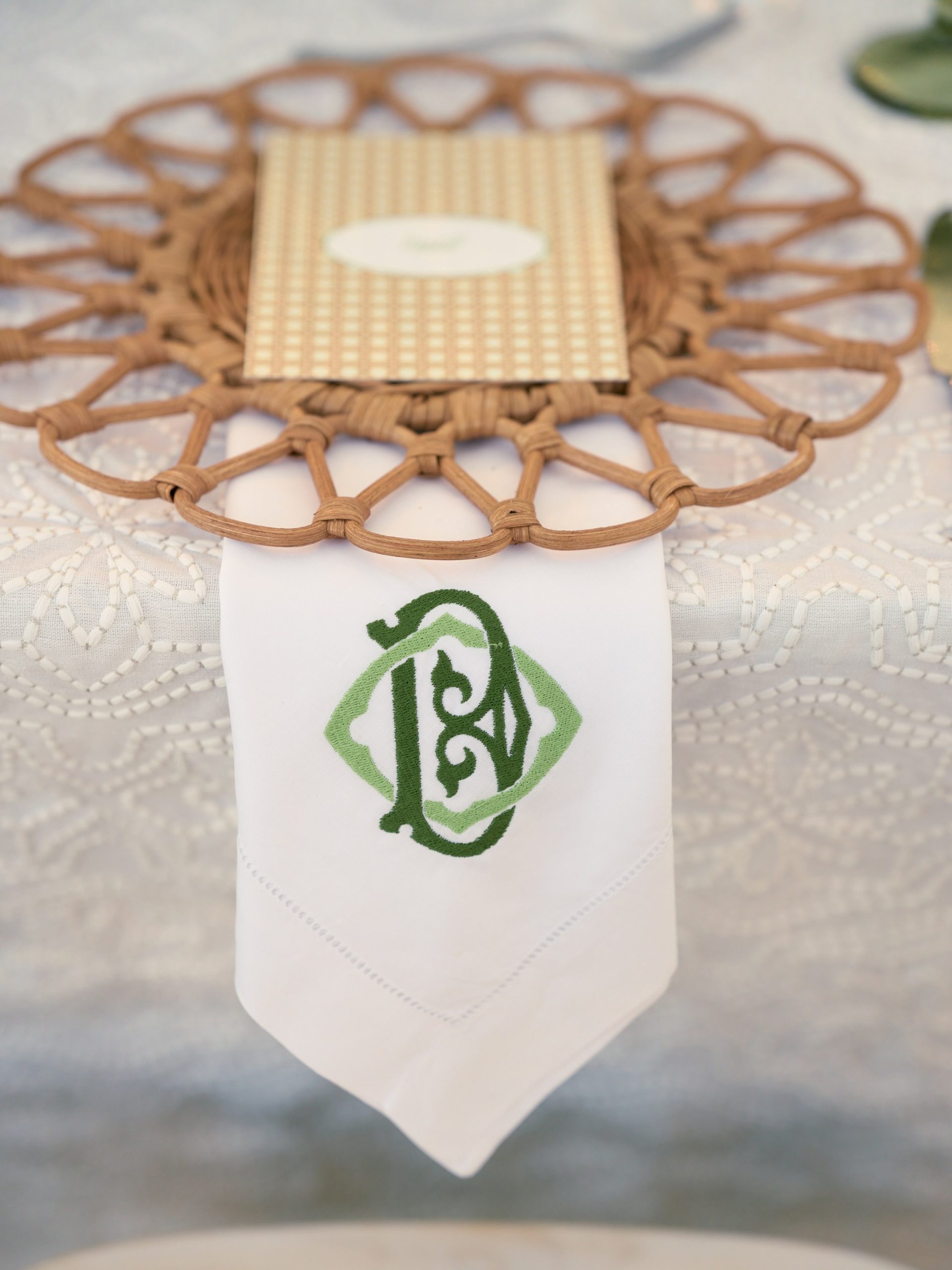 The couple’s design vision was crisp and fresh: shades of green paired with classic whites created a palette that felt like the season itself. Lush arrangements were made of white florals and verdant ferns, while Olivia’s bridesmaids in their green dresses became part of the living tableau. Woven rattan chargers at each place setting echoed the baskets overhead, and custom monogrammed napkins added a personal touch.