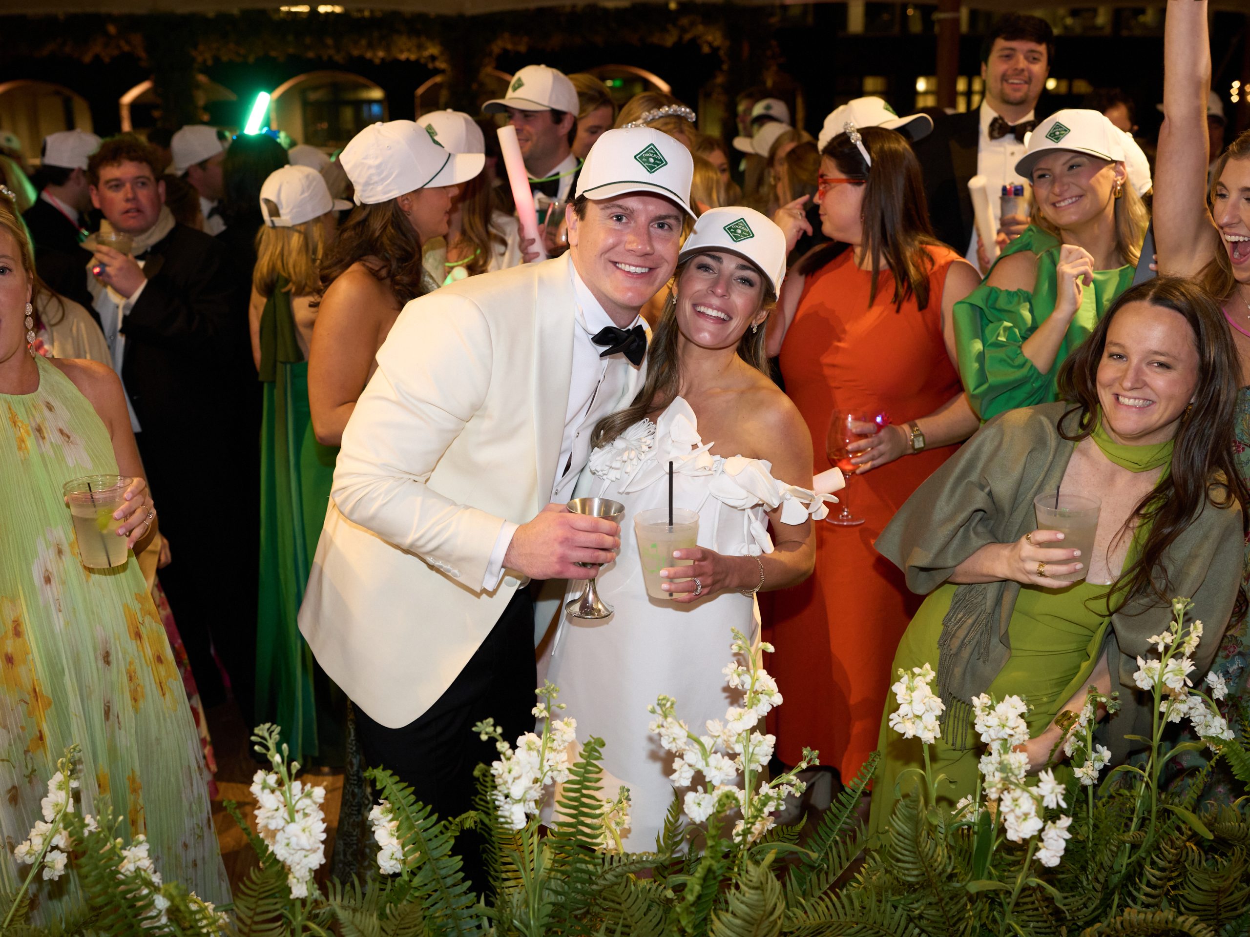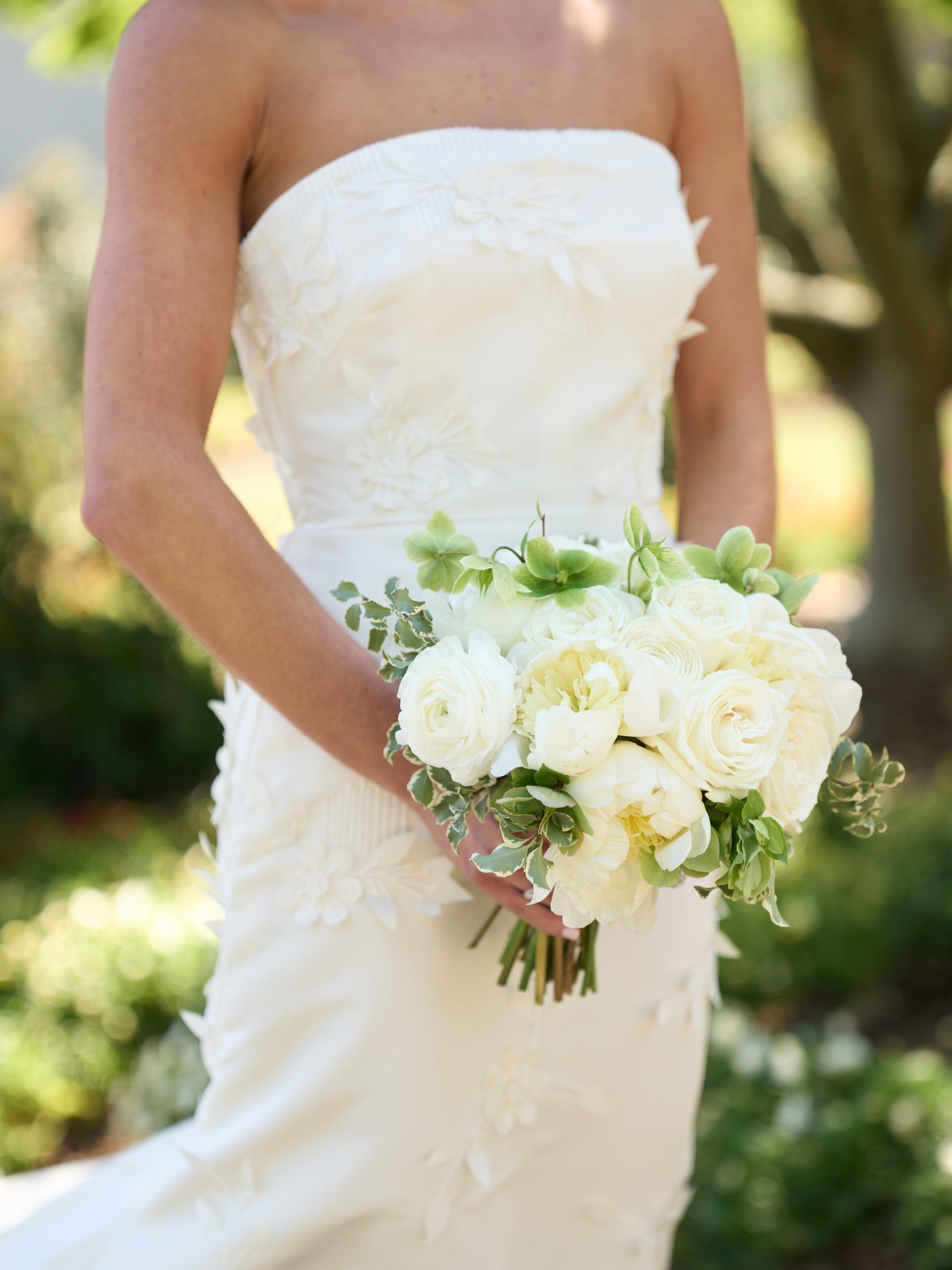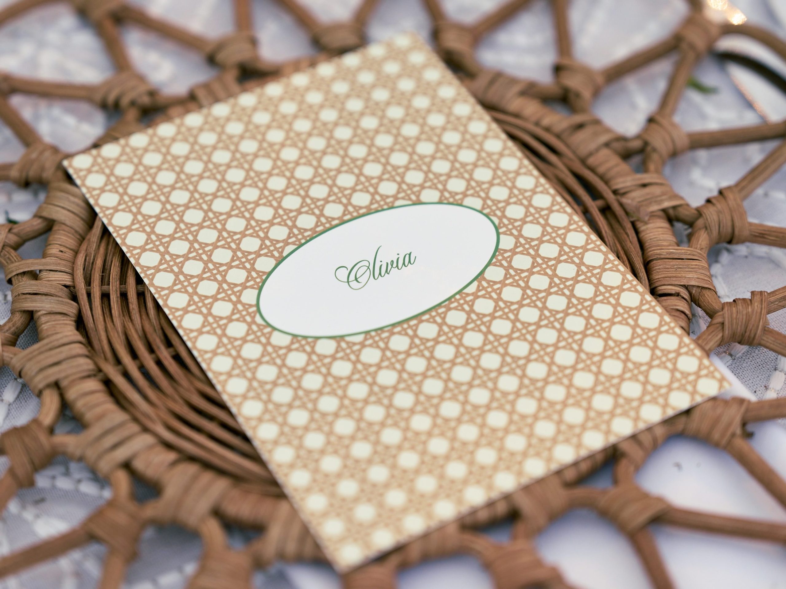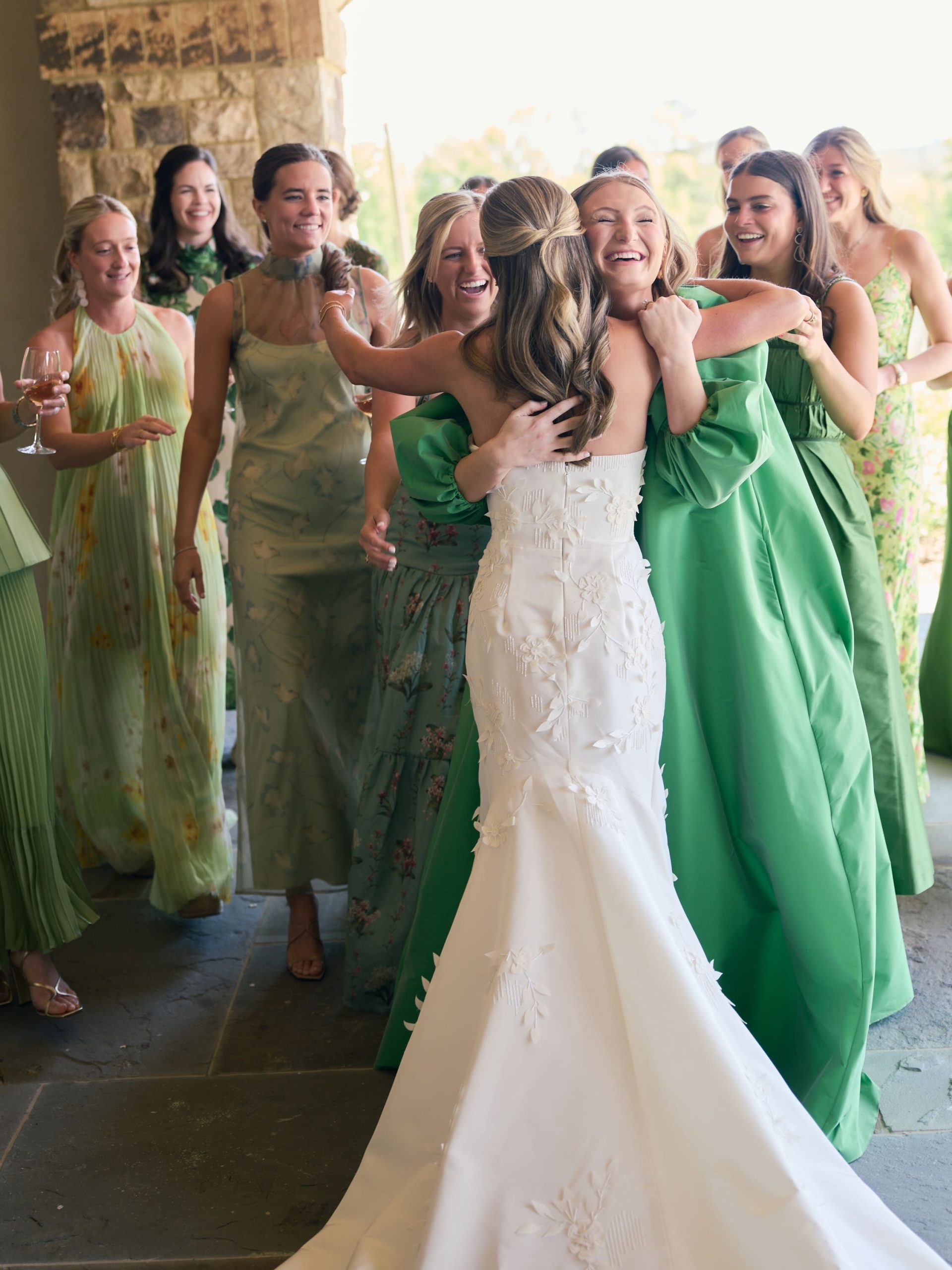 The couple’s design vision was crisp and fresh: shades of green paired with classic whites created a palette that felt like the season itself. Lush arrangements were made of white florals and verdant ferns, while Olivia’s bridesmaids in their green dresses became part of the living tableau. Woven rattan chargers at each place setting echoed the baskets overhead, and custom monogrammed napkins added a personal touch.
