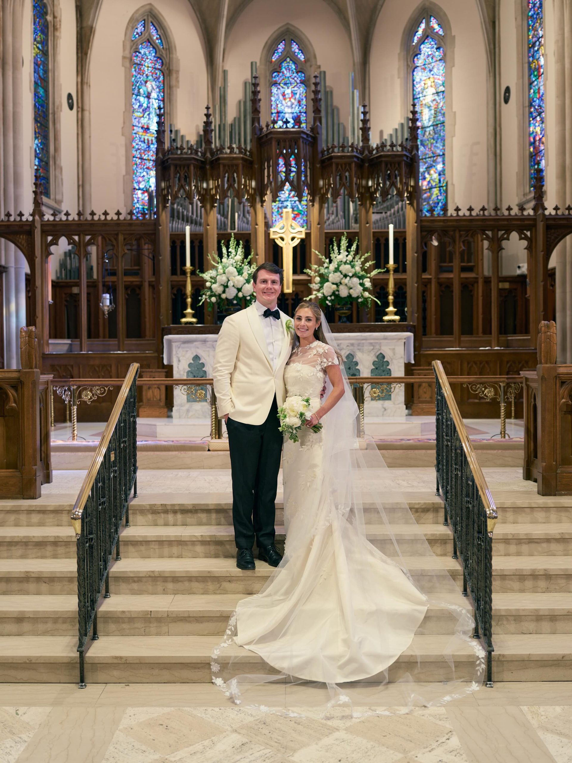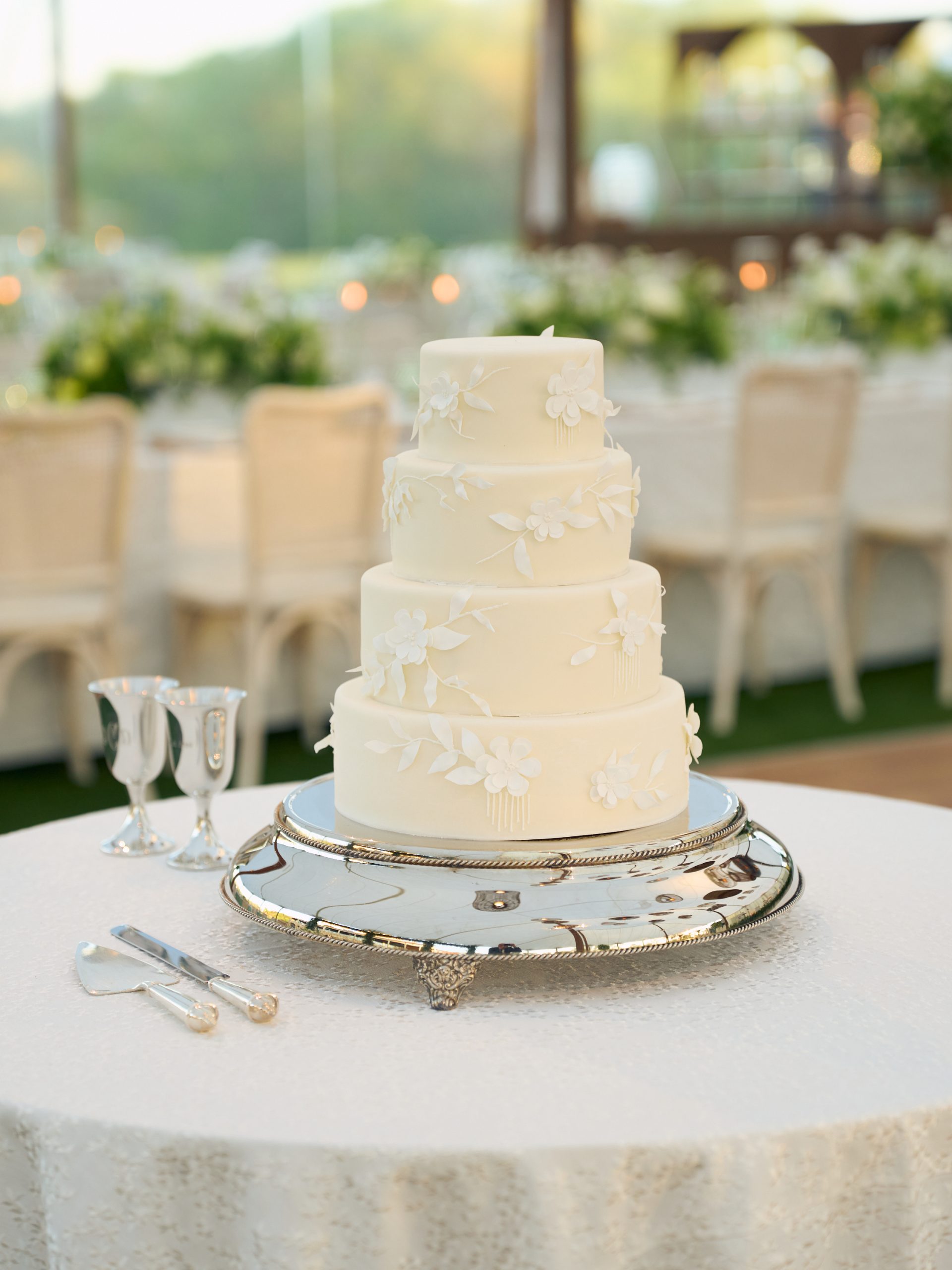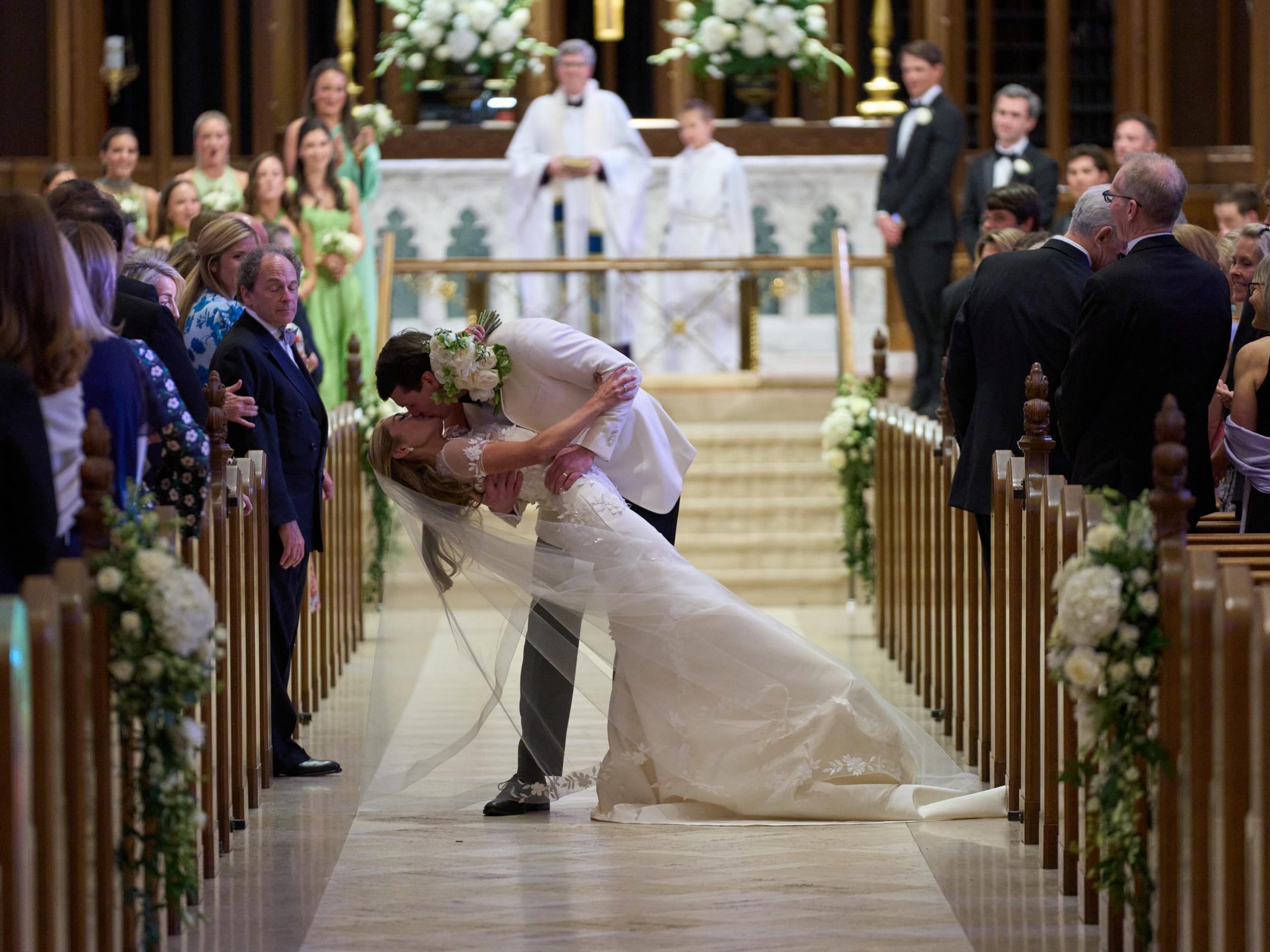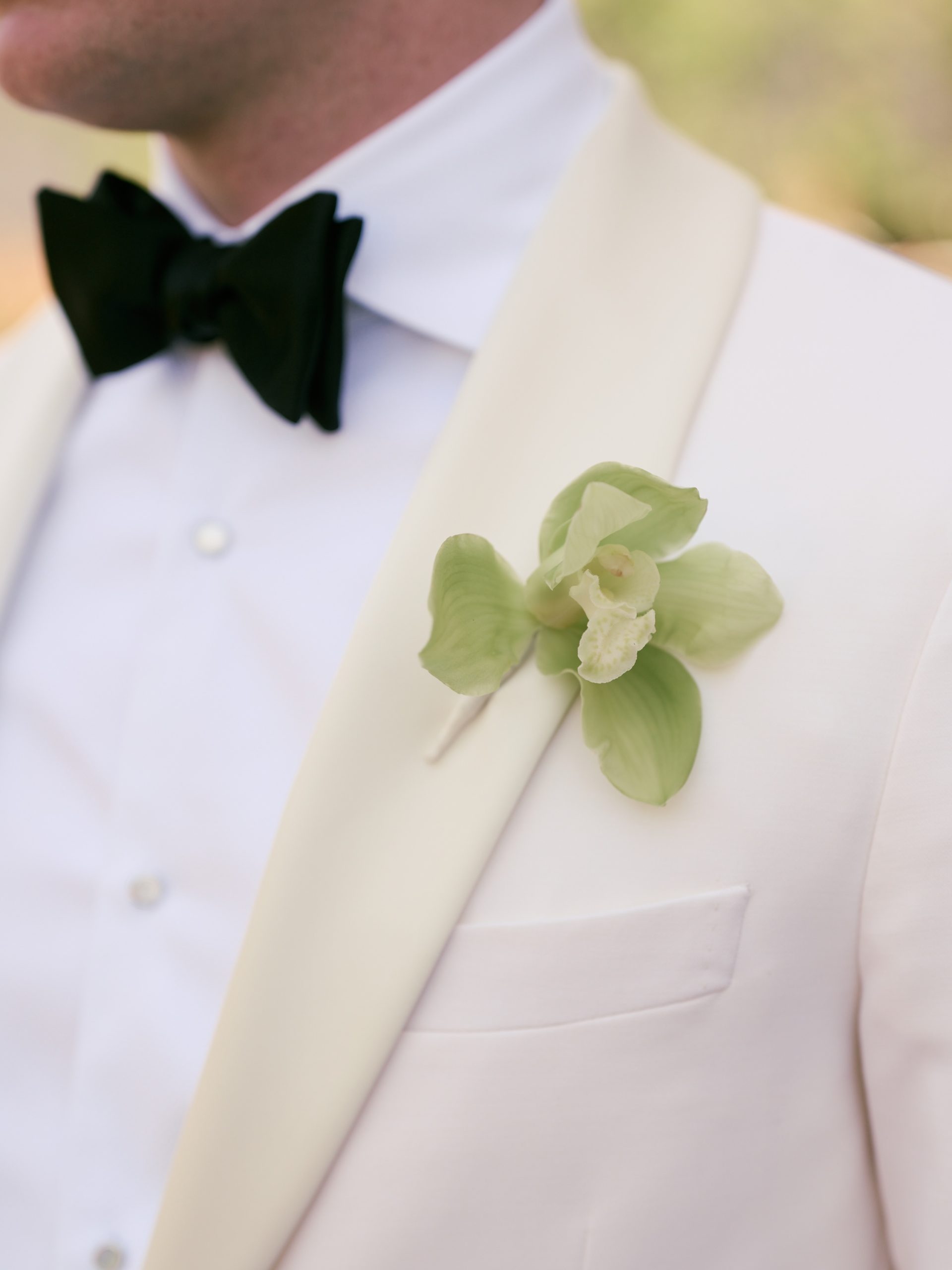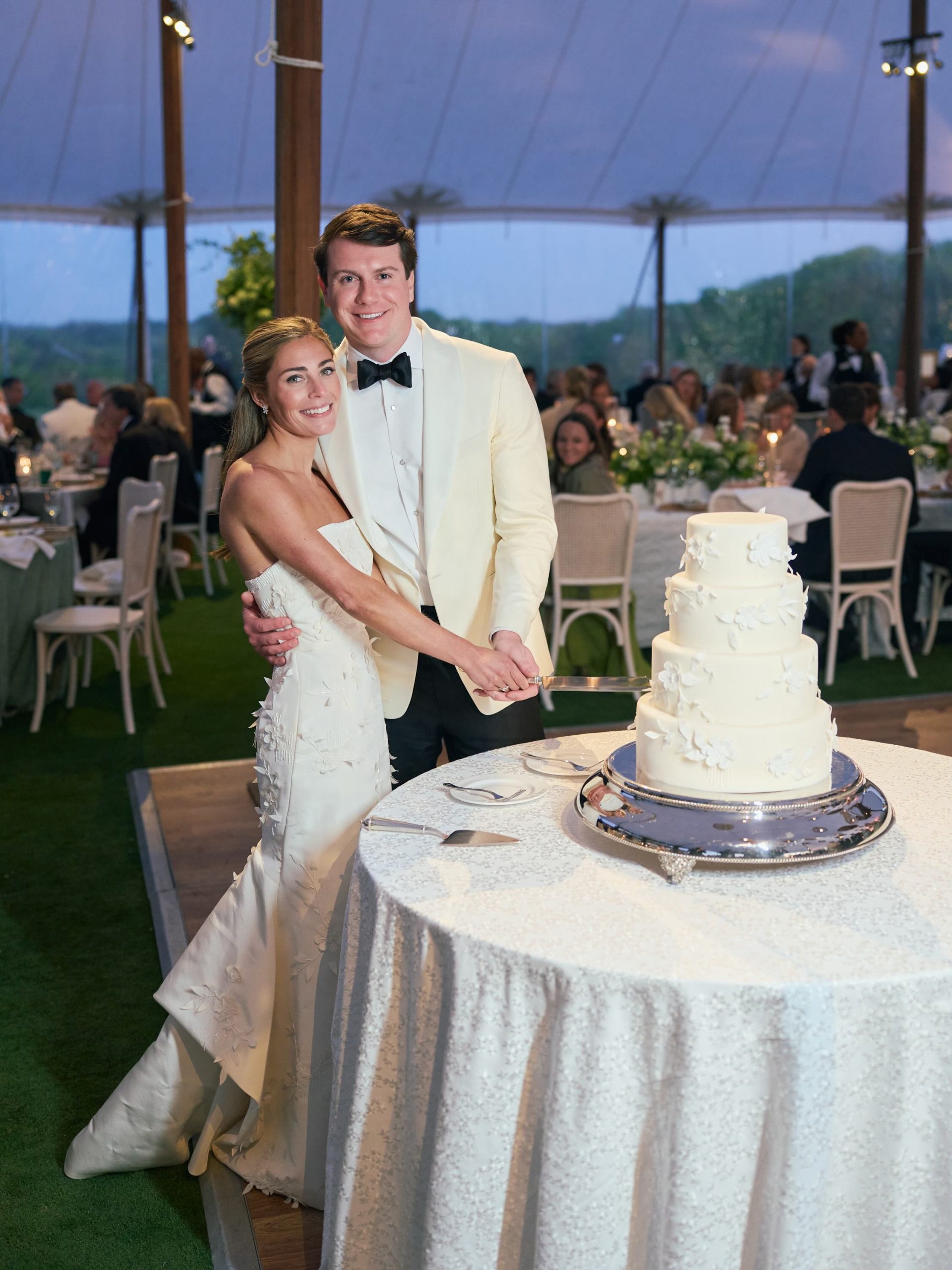 The couple’s design vision was crisp and fresh: shades of green paired with classic whites created a palette that felt like the season itself. Lush arrangements were made of white florals and verdant ferns, while Olivia’s bridesmaids in their green dresses became part of the living tableau. Woven rattan chargers at each place setting echoed the baskets overhead, and custom monogrammed napkins added a personal touch.