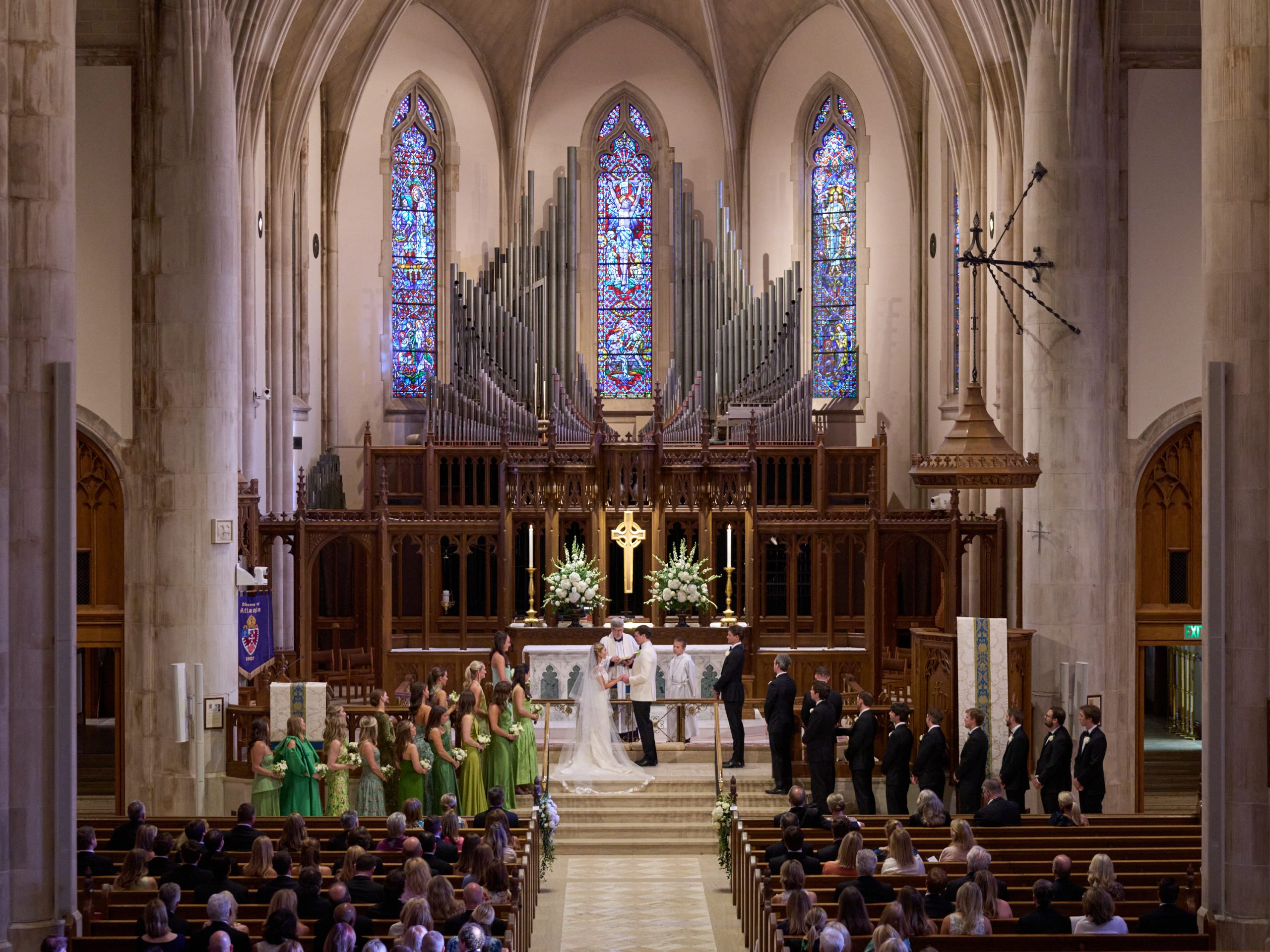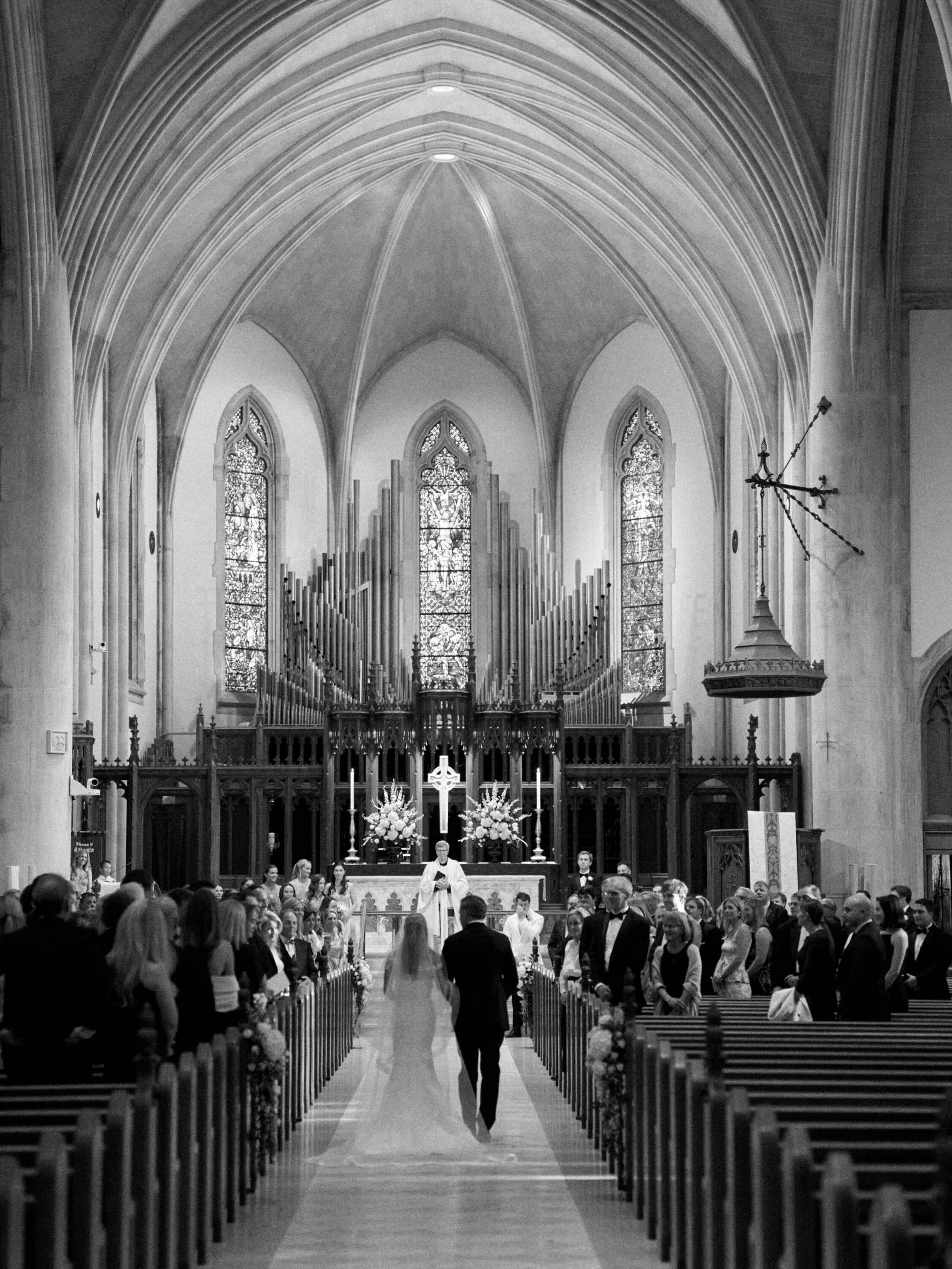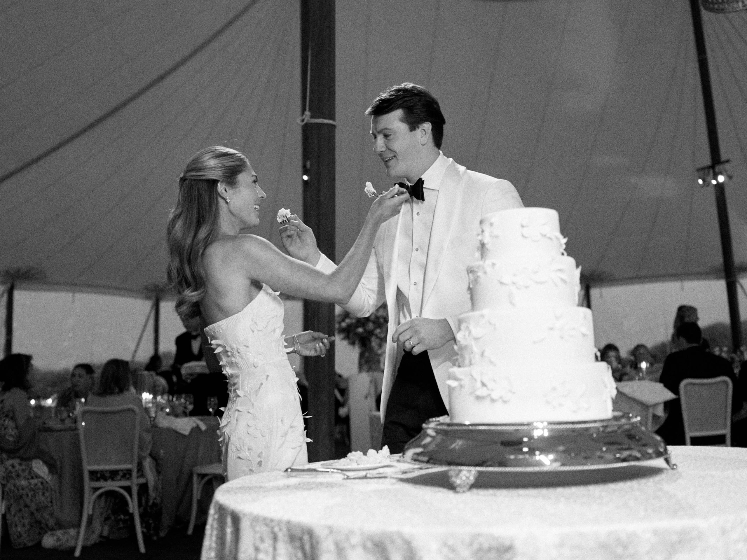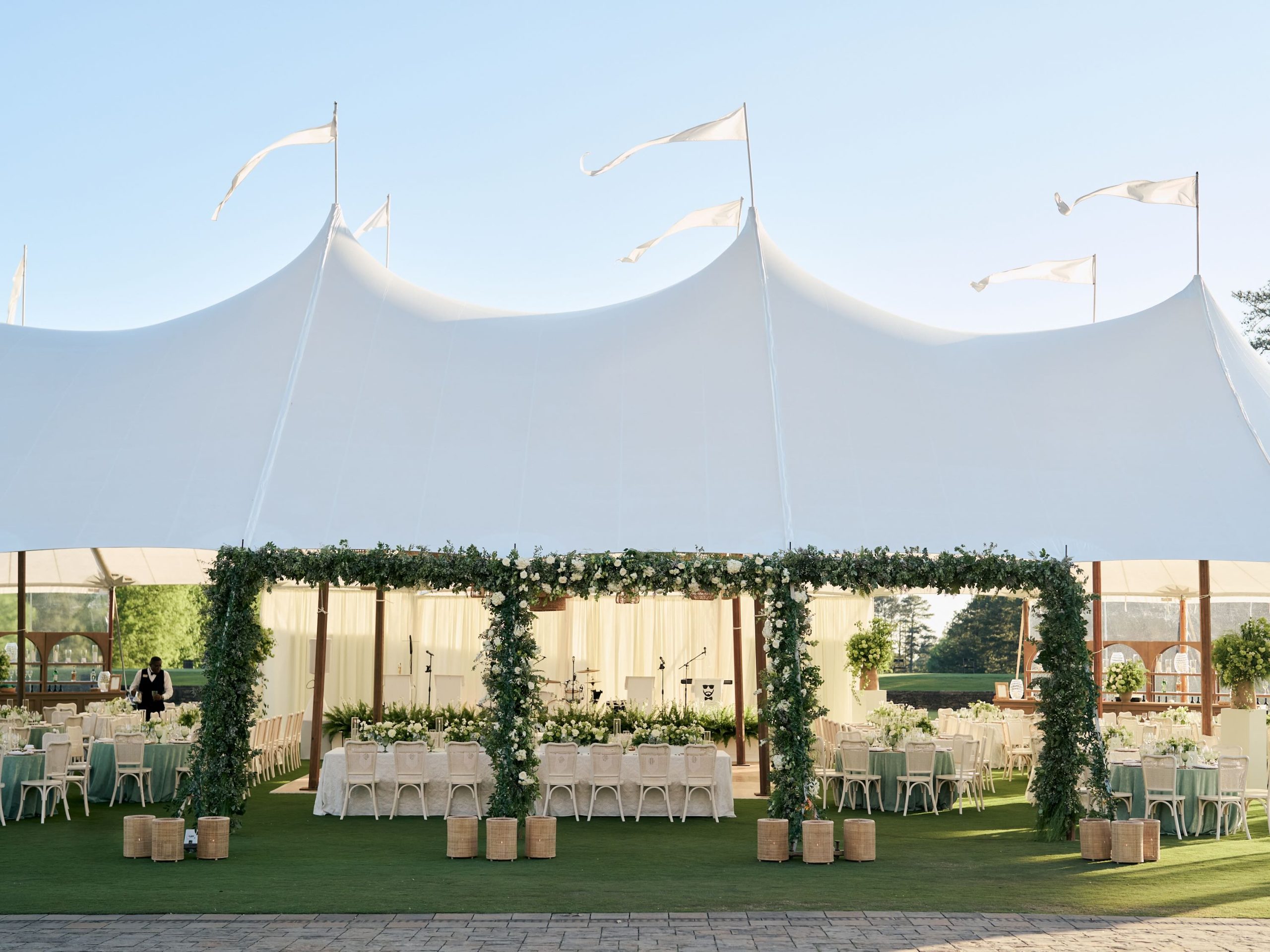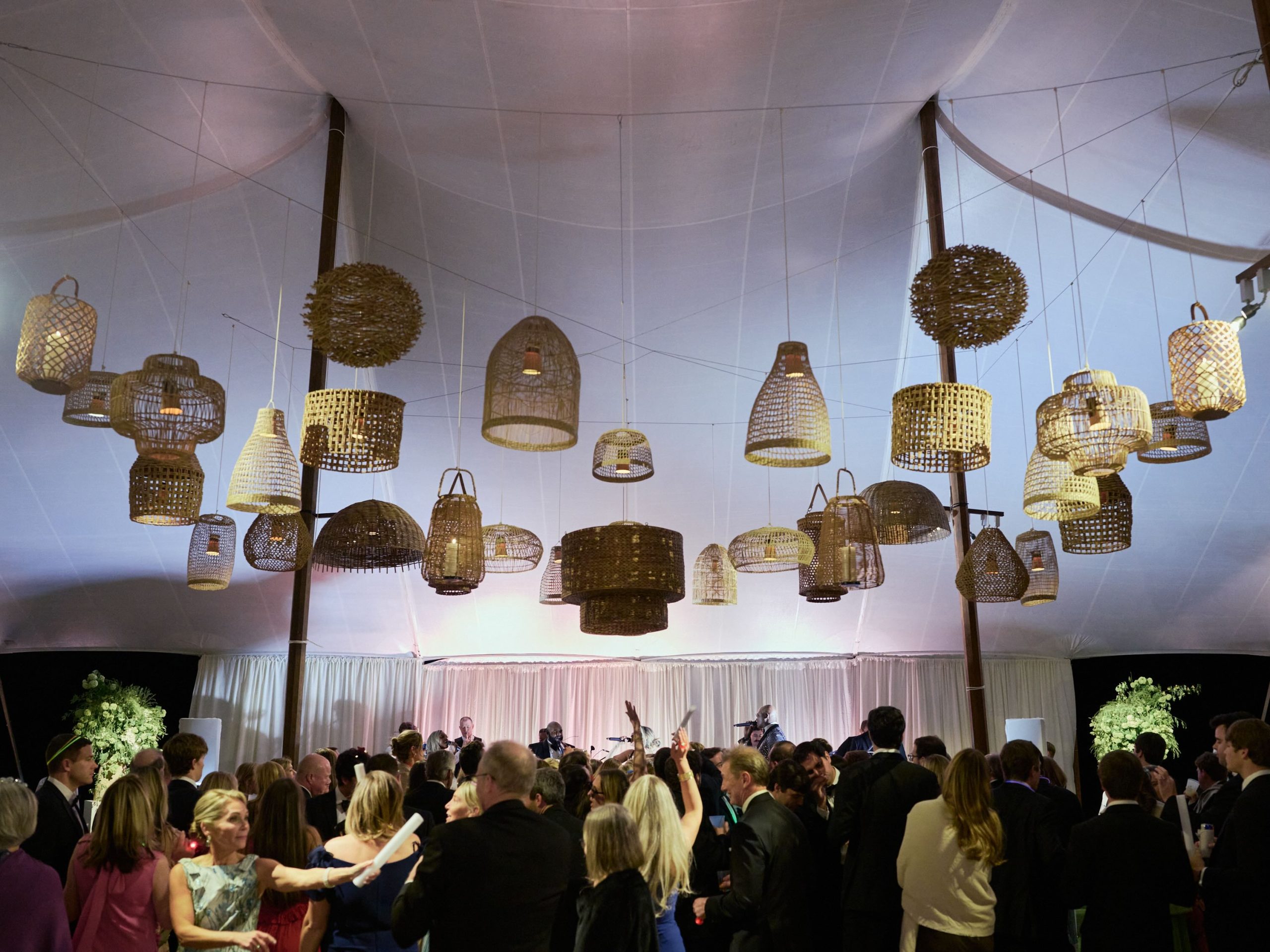 The day began at St. Philip’s Cathedral, a gorgeous traditional church that set the tone for what was to come. After saying their vows, the celebration moved to Cherokee Country Club, where a sailcloth tent overlooked the golf course. As the sun set over the greens, guests gathered under peaked tenting adorned with an installation of woven basket pendants that hung overhead like floating art.