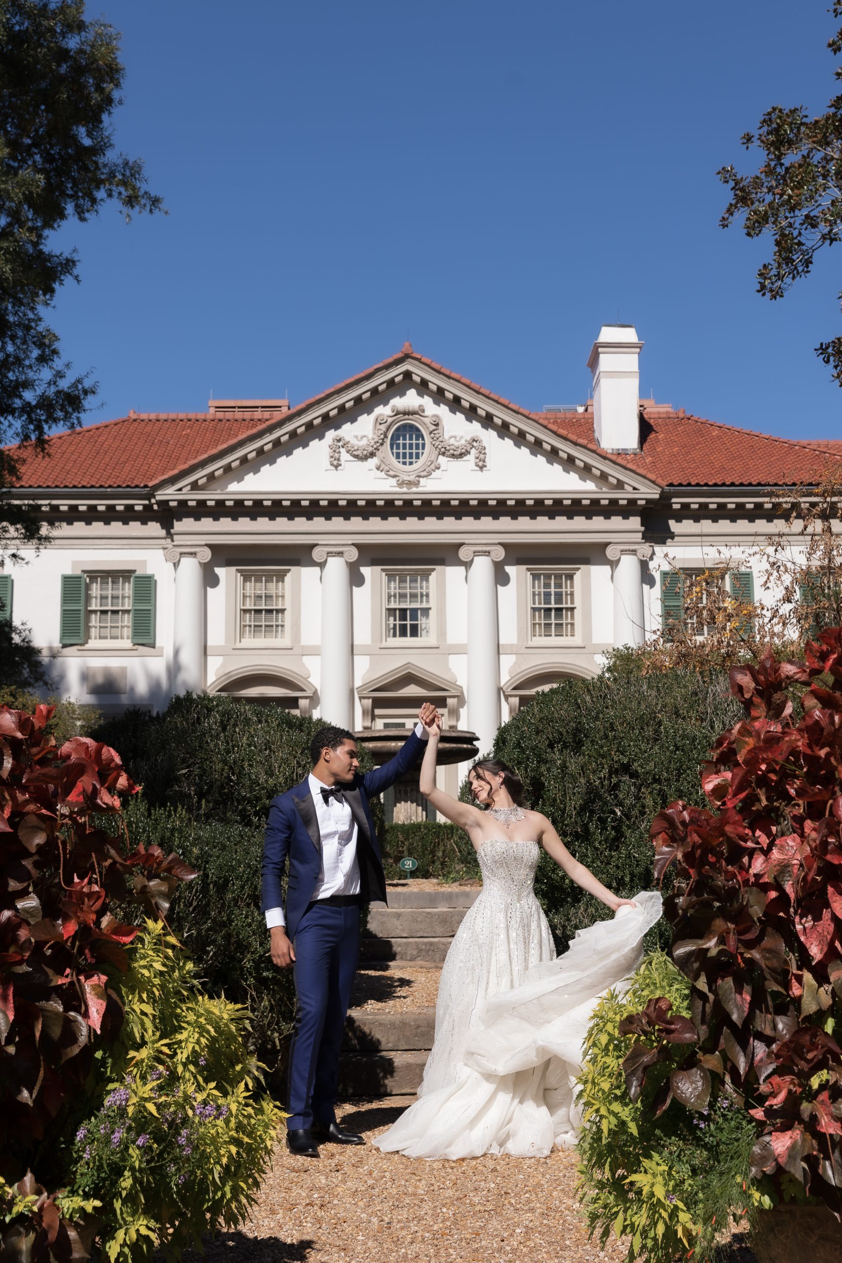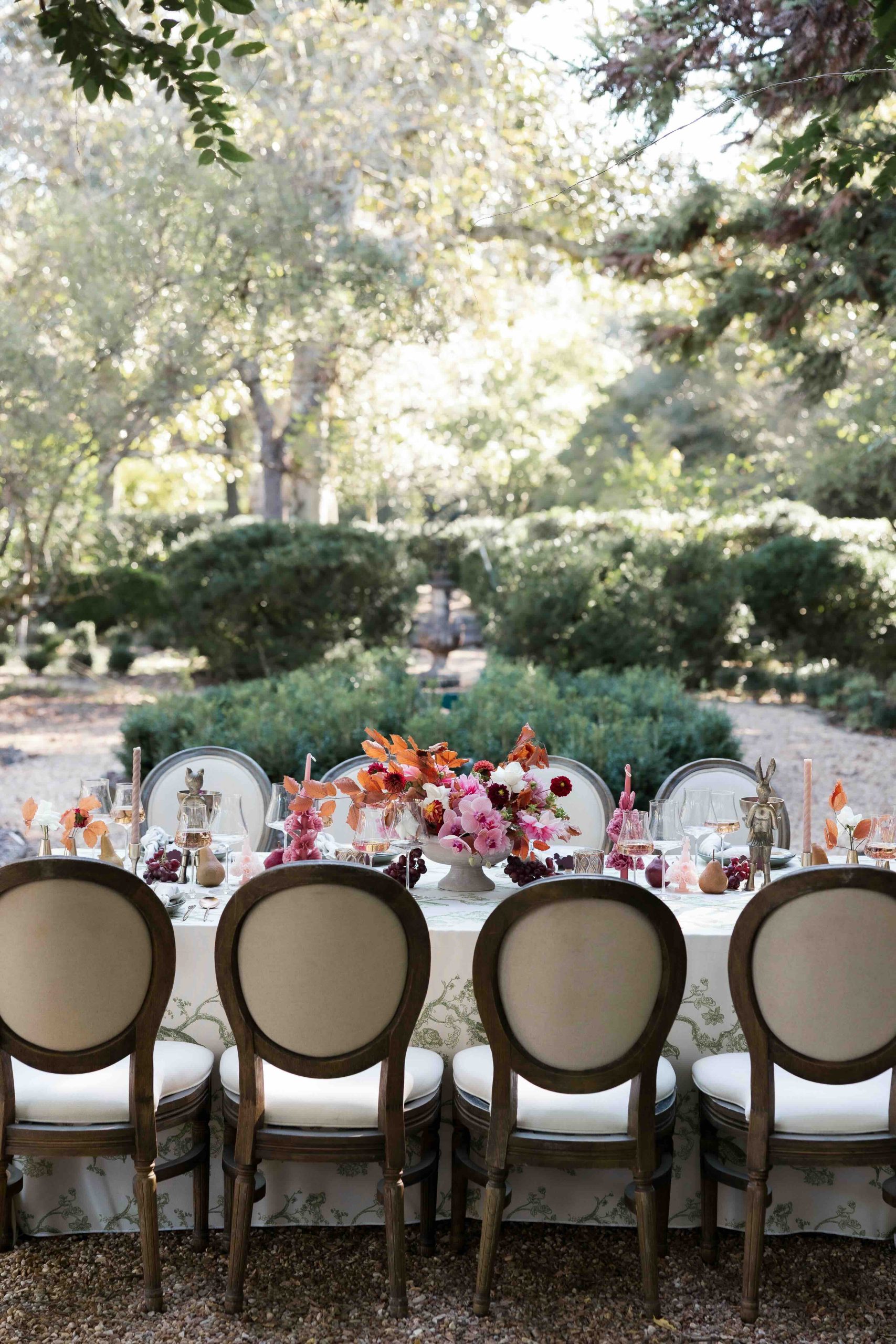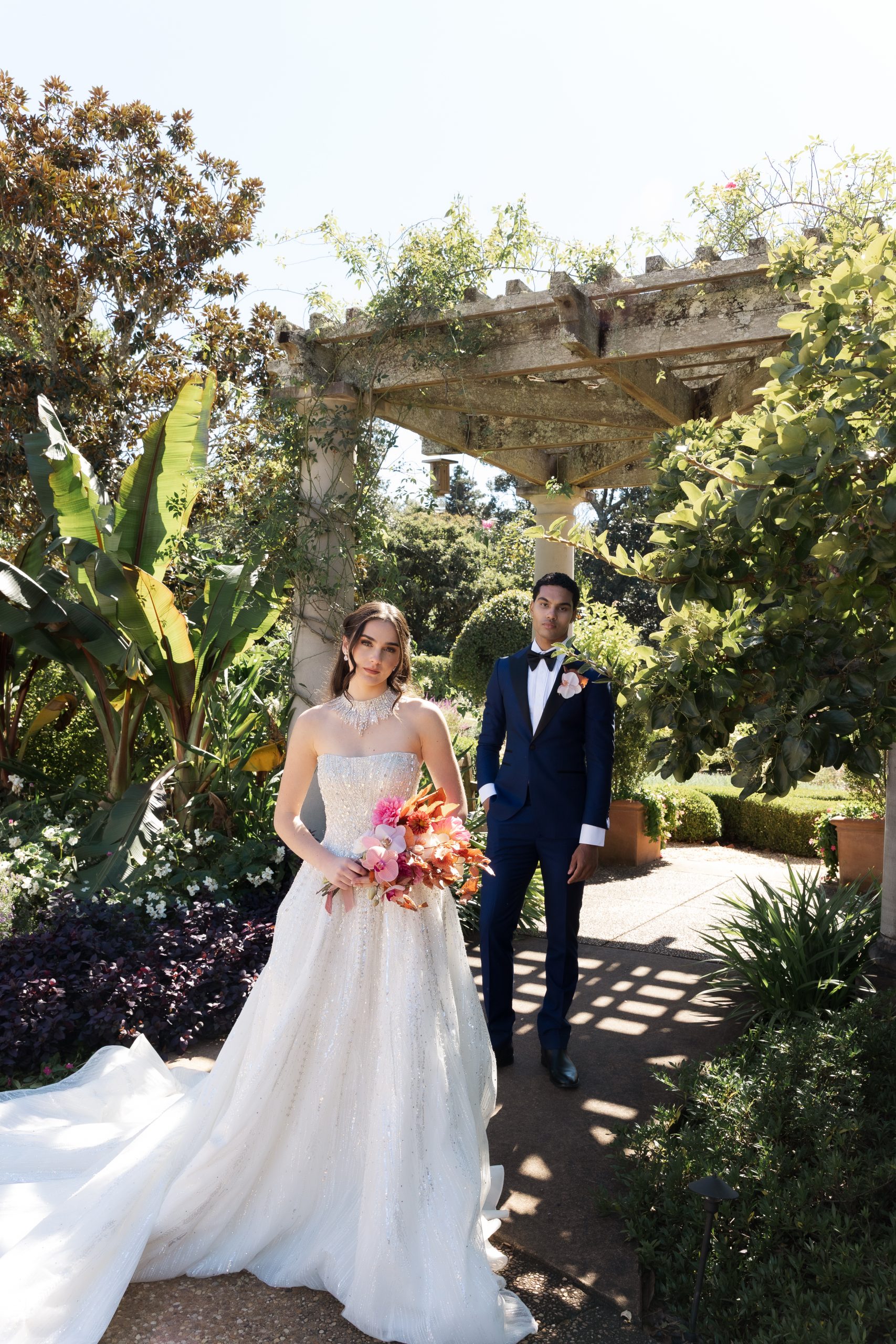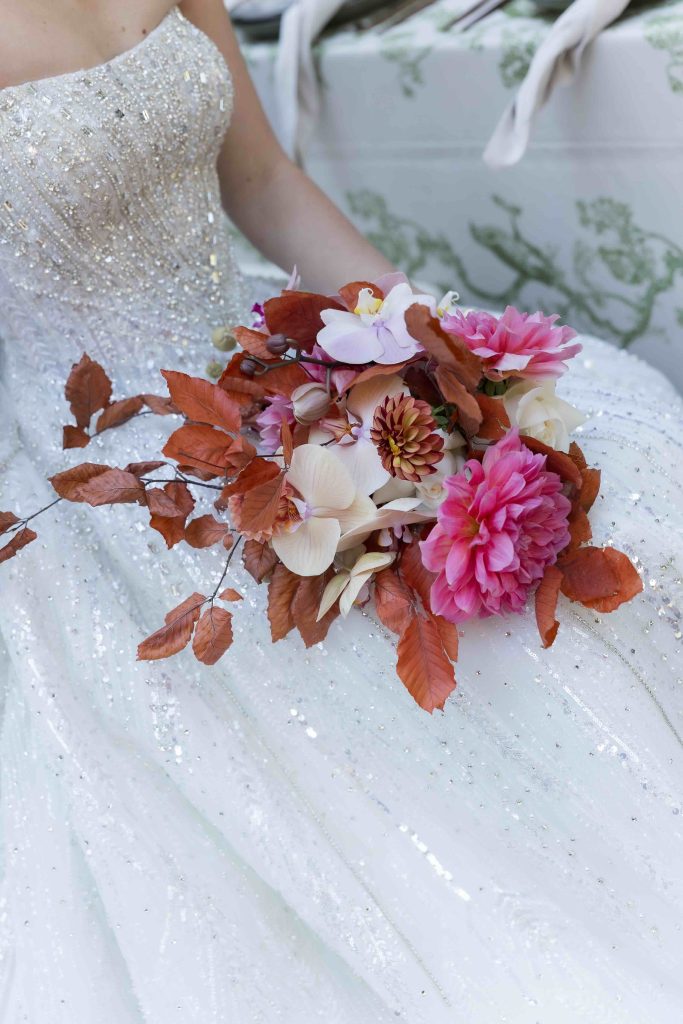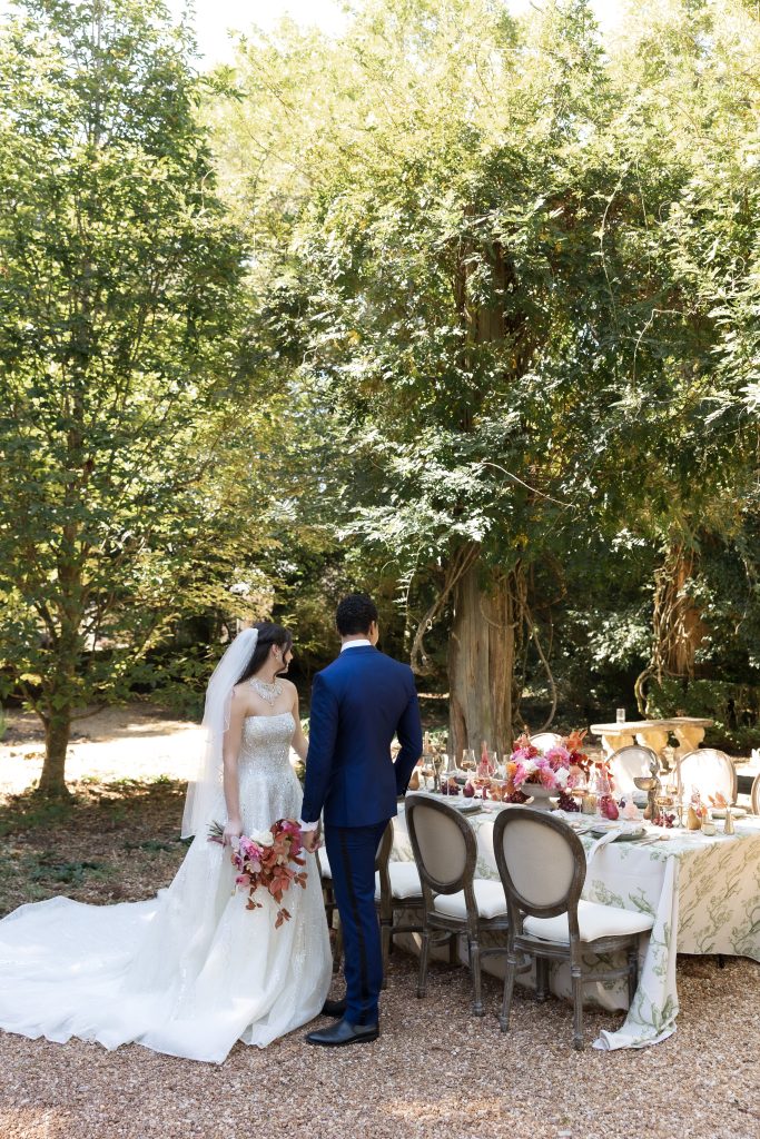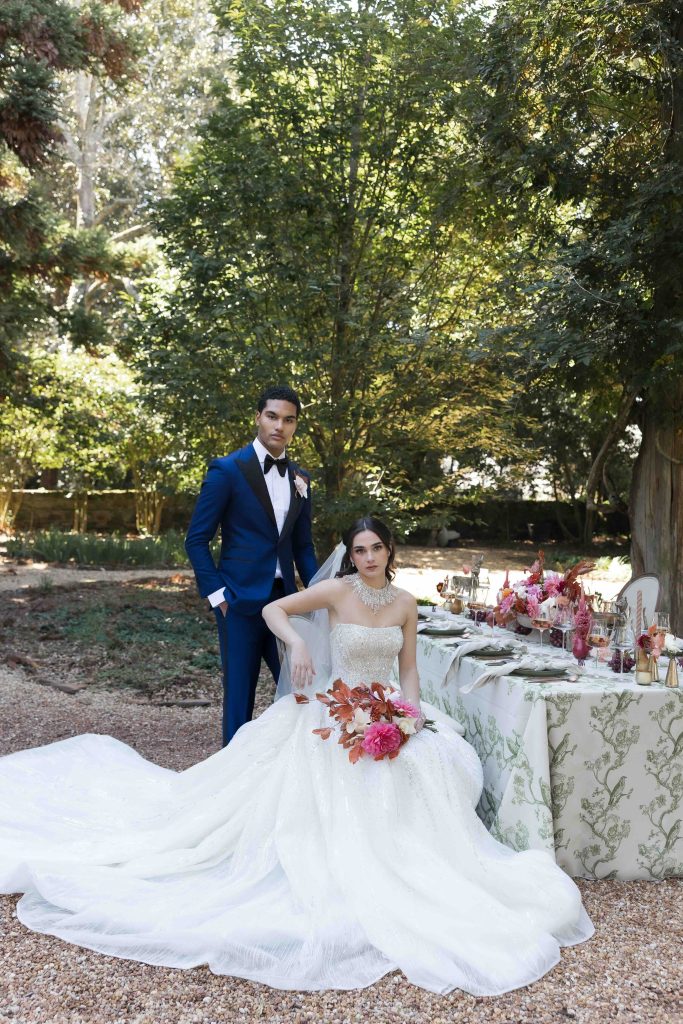 Step into a story of Southern charm, rewritten through a contemporary lens at Hills & Dales Estate. While English Spode dinnerware, toile-draped tables and artisanal tapers grounded the shoot’s palette in tradition, the colors told a more daring story. Bright pink orchids brushed against coppery fall foliage, creating jolts of modernity along the storied terraces. The bride moved through it all in an embellished gown that sparkled beneath natural canopies, lending a touch of poetic juxtaposition. Rather than recreate the past, this shoot let the old and new converse, resulting in a setting that read like classic literature brought to life.