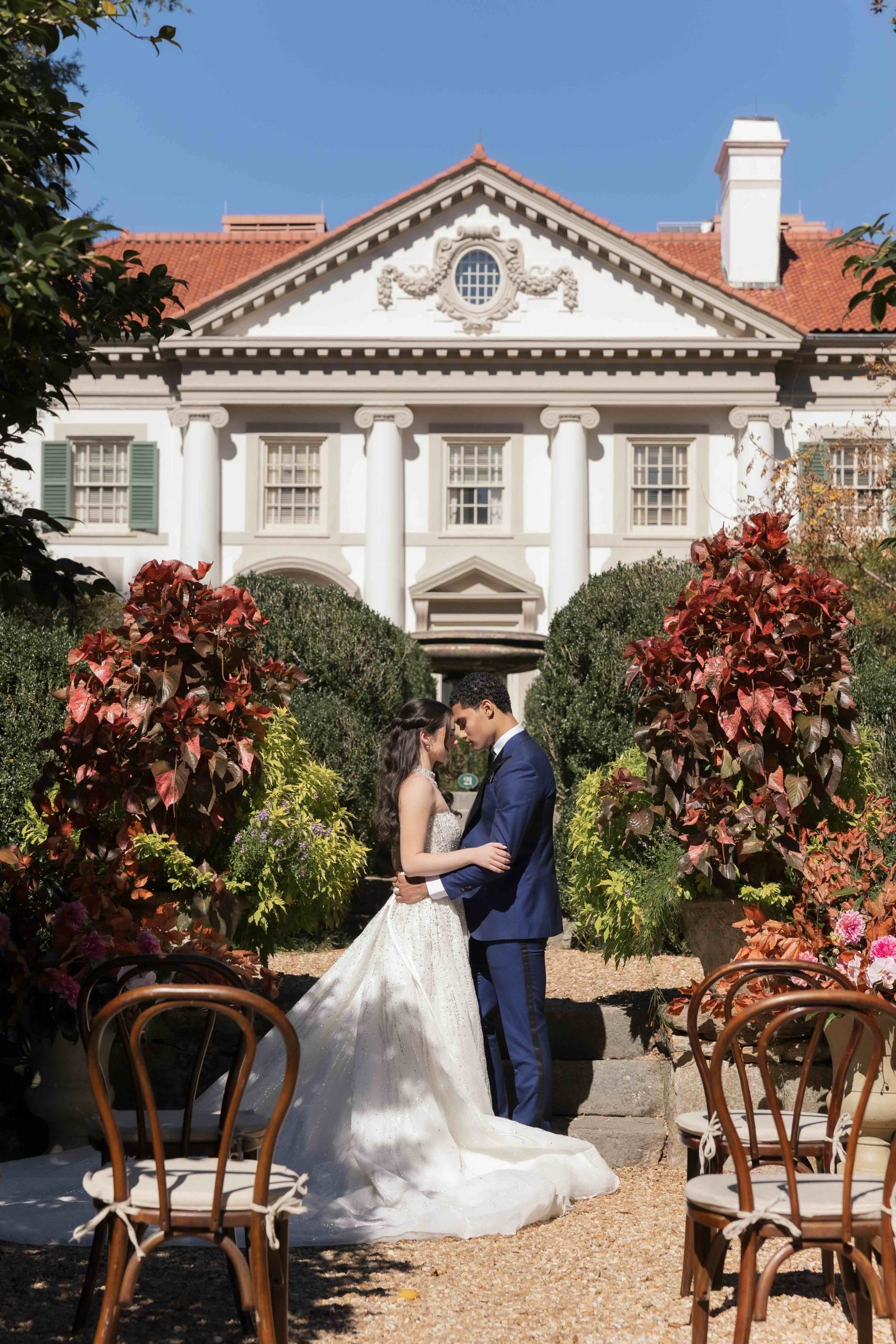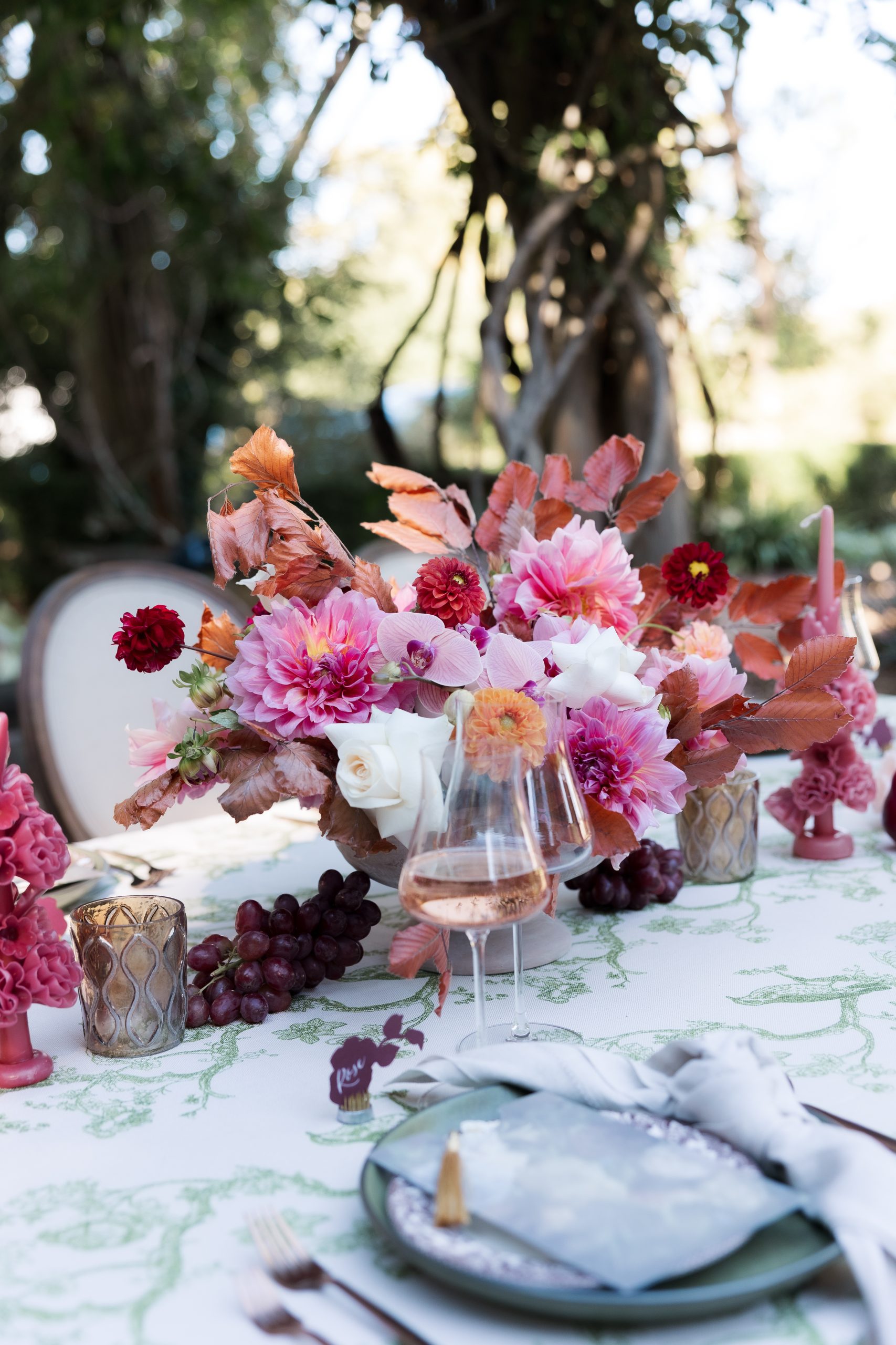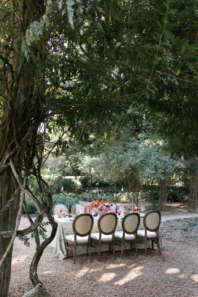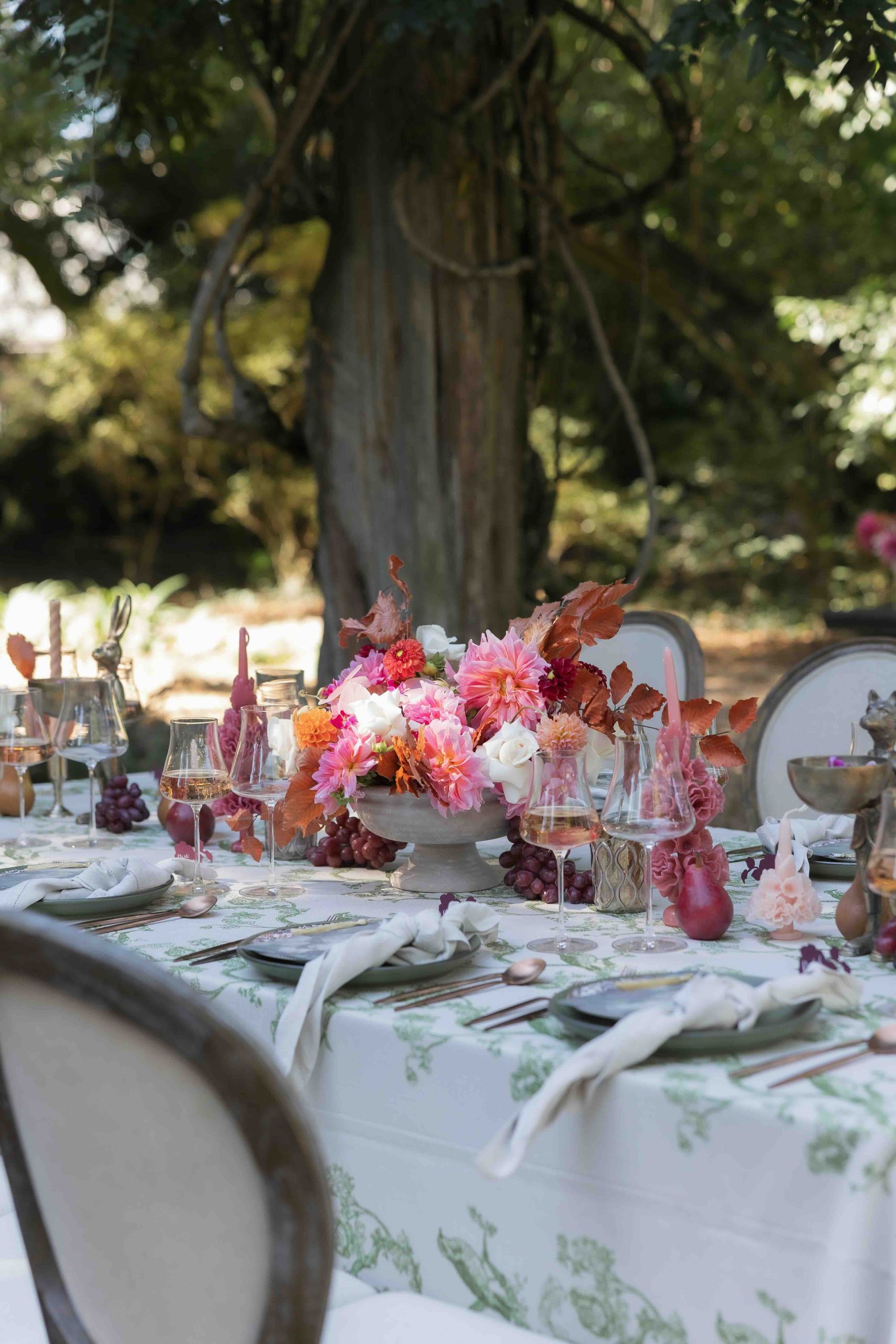 Step into a story of Southern charm, rewritten through a contemporary lens at Hills & Dales Estate. While English Spode dinnerware, toile-draped tables and artisanal tapers grounded the shoot’s palette in tradition, the colors told a more daring story. Bright pink orchids brushed against coppery fall foliage, creating jolts of modernity along the storied terraces. The bride moved through it all in an embellished gown that sparkled beneath natural canopies, lending a touch of poetic juxtaposition. Rather than recreate the past, this shoot let the old and new converse, resulting in a setting that read like classic literature brought to life.