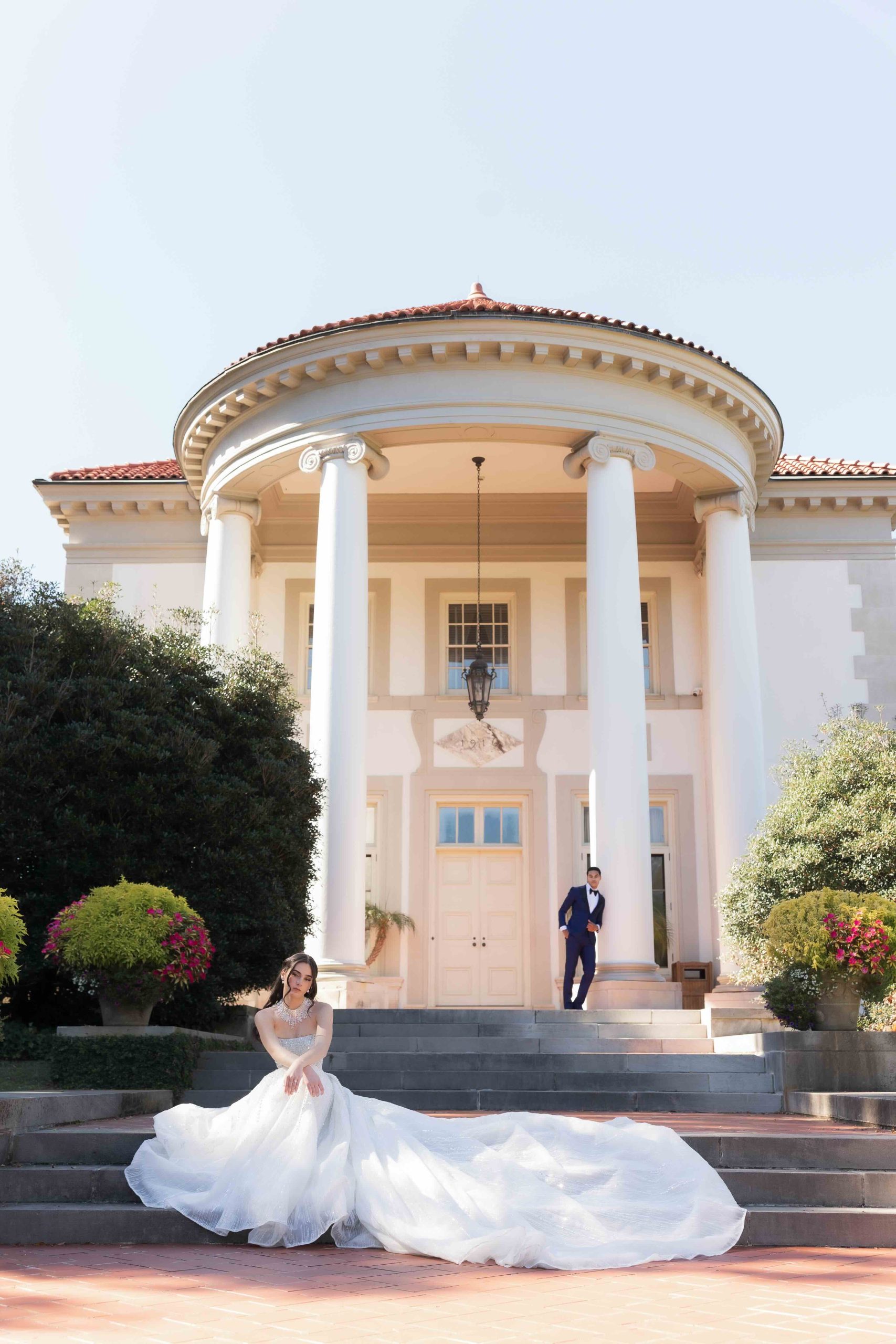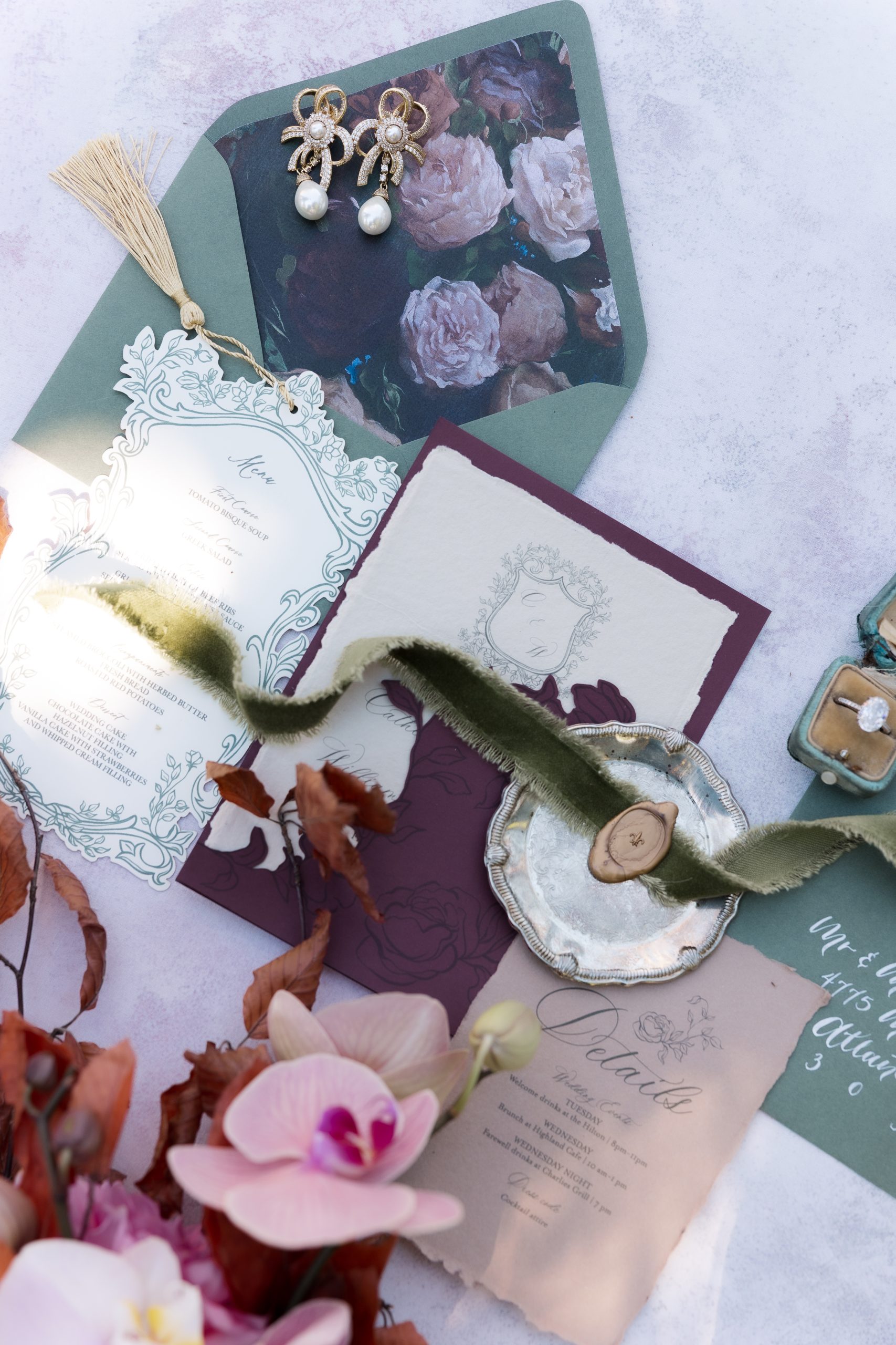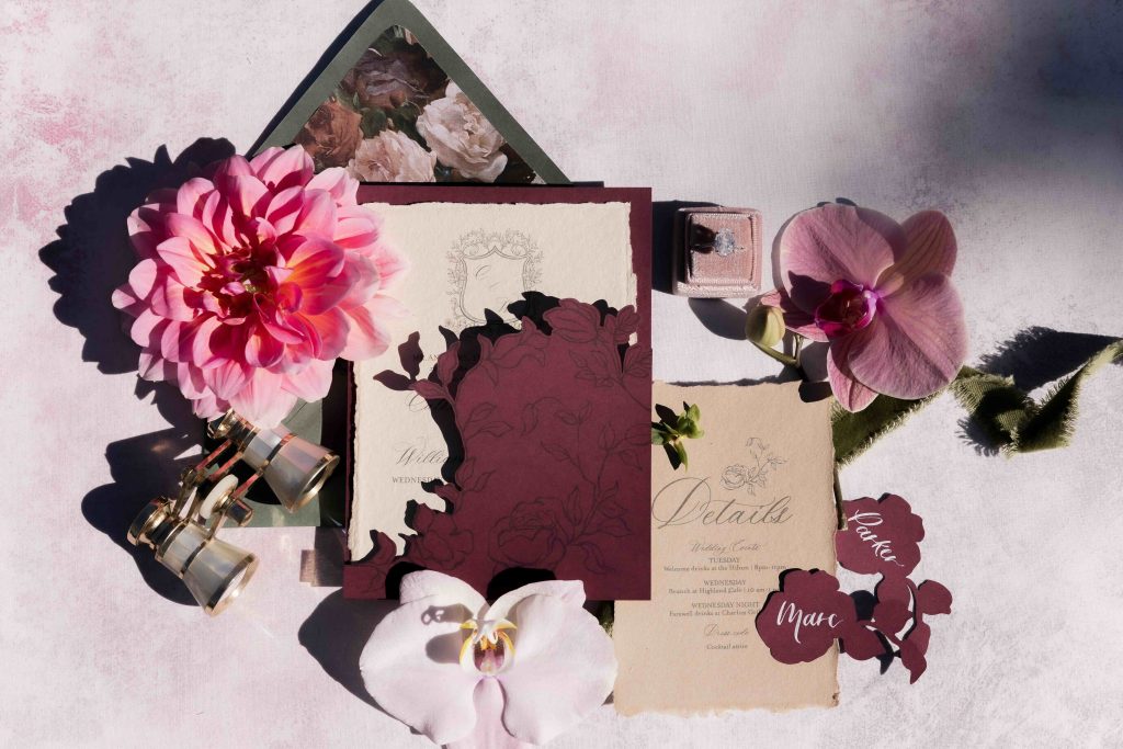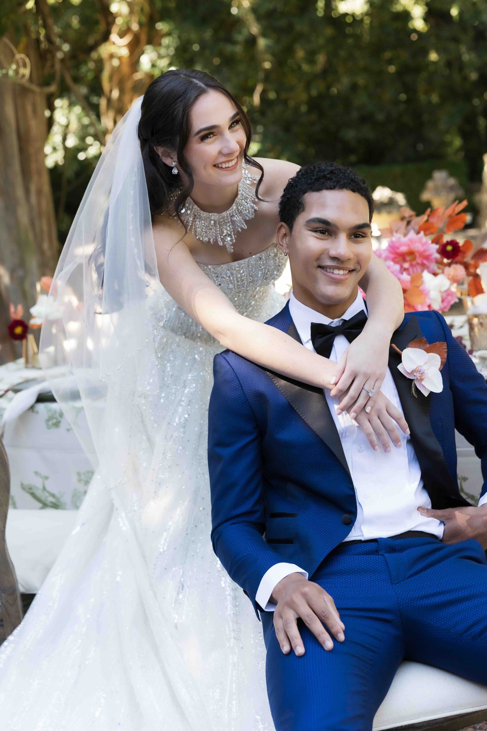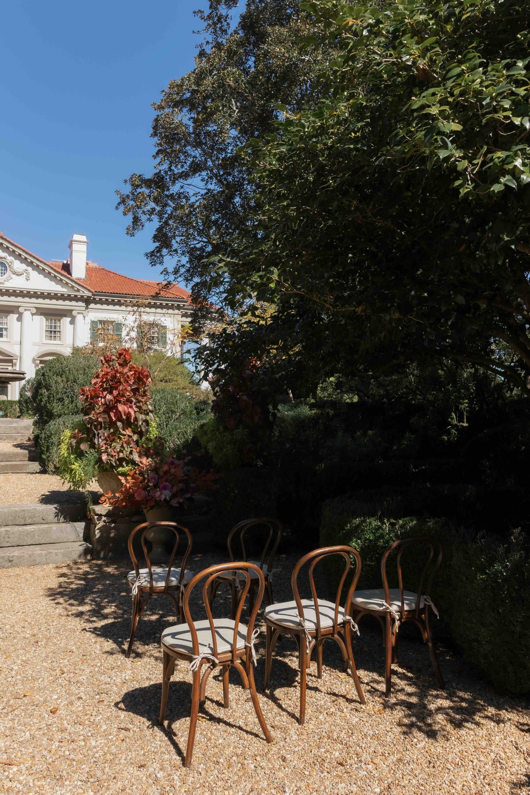 Step into a story of Southern charm, rewritten through a contemporary lens at Hills & Dales Estate. While English Spode dinnerware, toile-draped tables and artisanal tapers grounded the shoot’s palette in tradition, the colors told a more daring story. Bright pink orchids brushed against coppery fall foliage, creating jolts of modernity along the storied terraces. The bride moved through it all in an embellished gown that sparkled beneath natural canopies, lending a touch of poetic juxtaposition. Rather than recreate the past, this shoot let the old and new converse, resulting in a setting that read like classic literature brought to life.