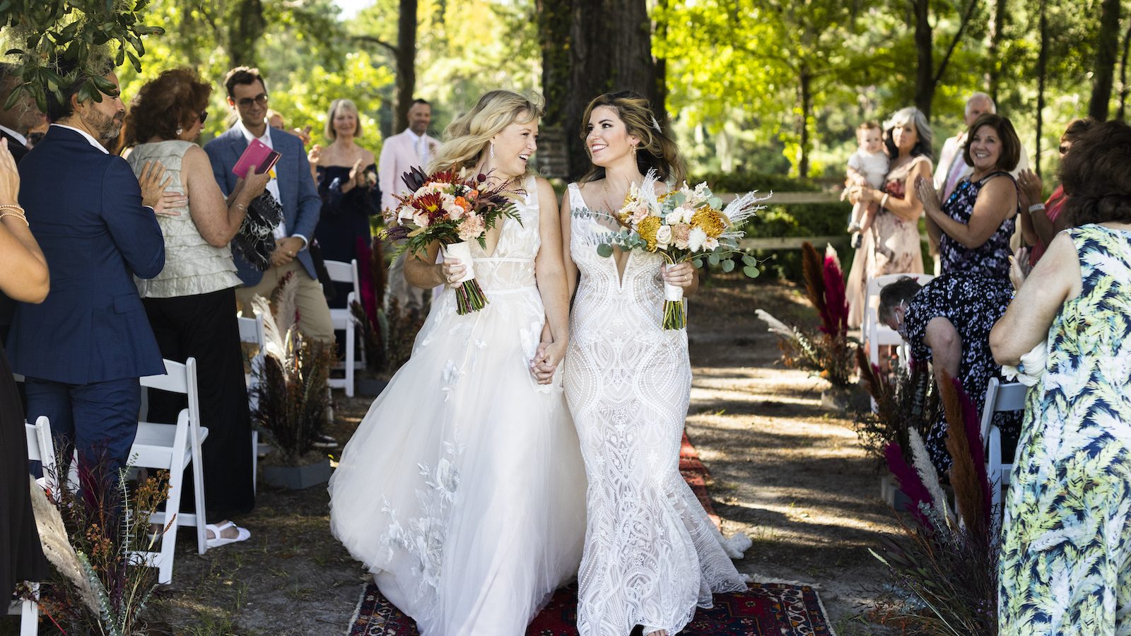 The LA-based couple decided on a destination wedding to Savannah, Georgia — a place they’d visited and fell in love with a year earlier. The pair exchanged vows in front of a 300-year- old oak tree at Red Gate Farm and held the reception at the farm’s granary building. They planned special elements, like a photo booth camper for guests. For their first dance, Molly and Campbell selected “The Story” cover by Dolly Parton. And in addition to a two-tiered cake, they had an armadillo cake — just like in the movie “Steel Magnolias.”