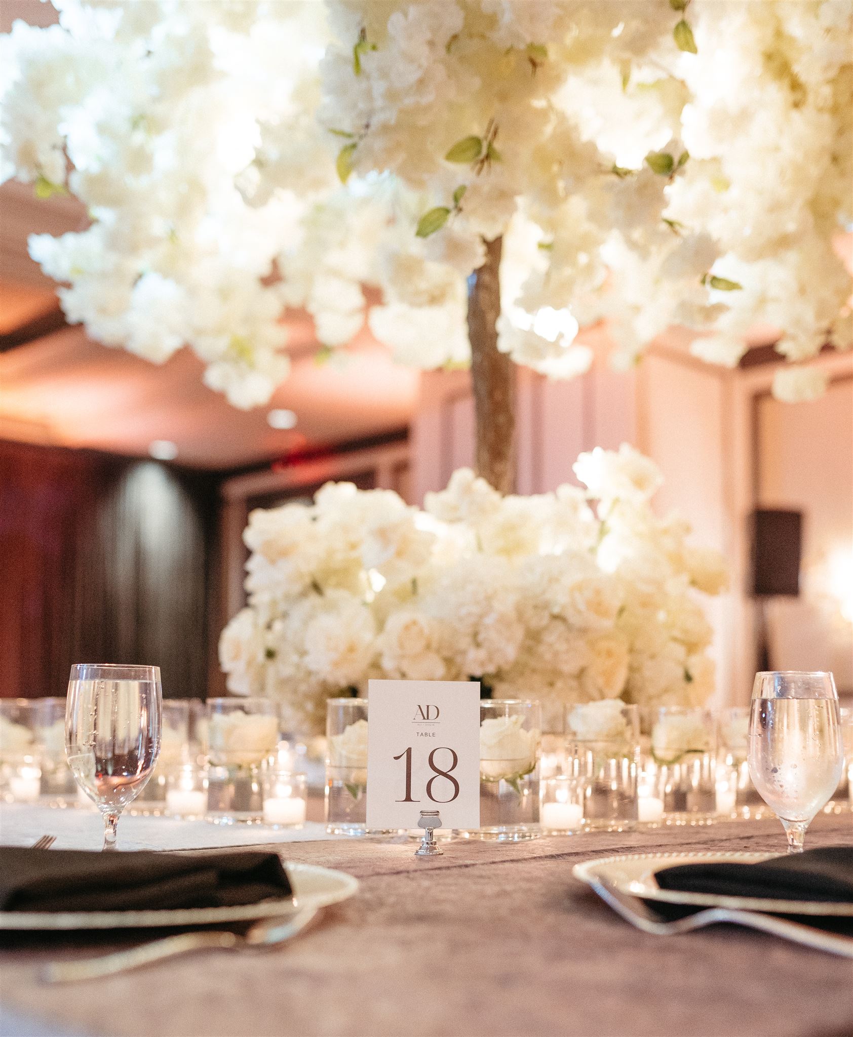 As the evening moved indoors, the energy shifted to celebration. The ballroom came alive with dance performances, joyful cheers and a pastel floral design that infused the space with charm and elegance. A floral dance floor took center stage, while Dior-esque linens dressed each table in a look of timeless sophistication. With tall ceilings, rich wooden accents, and expansive windows filling the space with natural light, the venue effortlessly married tradition with a modern, refined aesthetic.