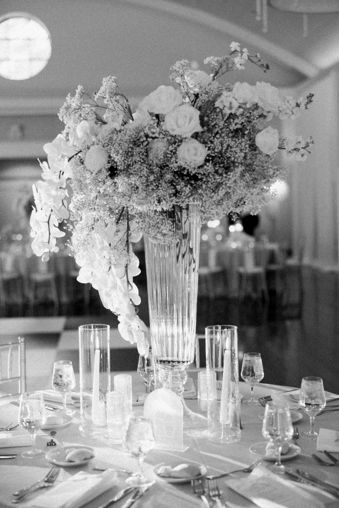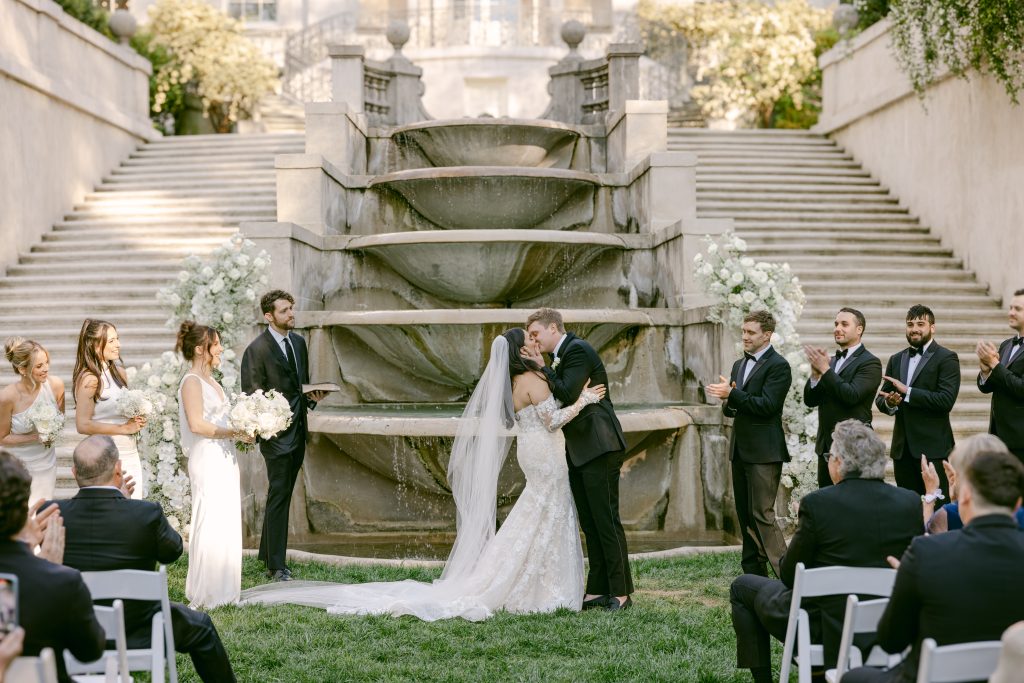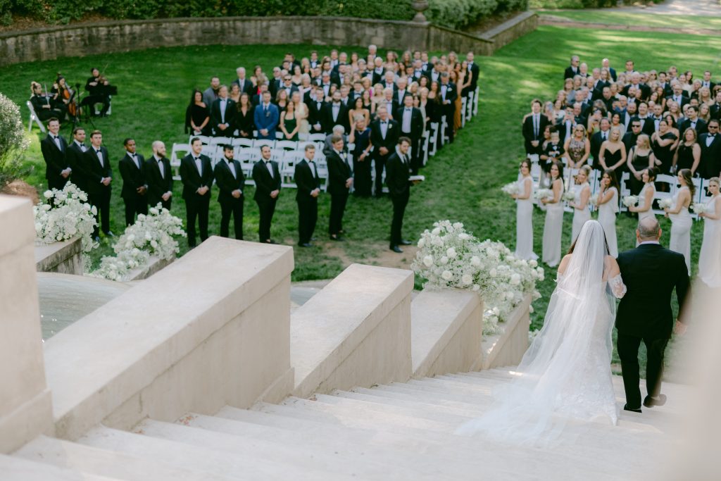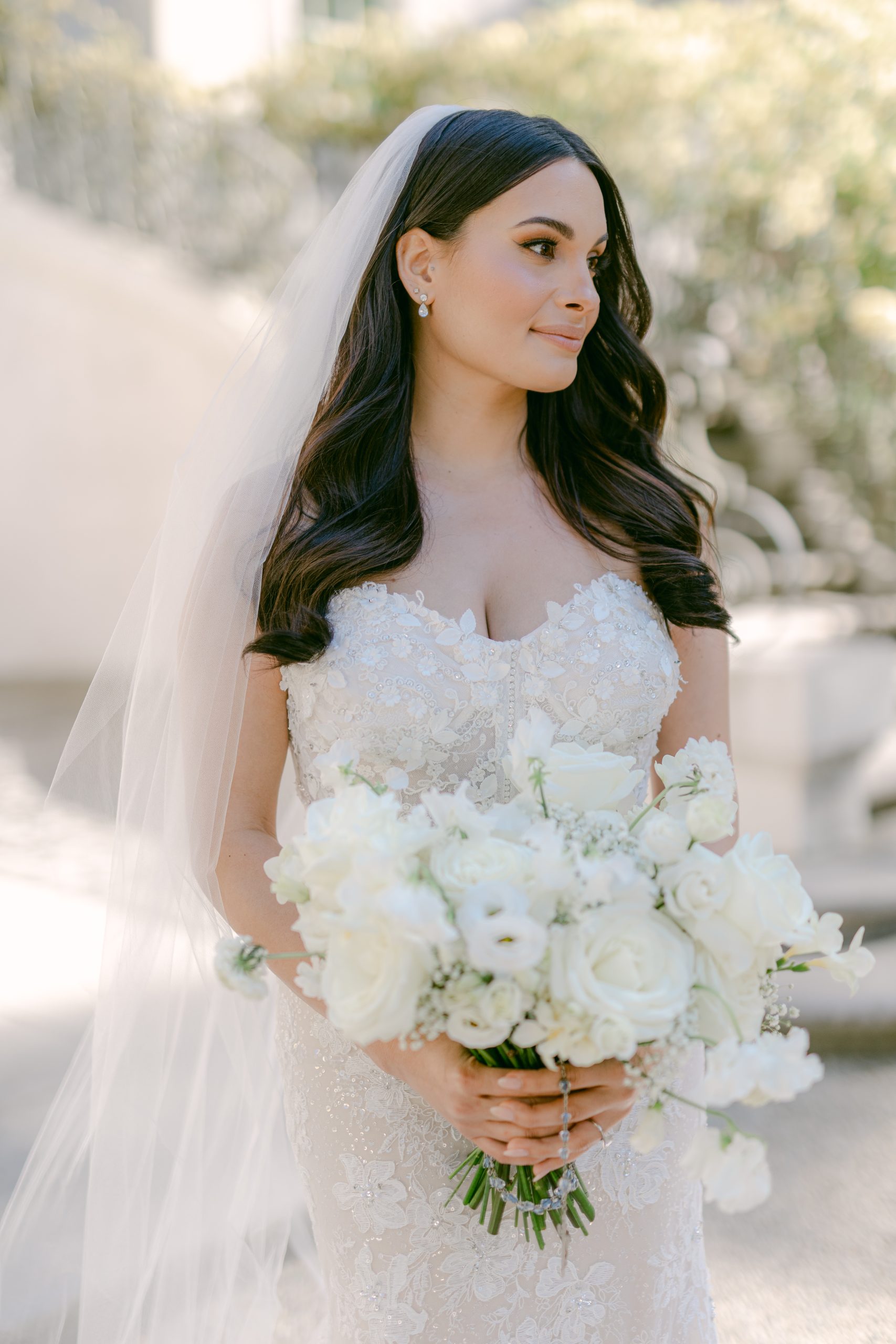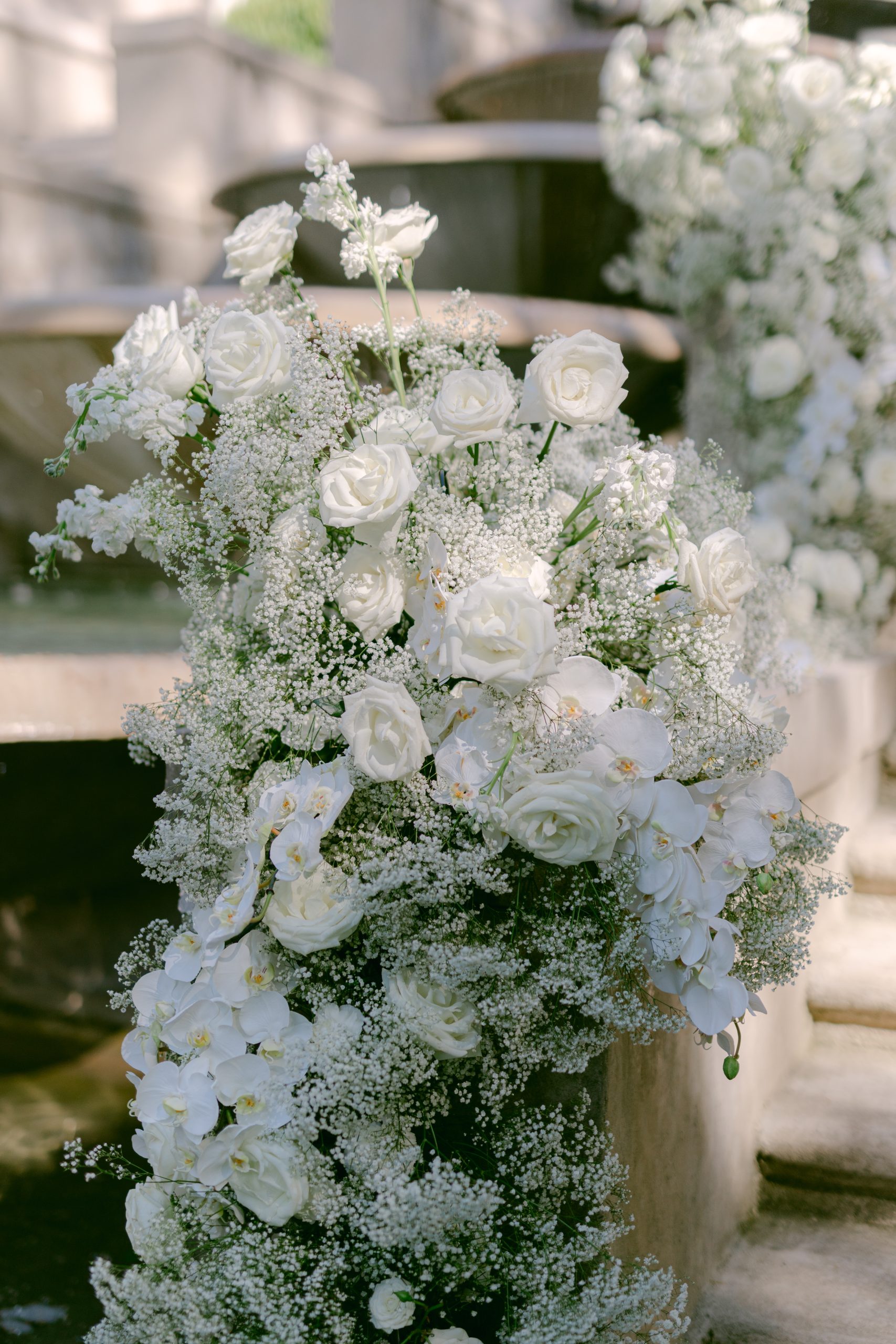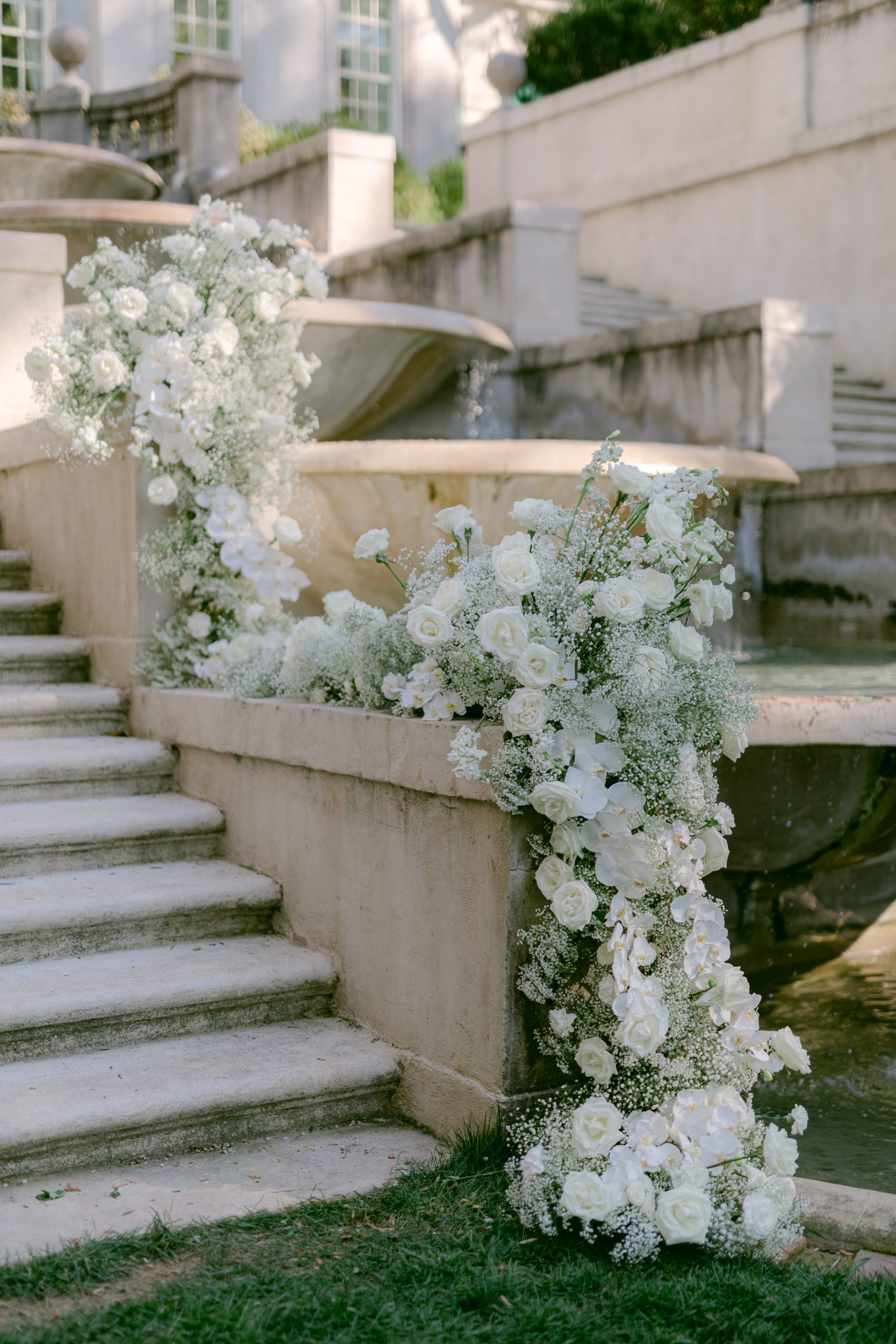 Florals played a leading role. White roses, baby’s breath and glowing candlelight gave warmth to the grandeurof the space. For the ceremony, Flowers by Yona created two cascading installations that seemed to flow down the steps and alongside the fountain itself, a backdrop that felt both dramatic and romantic.