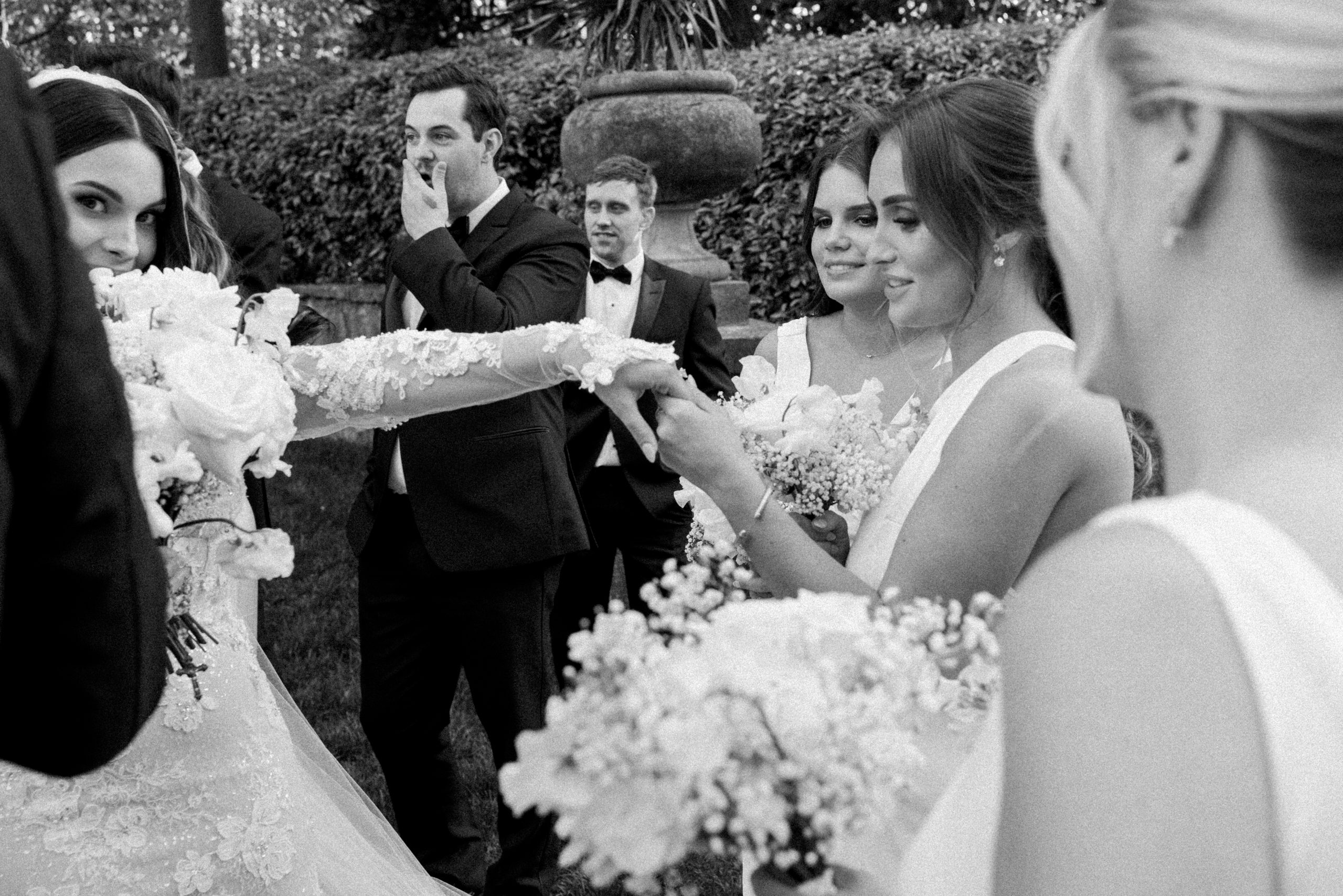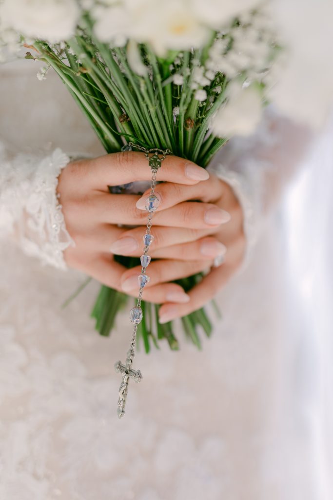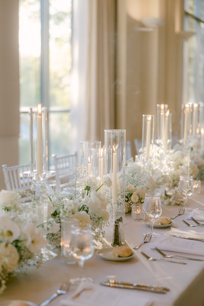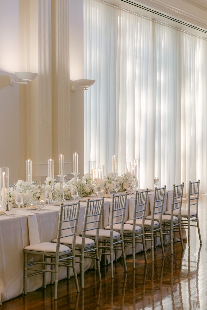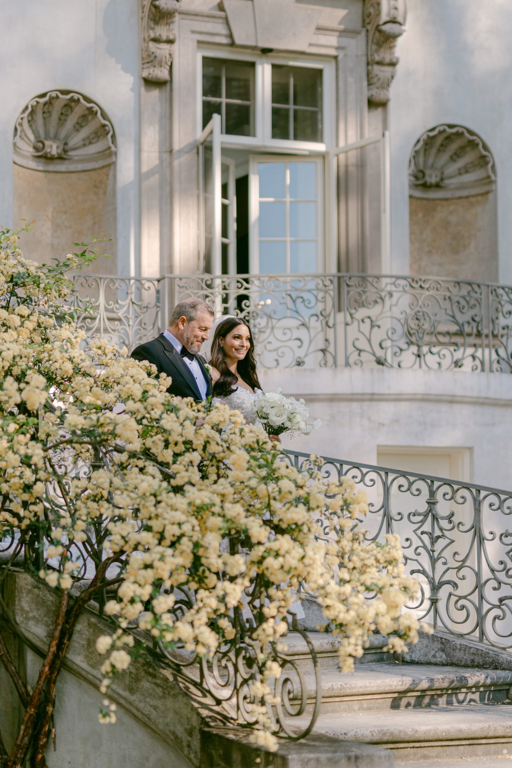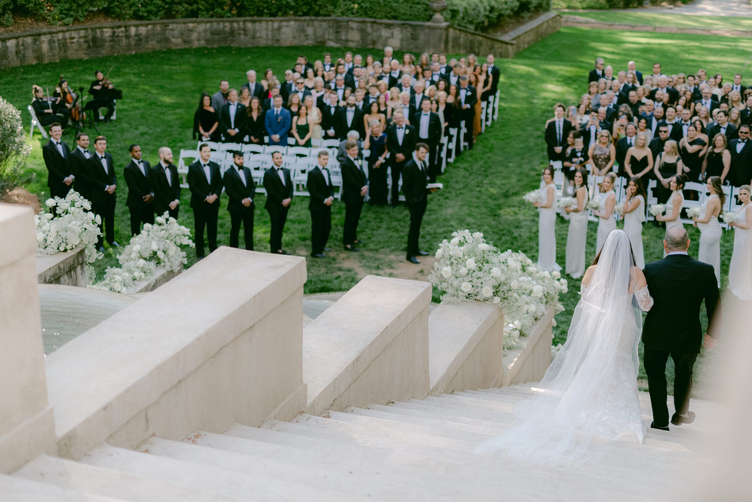 Florals played a leading role. White roses, baby’s breath and glowing candlelight gave warmth to the grandeurof the space. For the ceremony, Flowers by Yona created two cascading installations that seemed to flow down the steps and alongside the fountain itself, a backdrop that felt both dramatic and romantic.