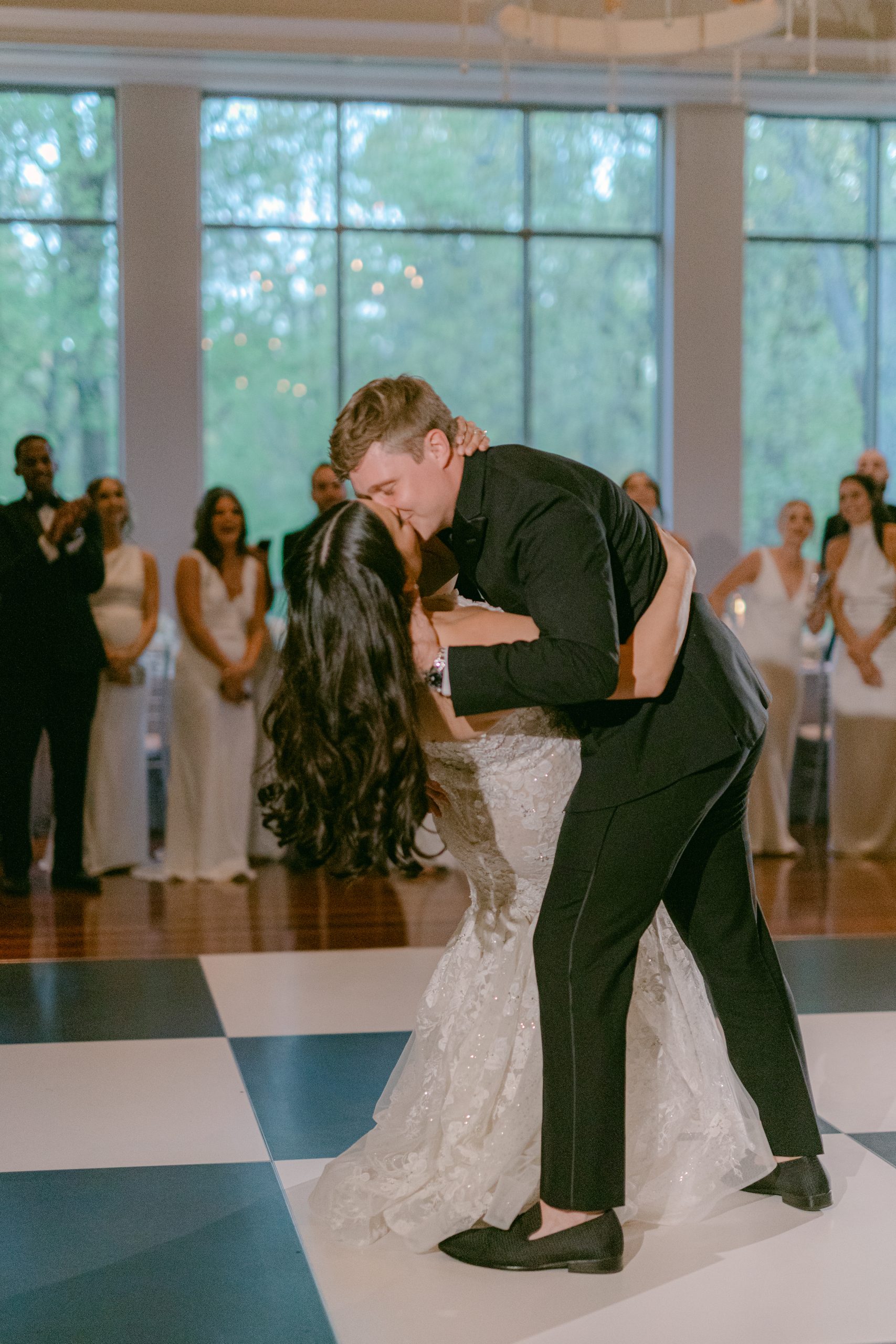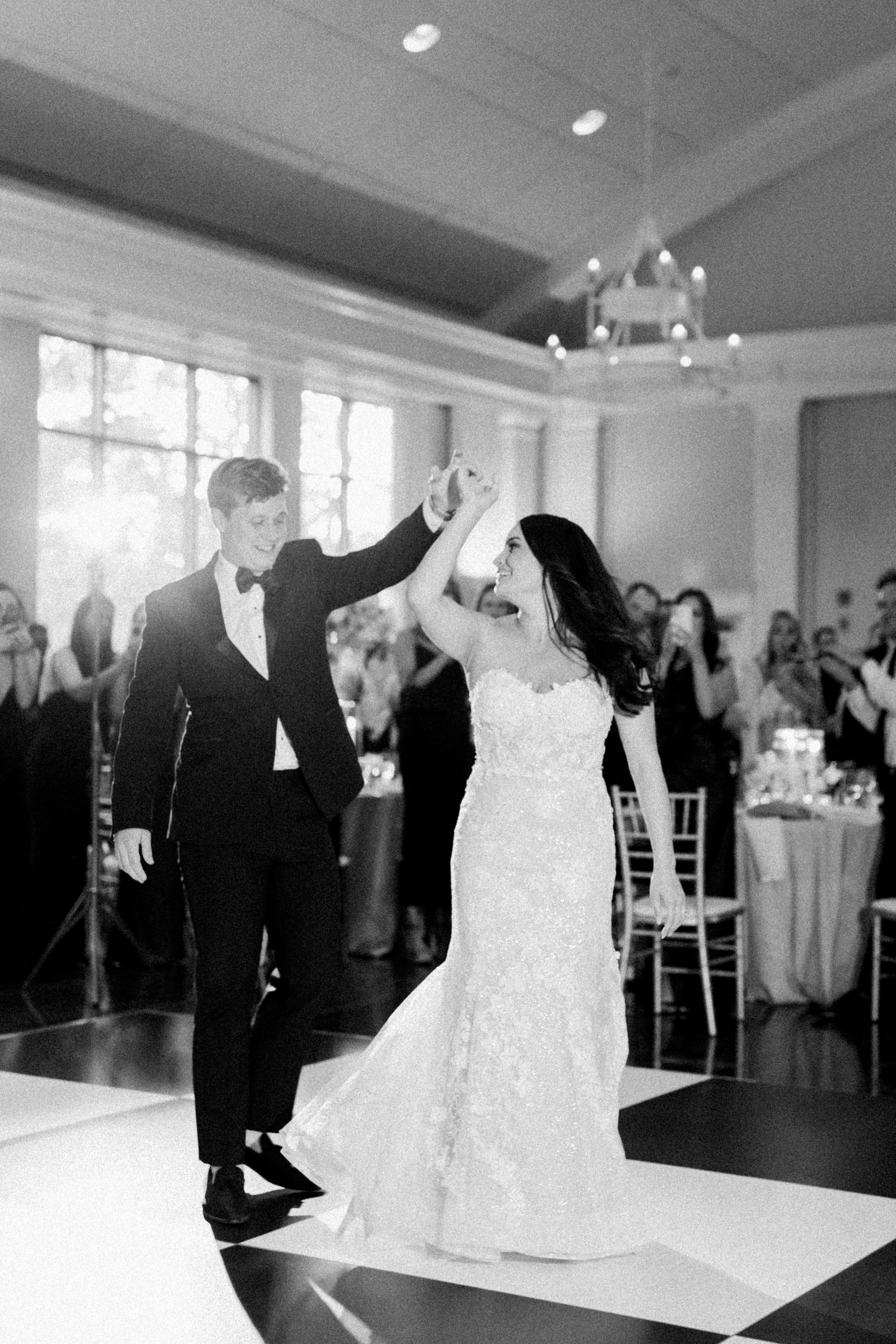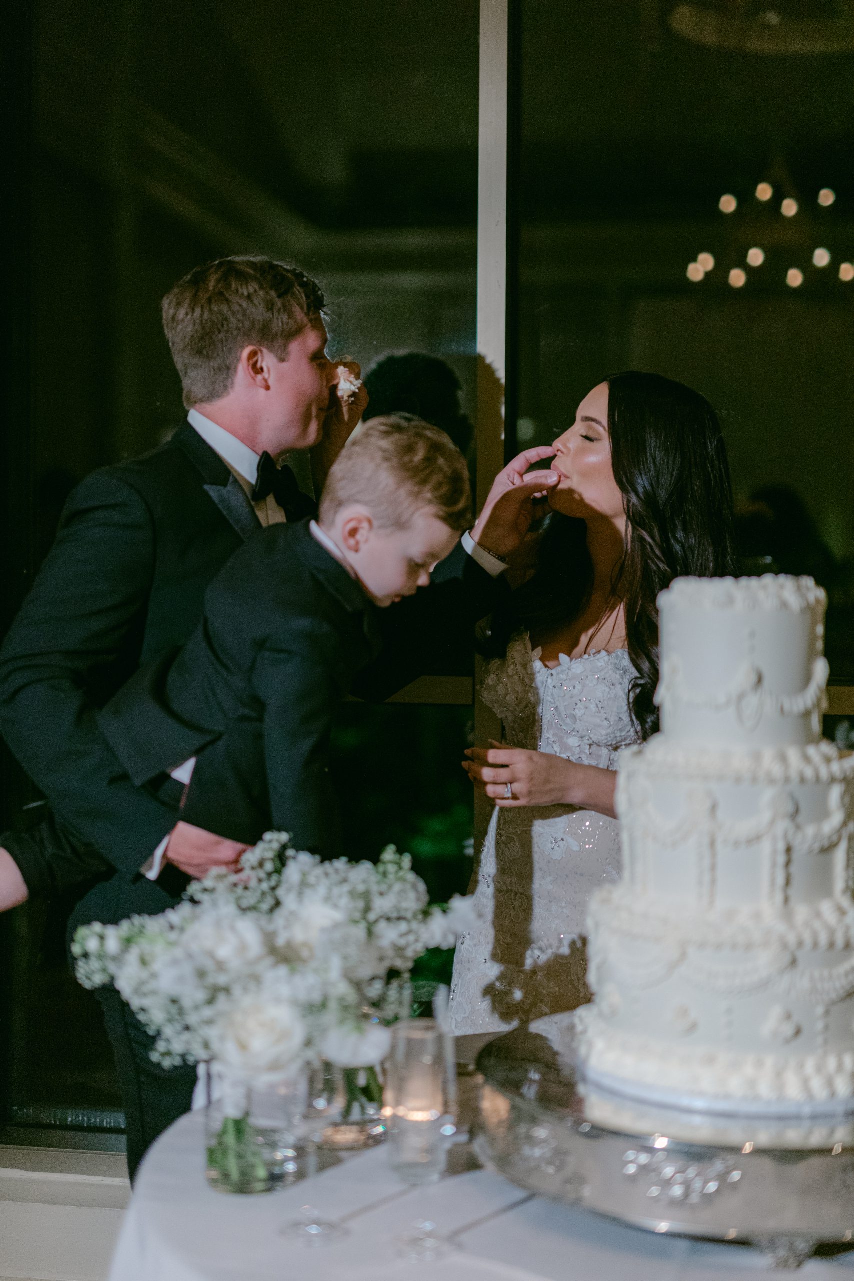 The reception carried that same refined spirit. Inside the Grand Overlook Ballroom, a bold black-and-white dance floor became the room’s centerpiece, with a long estate table drawing guests together. White linens, low floral arrangements and flickering candles filled the room with a glow. Even the cake reflected the theme — a three-tier Lambeth-style design by Cake Envy that looked regal and tasted unforgettable.