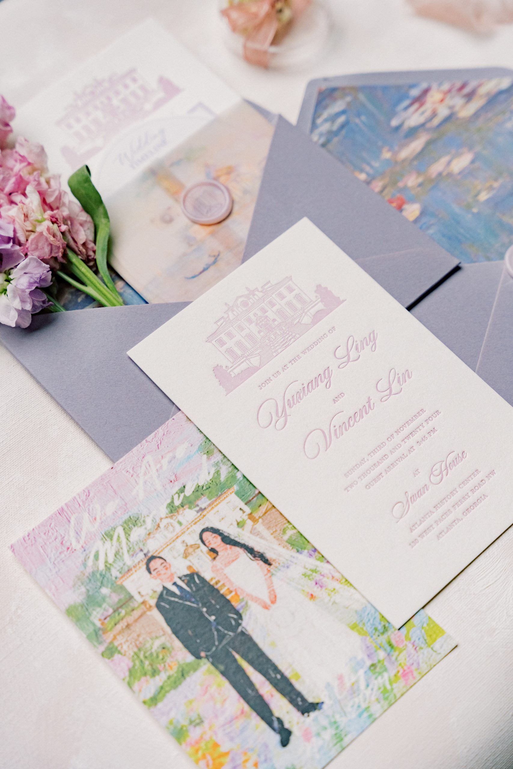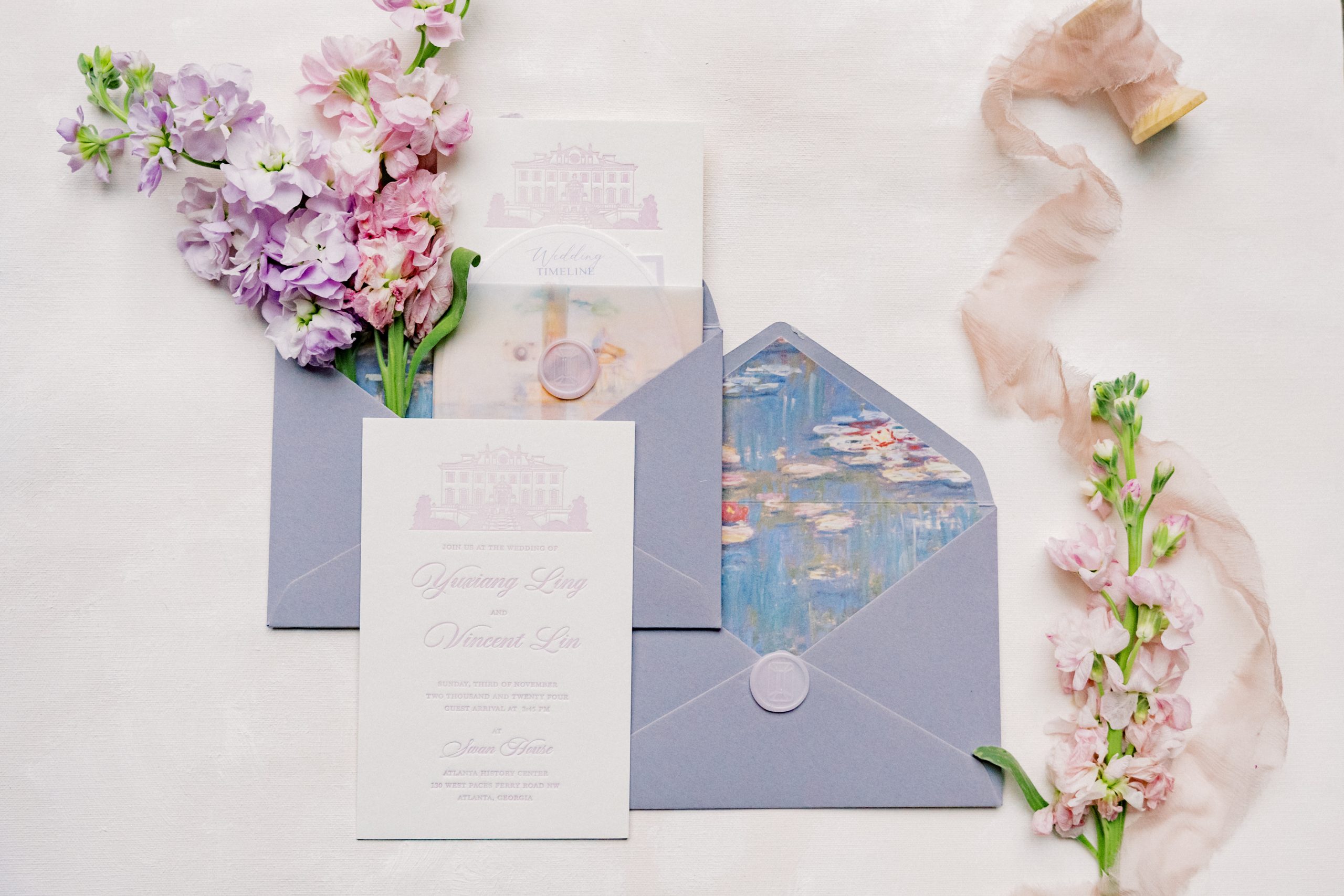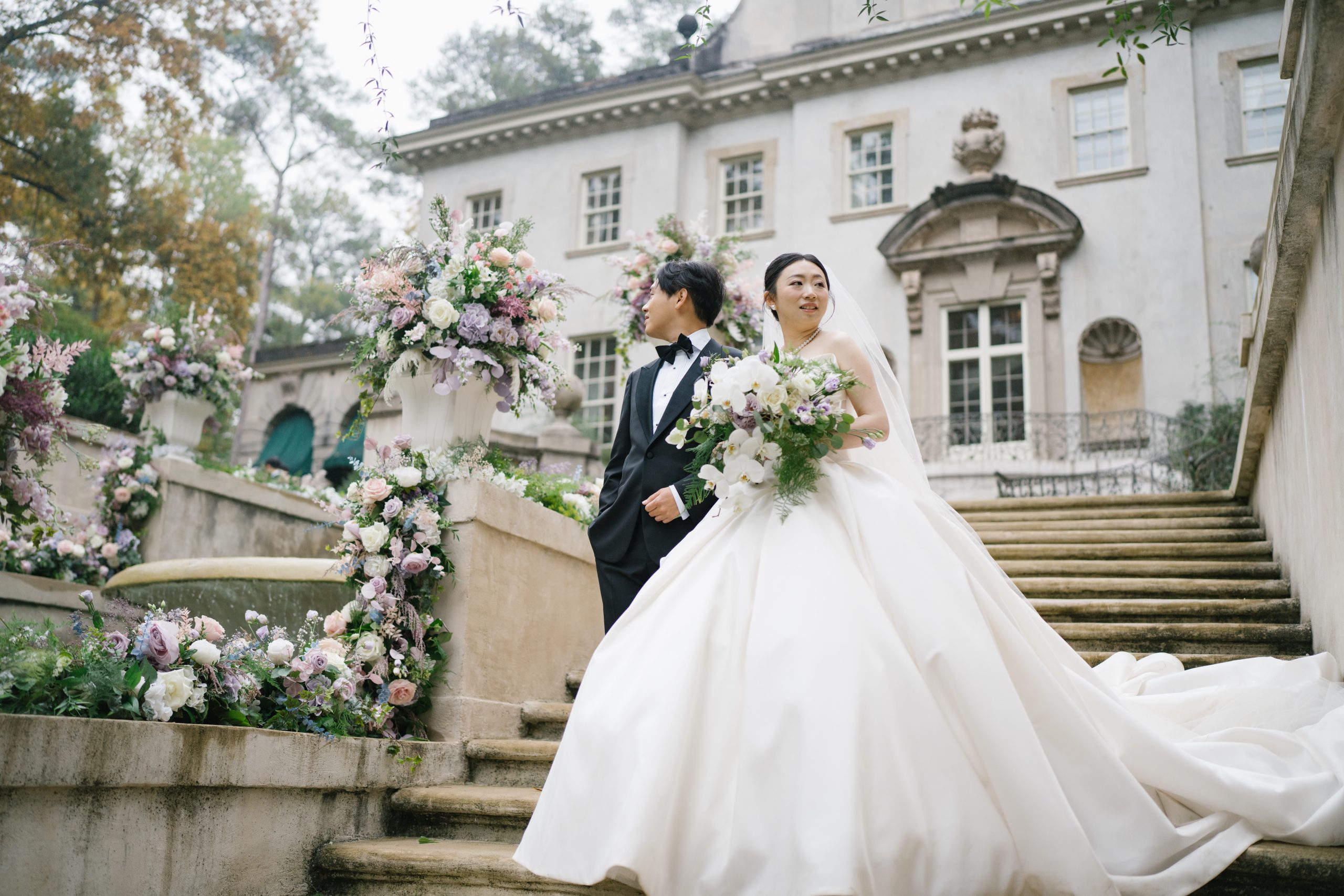 Walking into Yuxiang and Vincent’s wedding was like walking into an impressionist painting brought to life. Hosted at Atlanta History Center’s iconic Swan House, their celebration was soft, romantic and brimming with delicate details — a wedding where art and love really intertwined.