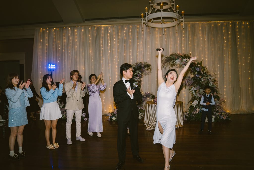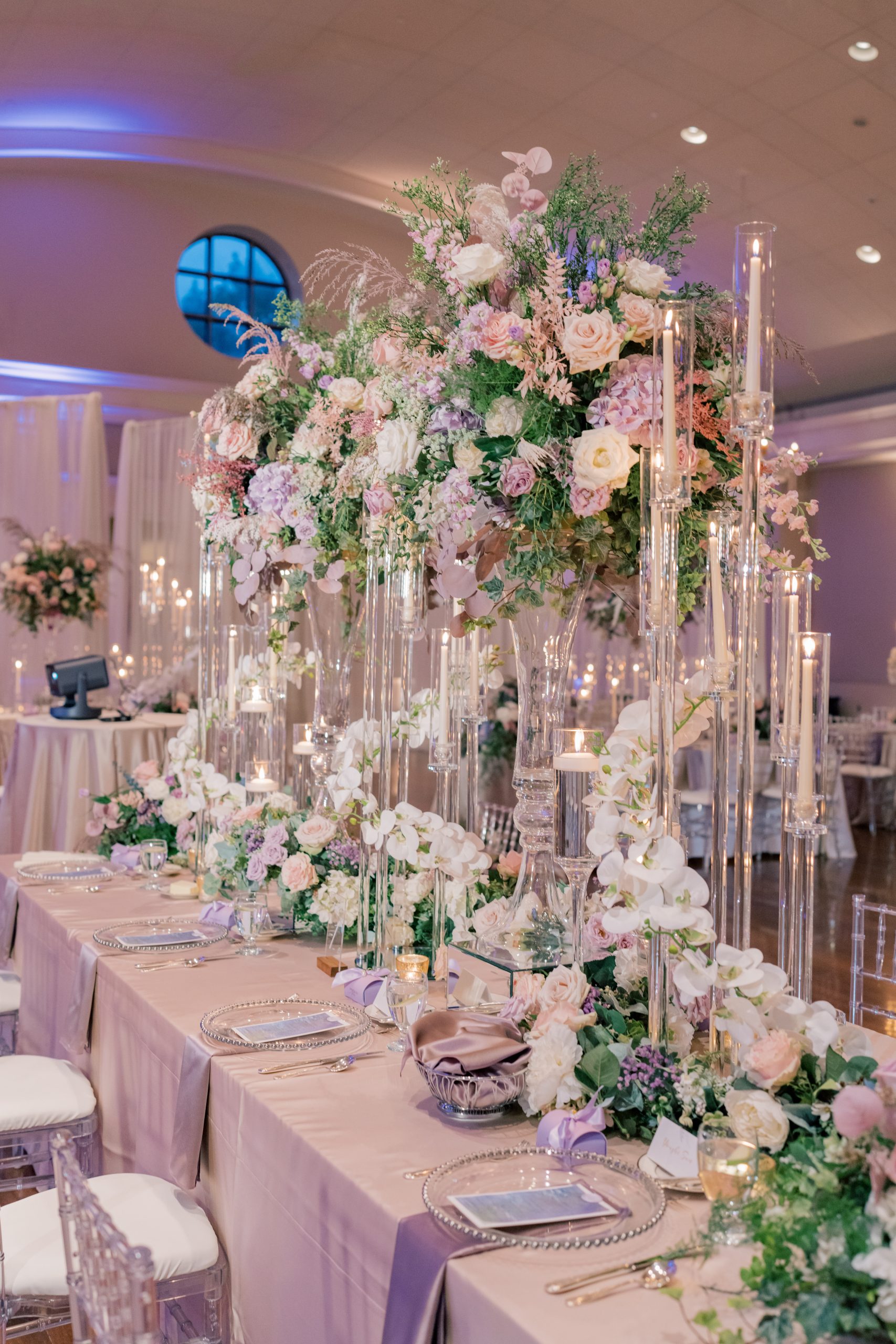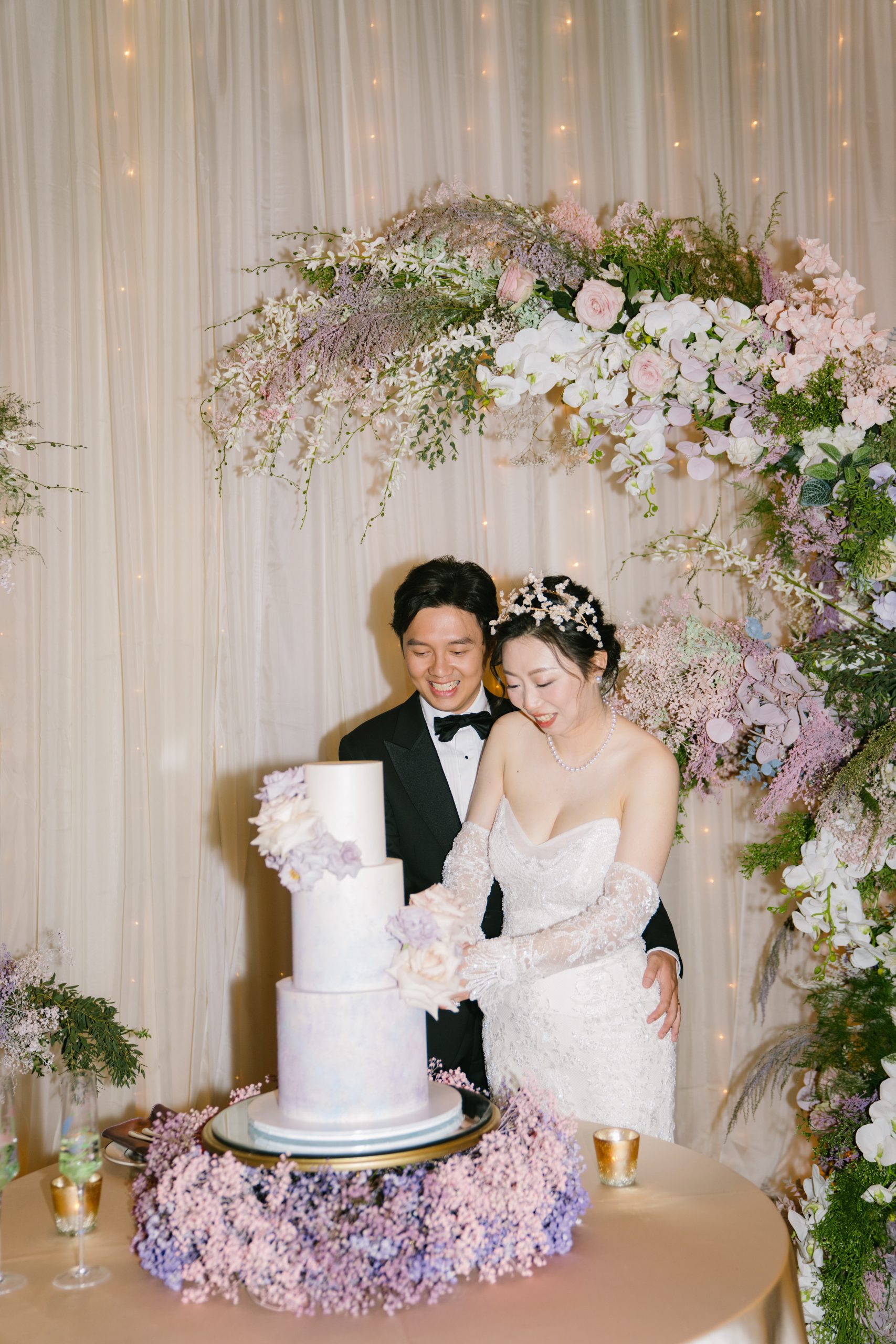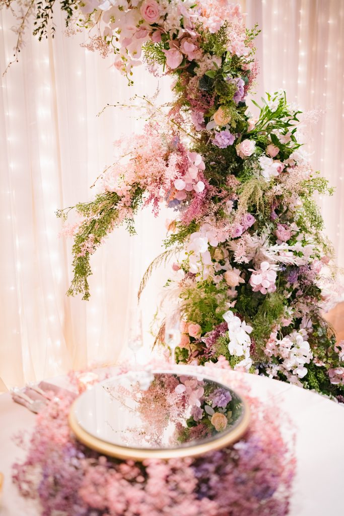 Yuxiang and Vincent’s wedding aesthetic was a love letter to Claude Monet’s dreamy impressionist landscapes. The couple was inspired by the soft, hazy beauty of Monet’s Garden, and crafted a palette of blush, lavender and romantic pastels to match. At their reception, long tables draped in blush and lavender linens stretched across the room, lined with lush arrangements of roses, orchids and hydrangeas in crystal vases. Acrylic chairs and glass accents caught the glow of candlelight, fully solidifying the magical atmosphere. From the delicate textures of the florals to the interplay of light and shadow, each detail evoked the serenity of Monet’s work.
