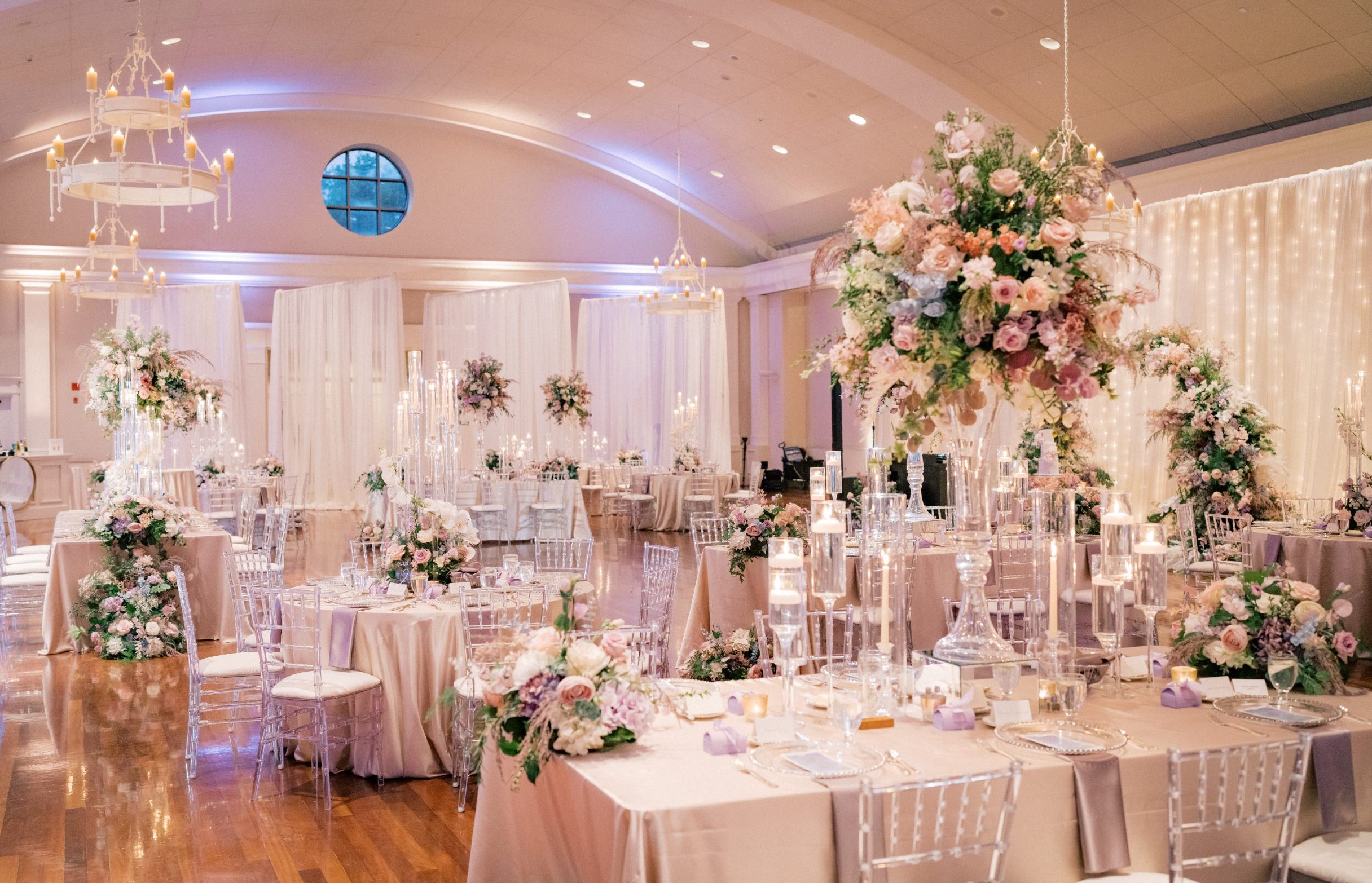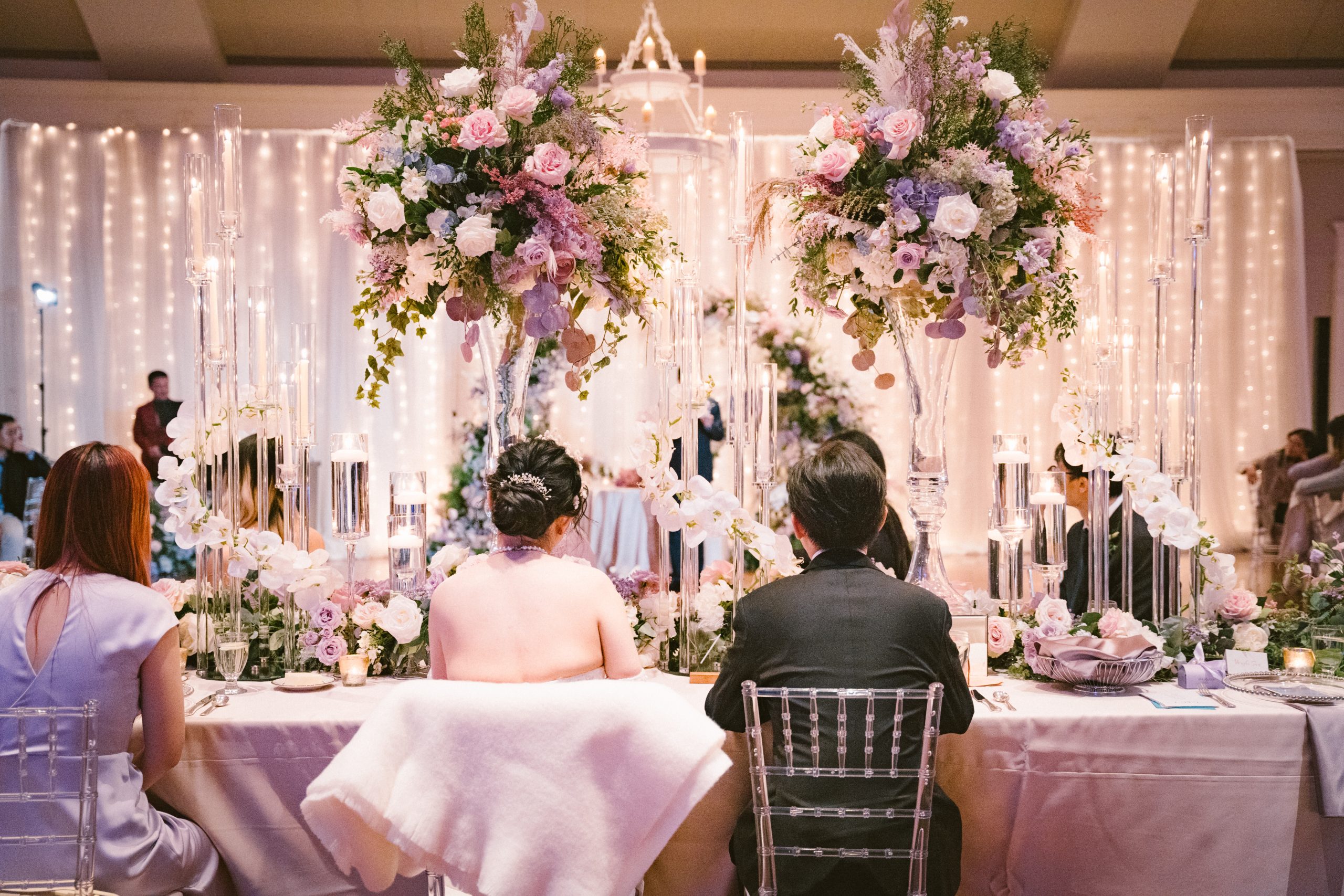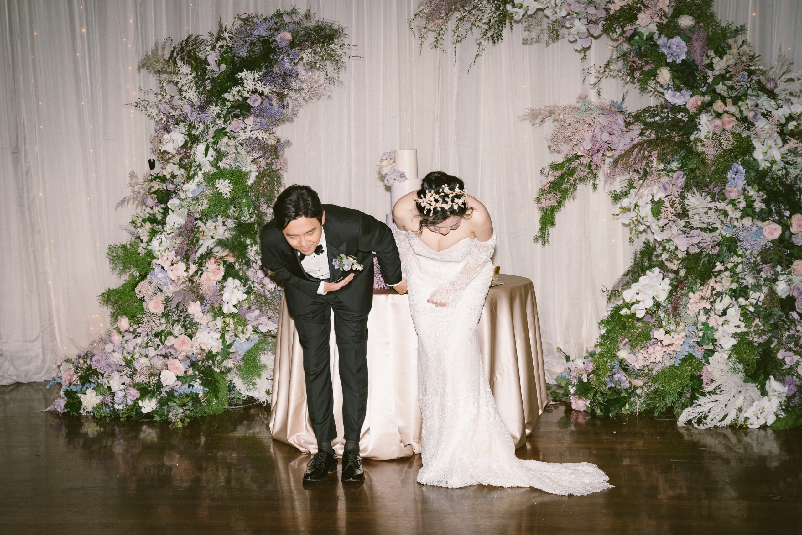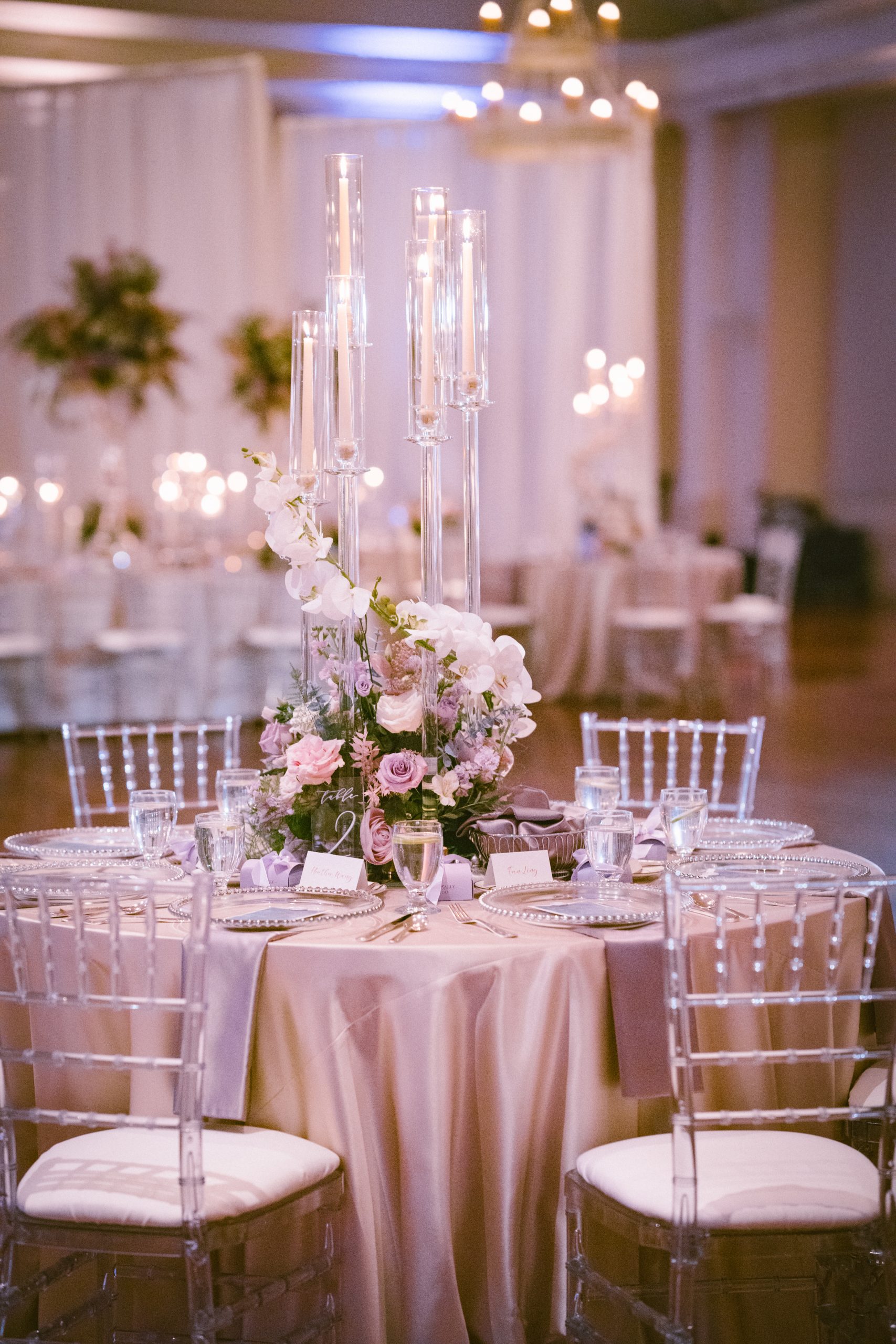 Yuxiang and Vincent’s wedding aesthetic was a love letter to Claude Monet’s dreamy impressionist landscapes. The couple was inspired by the soft, hazy beauty of Monet’s Garden, and crafted a palette of blush, lavender and romantic pastels to match. At their reception, long tables draped in blush and lavender linens stretched across the room, lined with lush arrangements of roses, orchids and hydrangeas in crystal vases. Acrylic chairs and glass accents caught the glow of candlelight, fully solidifying the magical atmosphere. From the delicate textures of the florals to the interplay of light and shadow, each detail evoked the serenity of Monet’s work.