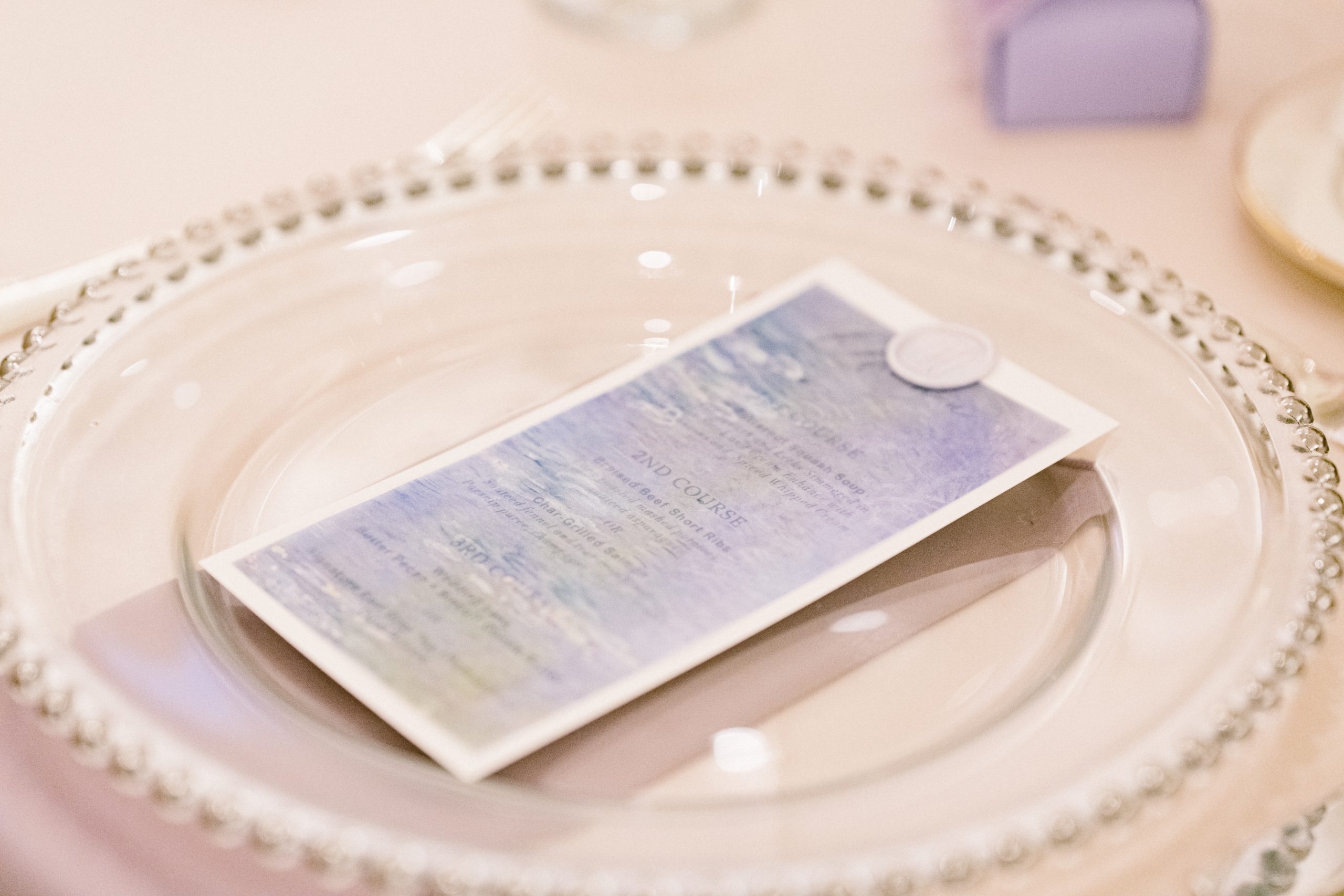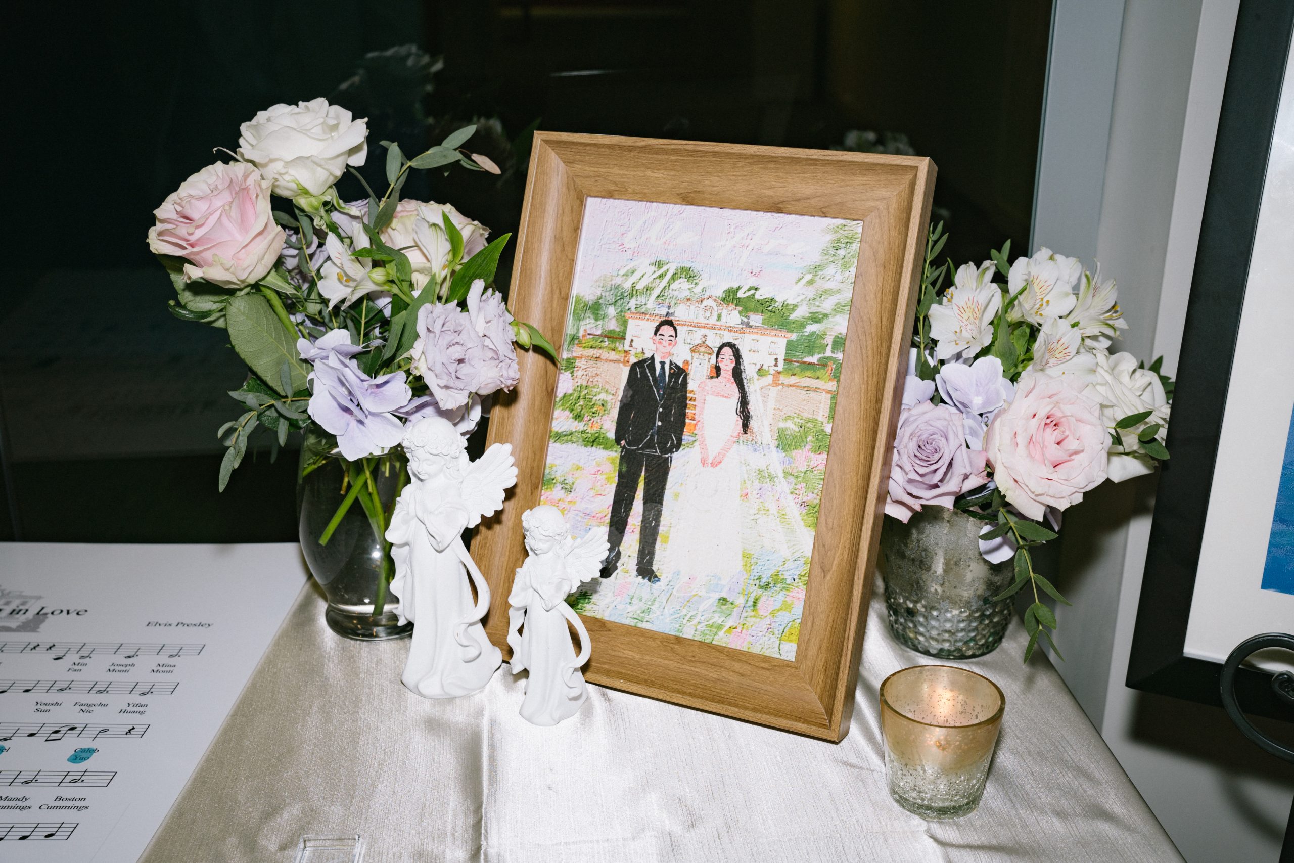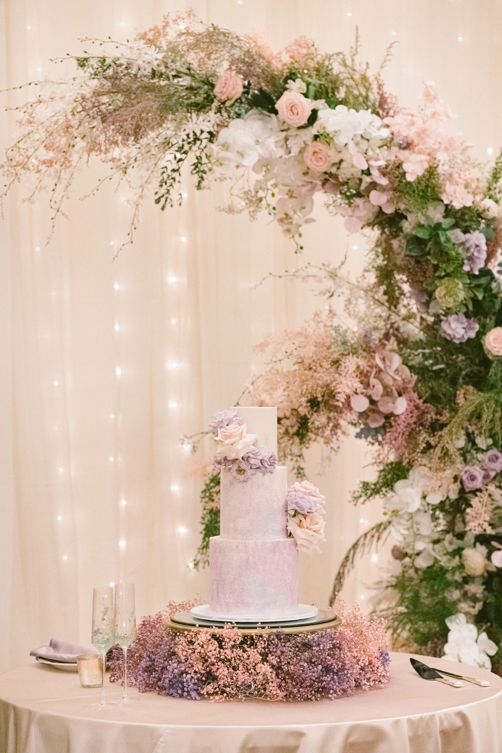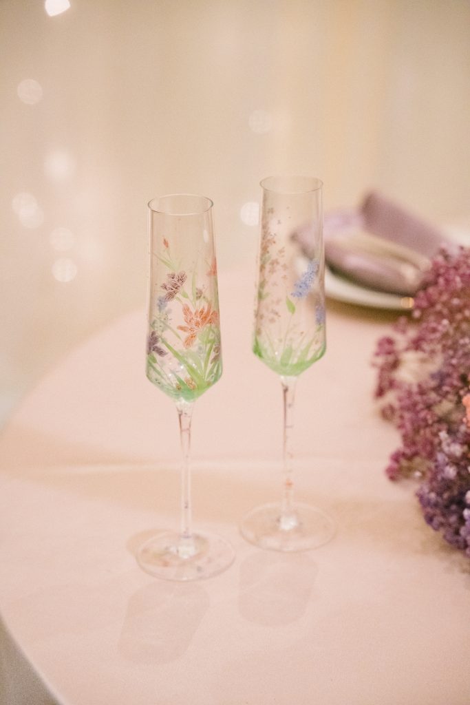 Yuxiang and Vincent’s wedding aesthetic was a love letter to Claude Monet’s dreamy impressionist landscapes. The couple was inspired by the soft, hazy beauty of Monet’s Garden, and crafted a palette of blush, lavender and romantic pastels to match. At their reception, long tables draped in blush and lavender linens stretched across the room, lined with lush arrangements of roses, orchids and hydrangeas in crystal vases. Acrylic chairs and glass accents caught the glow of candlelight, fully solidifying the magical atmosphere. From the delicate textures of the florals to the interplay of light and shadow, each detail evoked the serenity of Monet’s work.