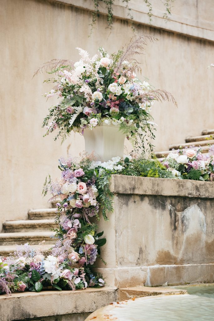The couple’s ceremony took place outdoors on the grand, iconic staircase of Swan House — one of Atlanta’s most storied venues. Soft string music by Lark Chamber Music dressed the air as guests arrived, lending an old-world romance to the outdoor setting. Further setting the scene, a cascade of florals designed by Jim White Design tumbled down the iconic stairs, framing the couple in a garden vignette.