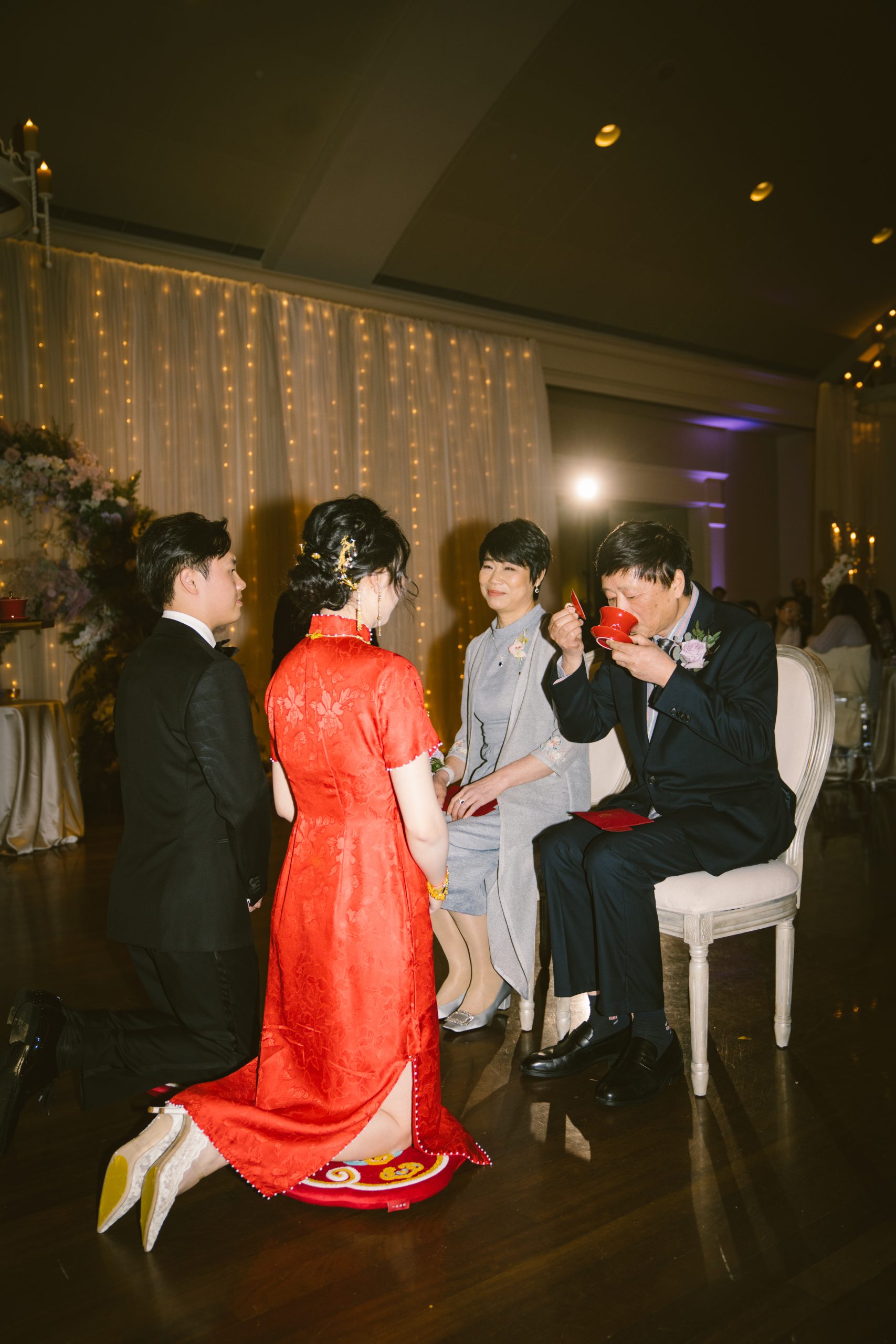One of the most meaningful moments was their traditional Chinese tea ceremony. Performed with reverence, it was a beautiful symbol of gratitude, respect and the blending of traditions with their new life together in the United States. Alongside their ceremony vows spoken in Chinese, it created a celebration that both culturally rich and visually stunning.